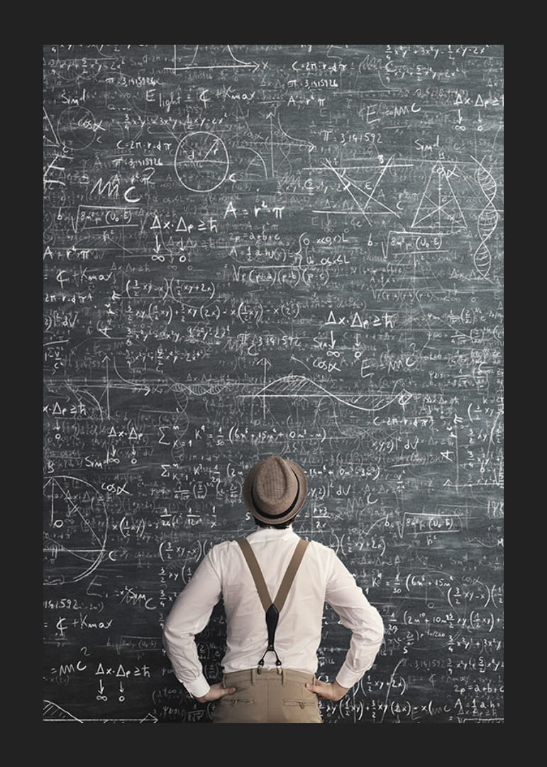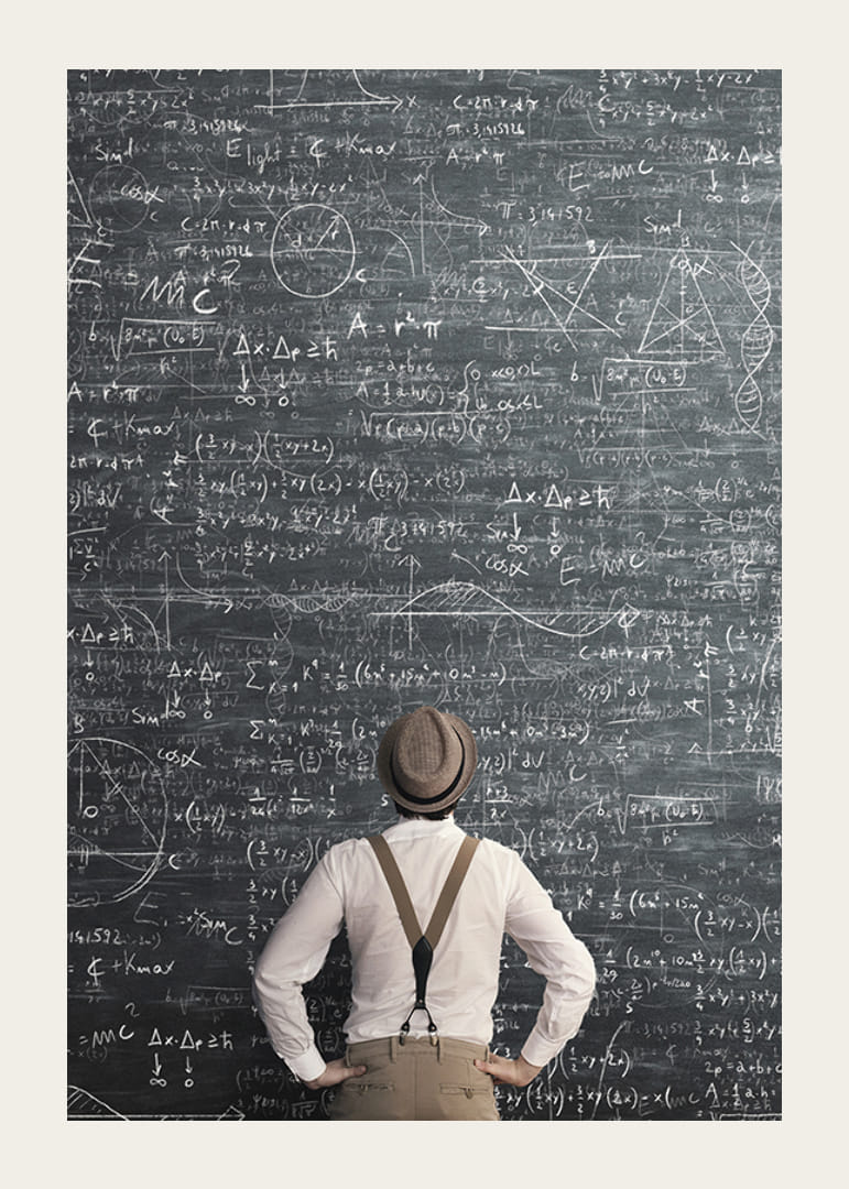 En man med skjorta, hängslen och hatt står vänd mot en väggtäckande griffeltavla fylld med matematiska formler, ekvationer och diagram. Den svartvita färgskalan och det analytiska motivet ger ett tankeväckande intryck. Den här postern passar bra i arbetsrum, kontor eller kreativa miljöer där inspiration och intellekt lyfts fram.