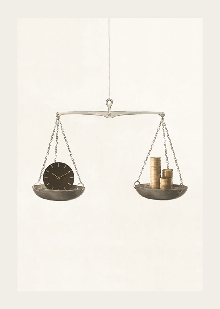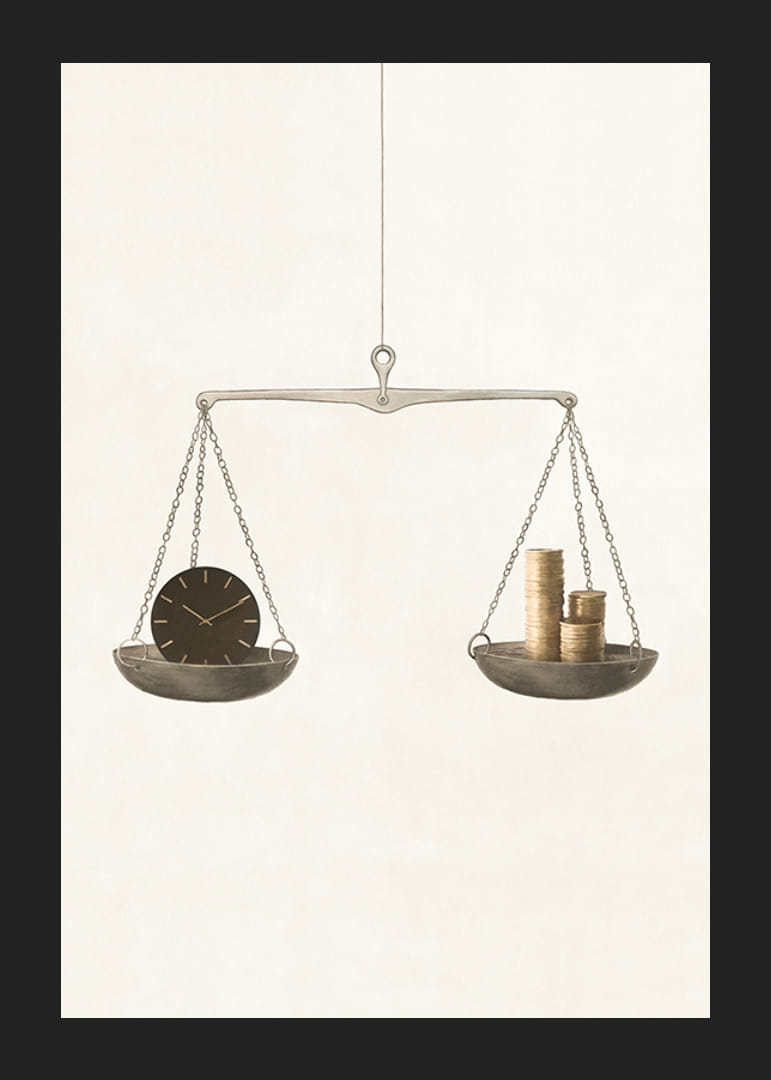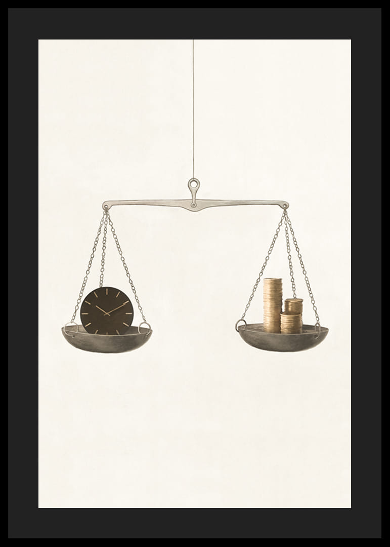 En klassisk balansvåg hänger fritt mot en ljus, beige bakgrund. På den ena sidan ligger en mörk klocka och på den andra staplar med guldfärgade mynt. Motivet kombinerar stilren enkelhet med symbolik kring val mellan tid och pengar. Denna poster passar i både arbetsrum och vardagsrum.