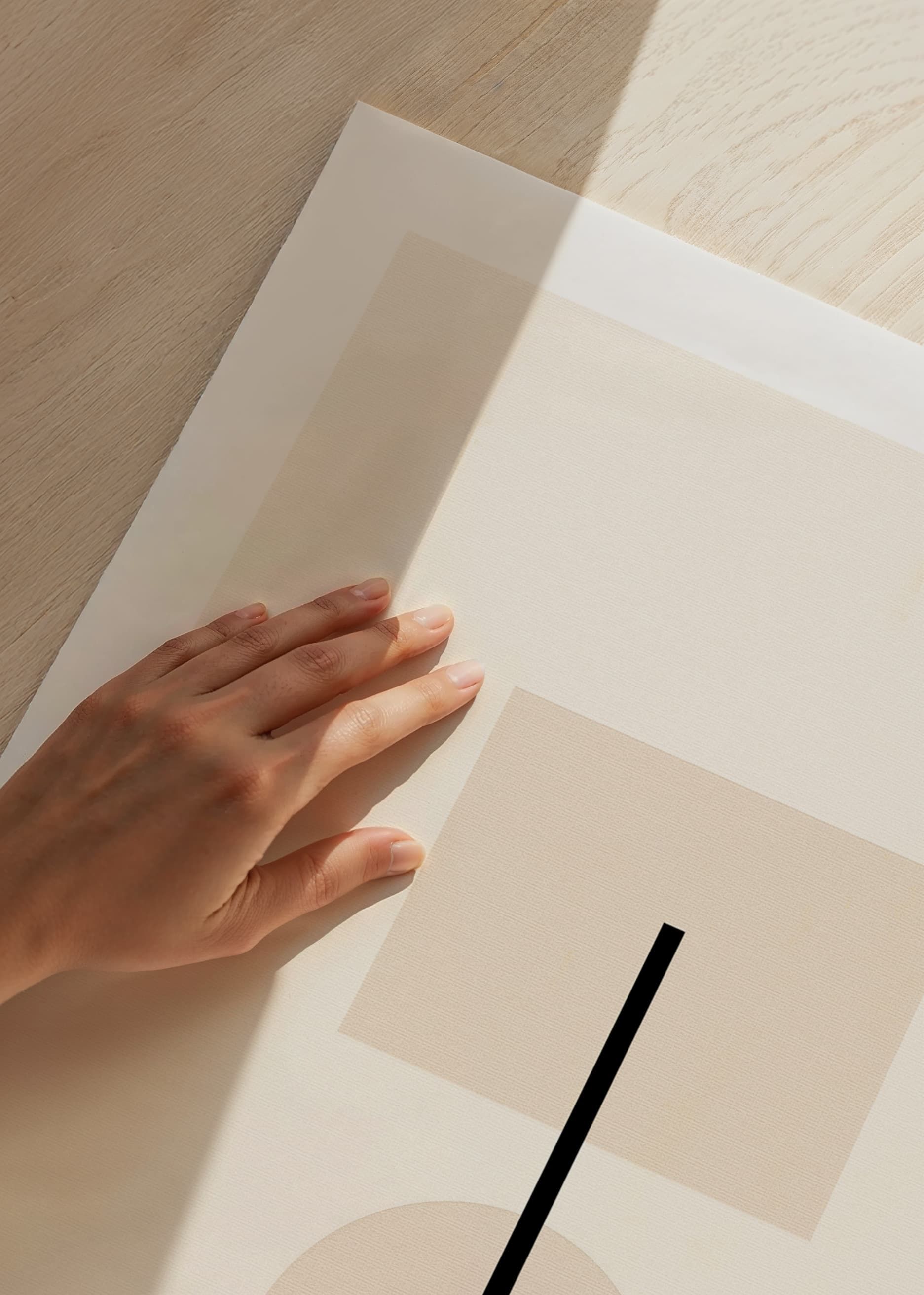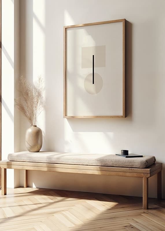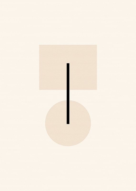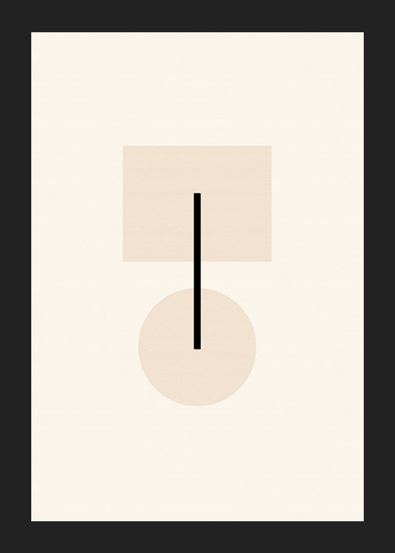 Motivet består av en beige fyrkant och en cirkel som förenas av en tunn, svart vertikal linje. Enkelheten och de mjuka tonerna skapar en modern känsla med grafisk tydlighet. Denna poster passar bra i minimalistiska miljöer där ett subtilt och rent uttryck eftersträvas.