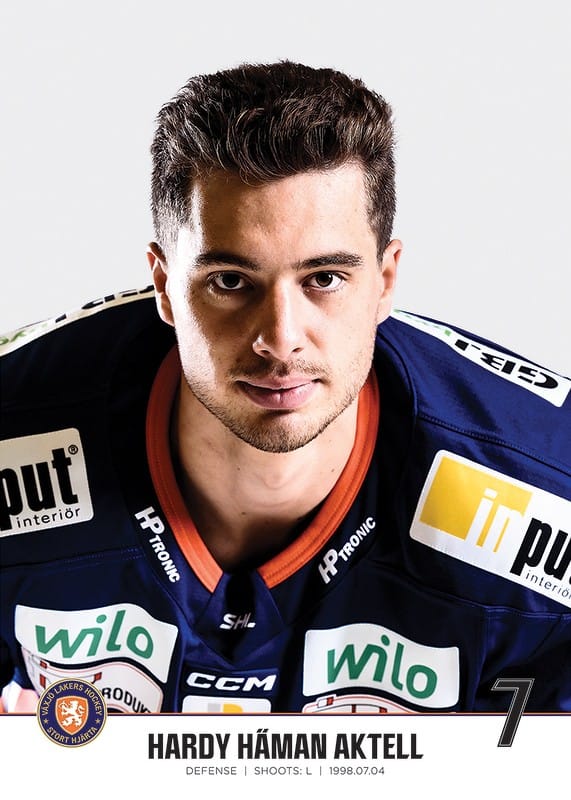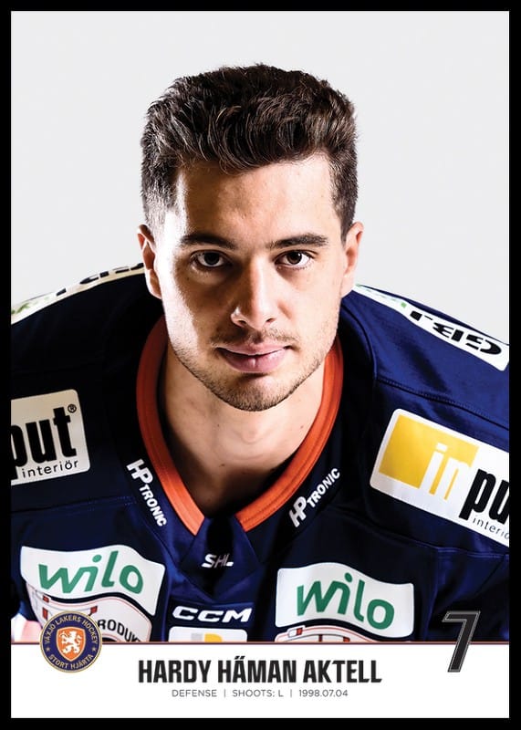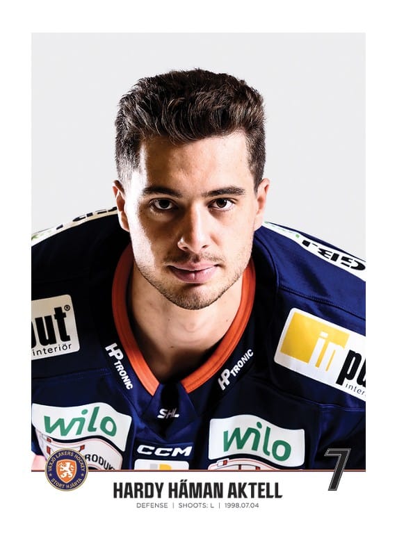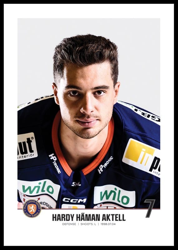 Poster med spelarbild på Växjö Lakers back Hardy Häman Aktell med tröjnummer 7 från säsongen 2022/2023.