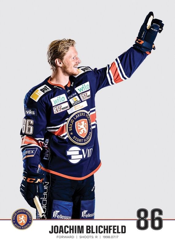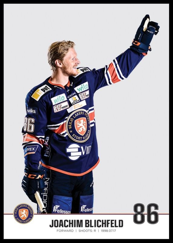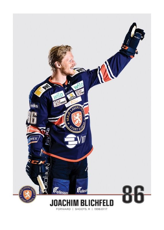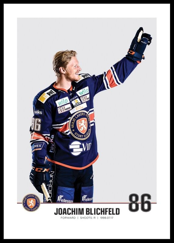 Poster med spelarbild på Växjö Lakers forward Joachim Blichfeld med tröjnummer 86 från säsongen 2022/2023.