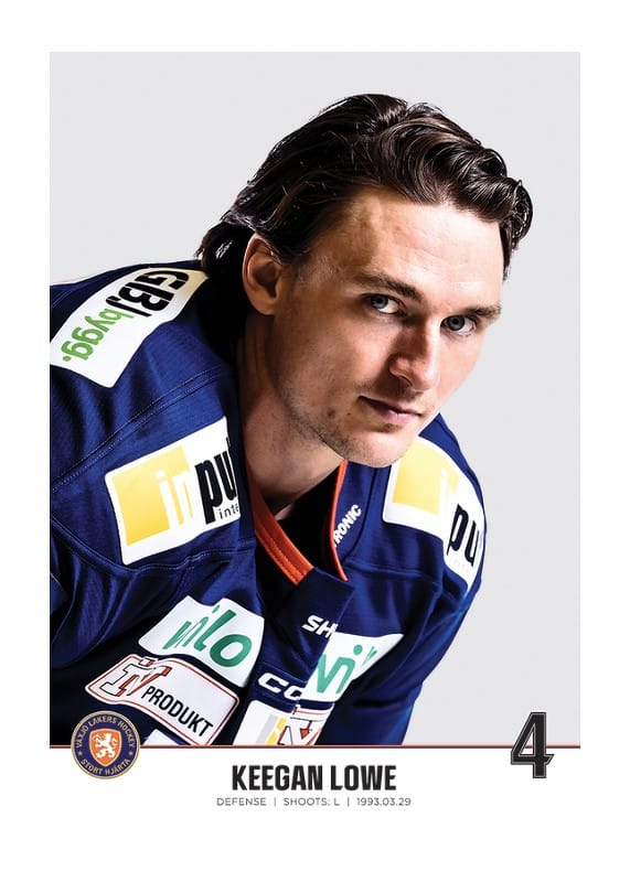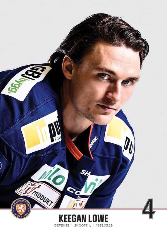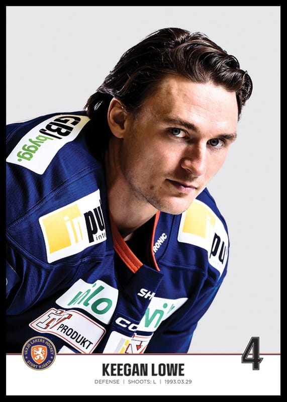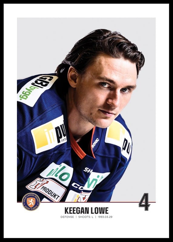 Poster med spelarbild på Växjö Lakers back Keegan Lowe med tröjnummer 4 från säsongen 2022/2023.