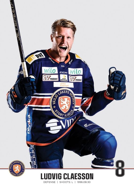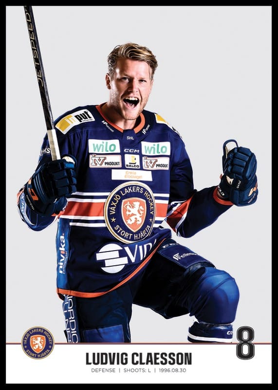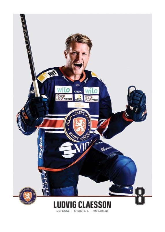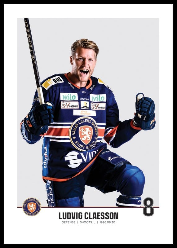 Poster med spelarbild på Växjö Lakers back Ludvig Claesson med tröjnummer 8 från säsongen 2022/2023.