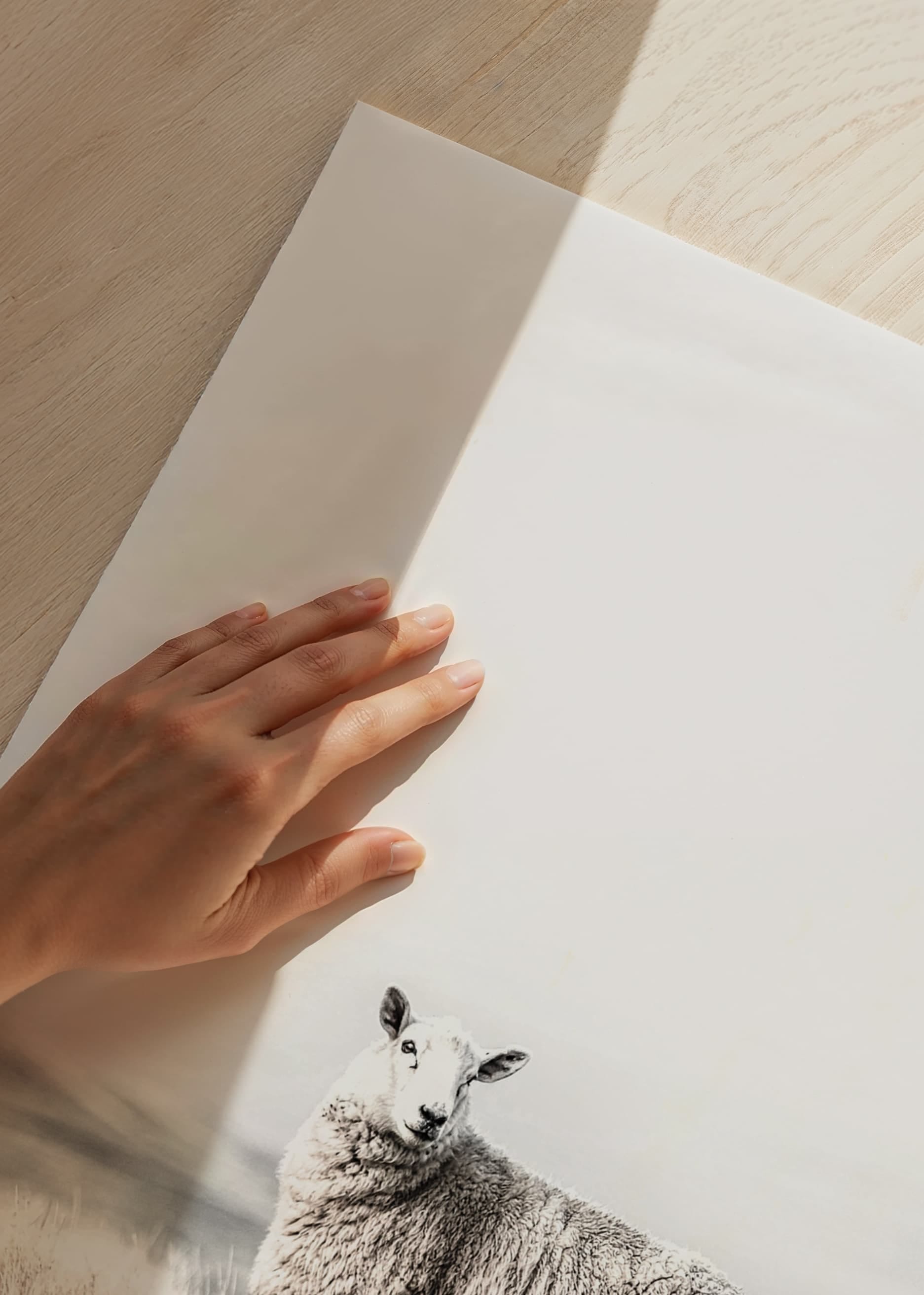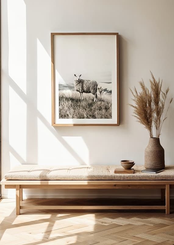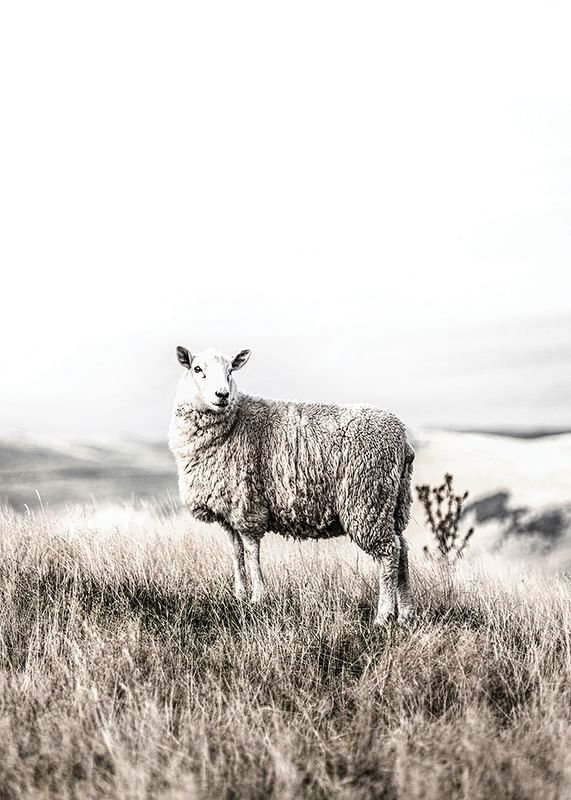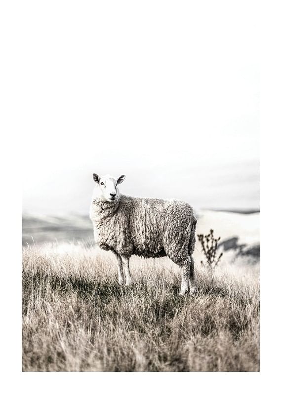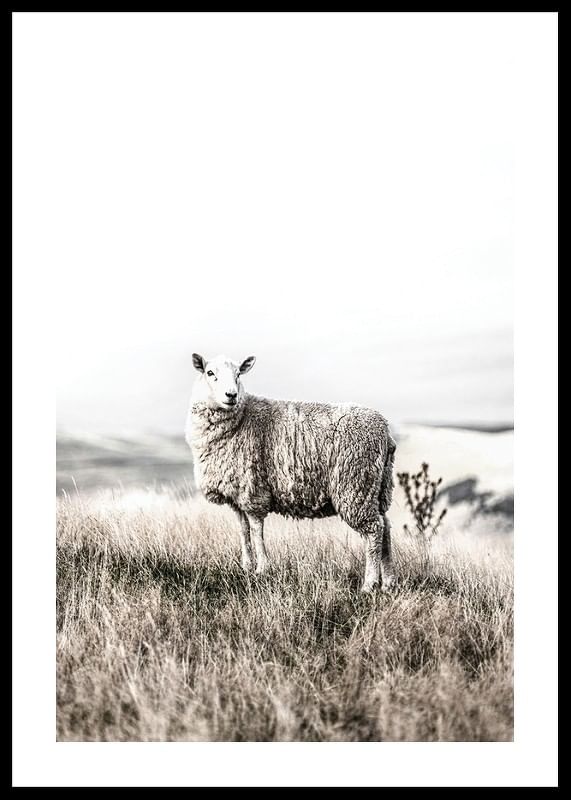 Ensamt vitt får står i högt, beigefärgat gräs med vy över ett vidsträckt landskap i bakgrunden. Det subtila ljuset och de dämpade färgtonerna ger motivet en lugn och avskalad känsla. Denna poster passar lika bra i moderna som lantliga miljöer och förmedlar en känsla av naturens stillhet och enkelhet.