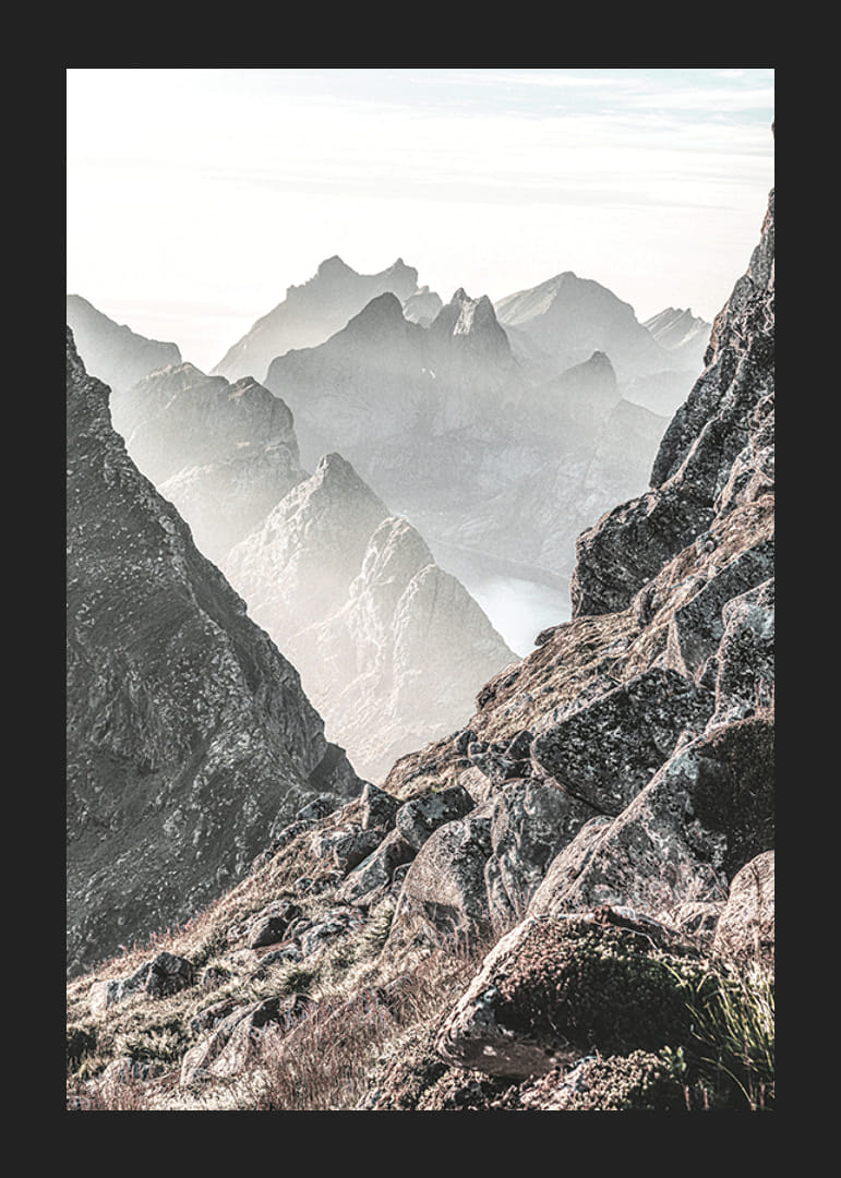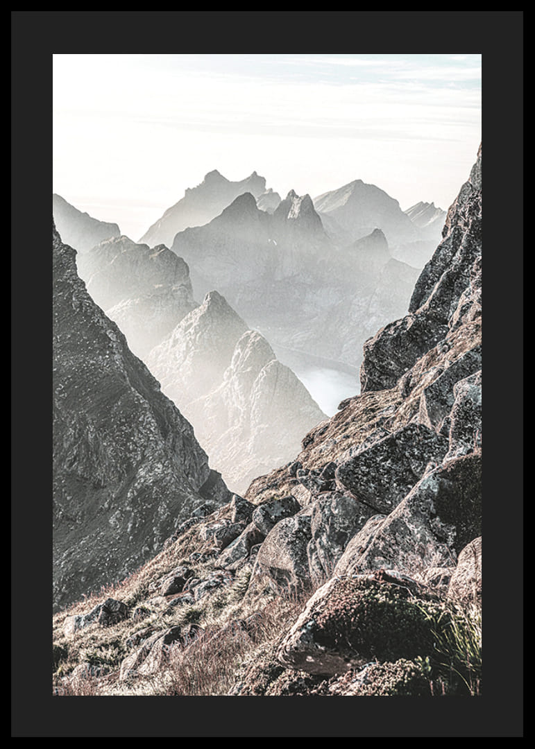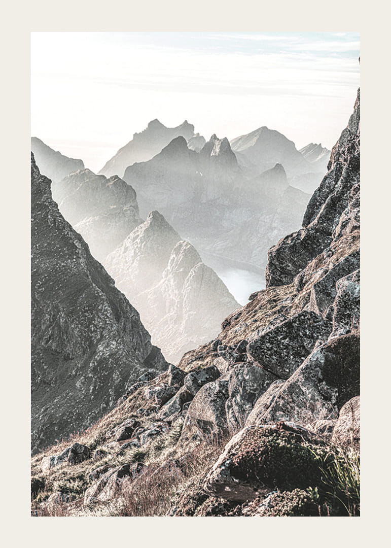 Steniga fjälltoppar sträcker sig mot horisonten med tunna lager av dimma som sveper mellan bergen. Kalla grå och bruna nyanser dominerar, medan det mjuka ljuset skapar djup och ett subtilt skuggspel. Den här postern ger rummet en naturlig känsla av rymd och stillhet, särskilt i vardagsrum eller arbetsmiljöer.