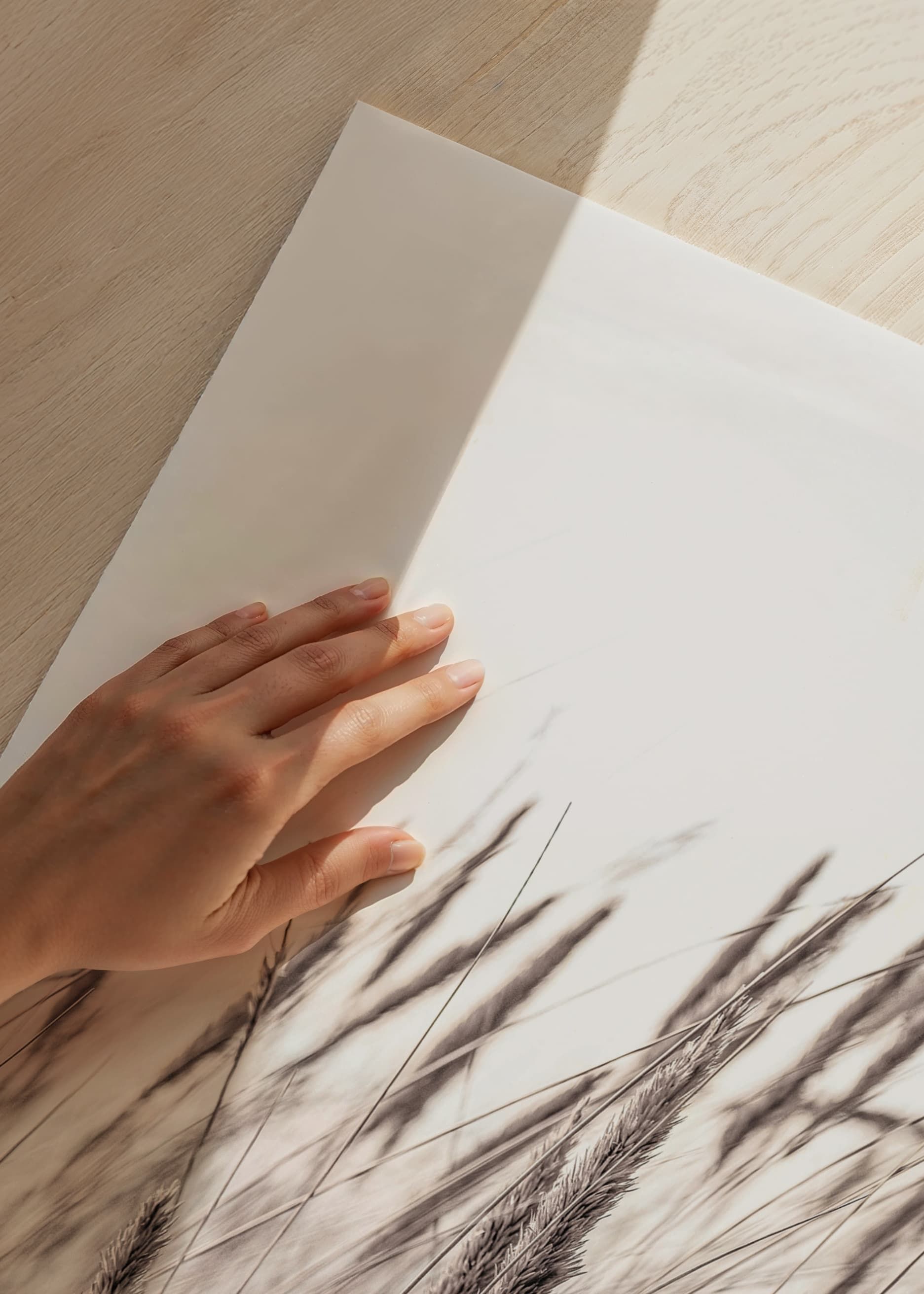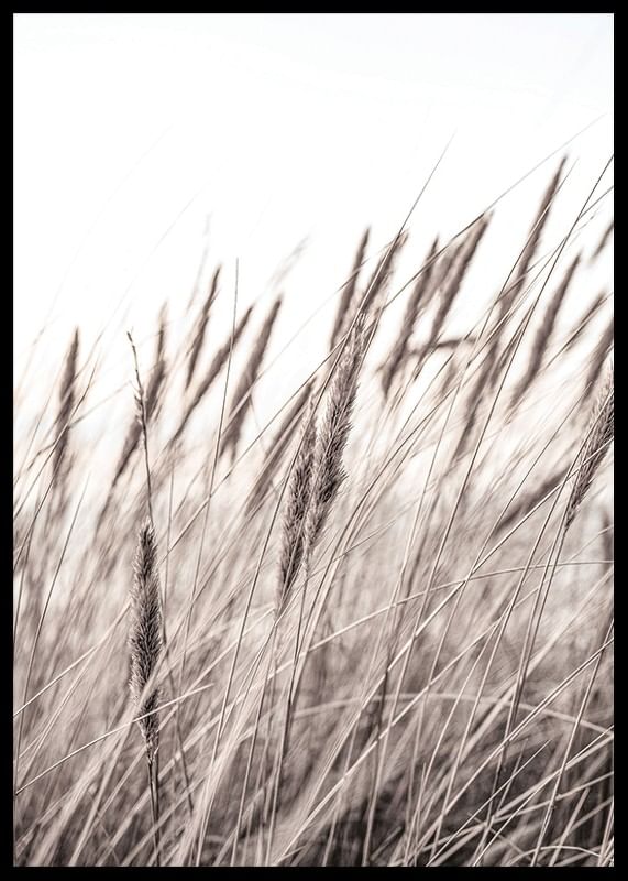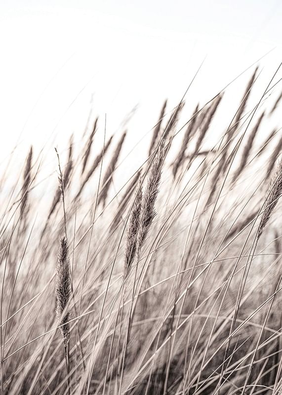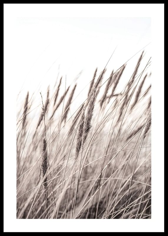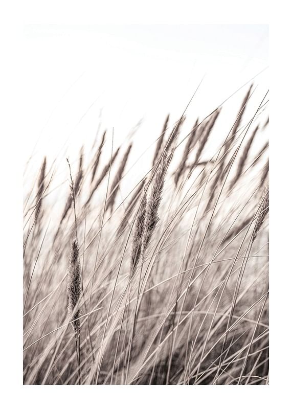 Närbild av vildvuxna torkade grässtrån som sträcker sig mjukt mot en ljus bakgrund. Neutrala beige och bruna nyanser ger en naturlig känsla till motivet. Den tidlösa och diskreta stilen gör postern lättplacerad i både sovrum och vardagsrum där en stillsam atmosfär önskas.