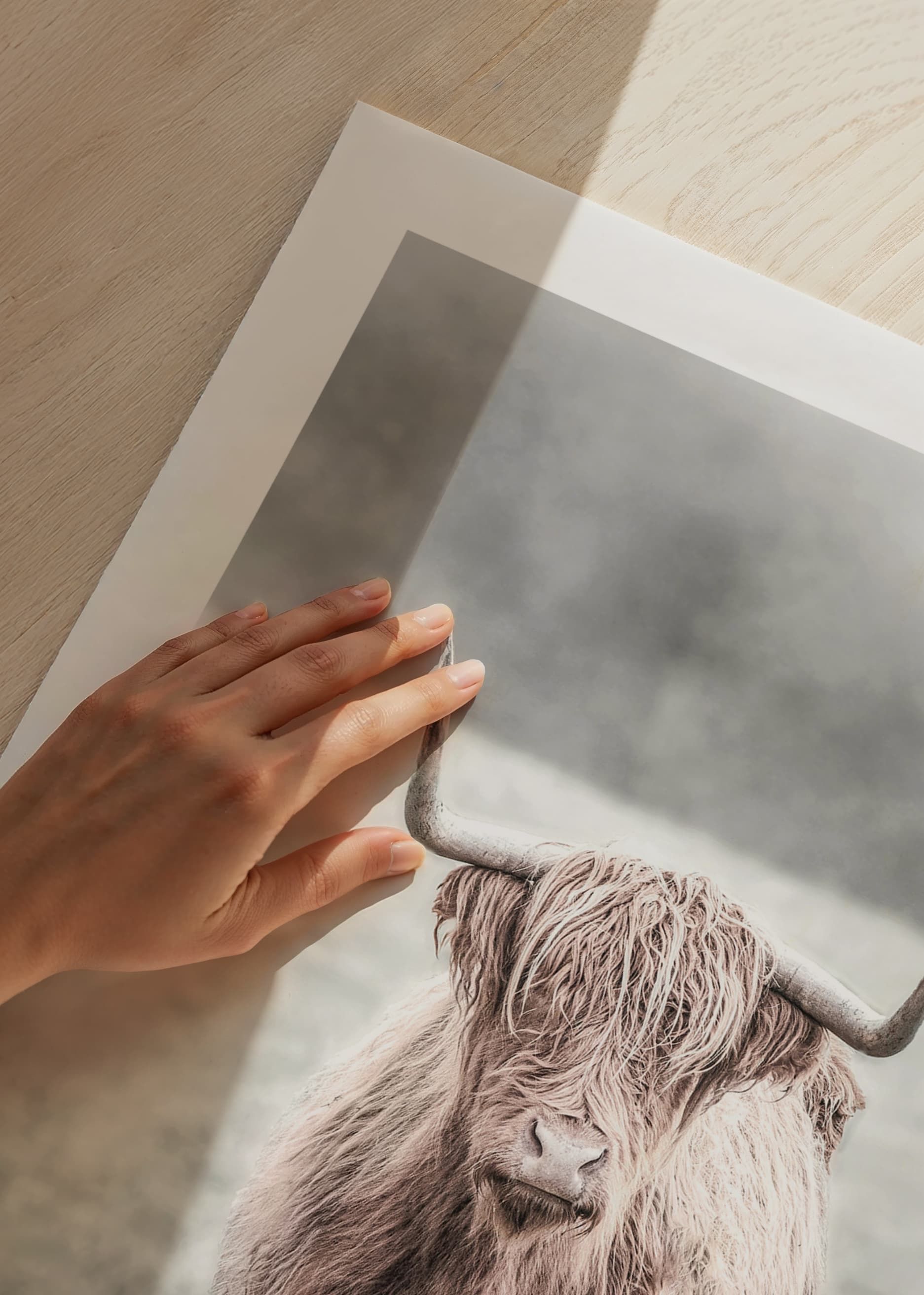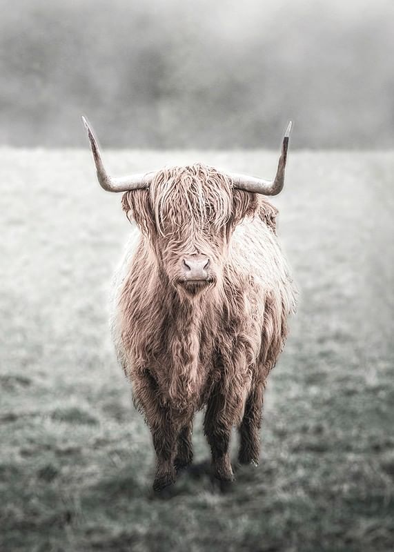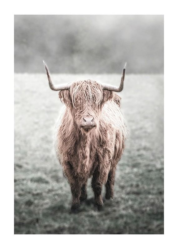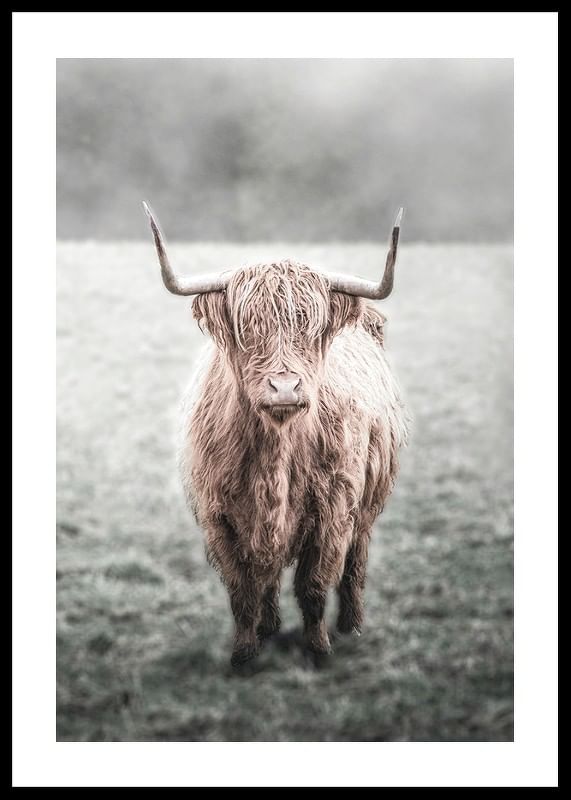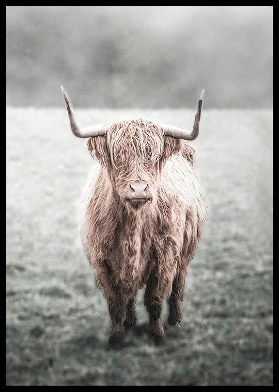 Närbild av en skotsk highland-ko med lång, vågig päls och kraftiga horn. Kon står på en dimmig äng med mjukt suddig bakgrund och dova, jordnära färger. Den här postern ger en naturlig känsla som passar utmärkt både i moderna och lantliga inredningsmiljöer.