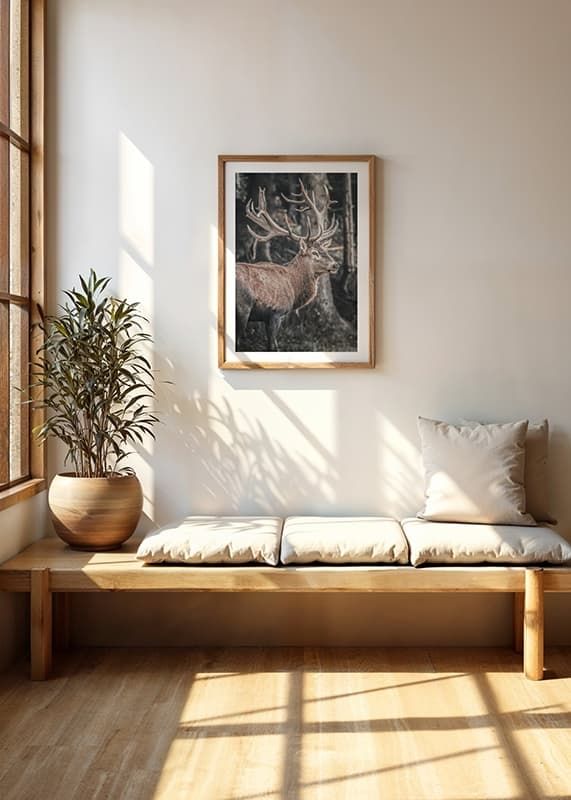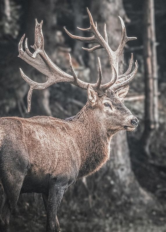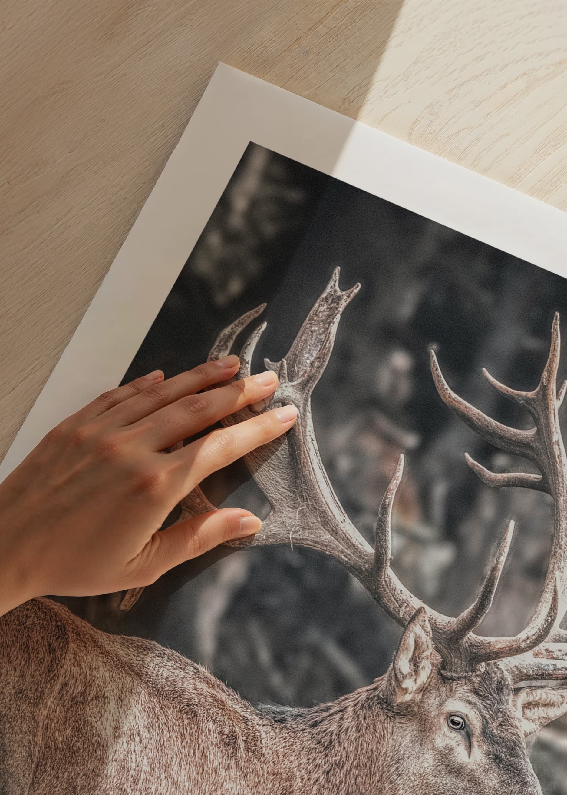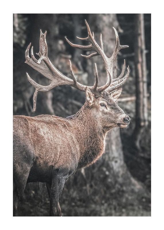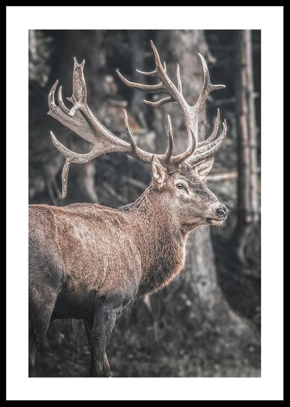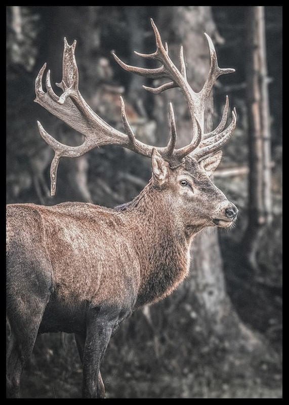En kraftfull kronhjort med imponerande horn står vänd mot kameran och framträder tydligt mot en dunkel, något oskarp skogsbakgrund. De naturnära bruna och grå tonerna ger en tidlös känsla som passar väl i många hem. Denna poster blir ett givande inslag i vardagsrum eller arbetsrum med naturnära tema.