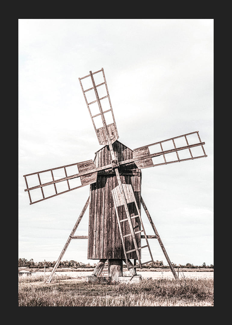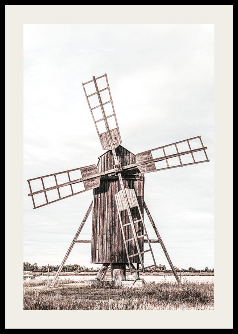 Gammal väderkvarn i trä står ensam på ett öppet fält under en ljus himmel, fångad i ljusa, dämpade toner. Träets ådring och den rustika konstruktionen syns tydligt i denna poster med landskapsmotiv. Naturkänslan gör postern särskilt passande i vardagsrum eller arbetsrum för en tidlös och naturnära inramning.