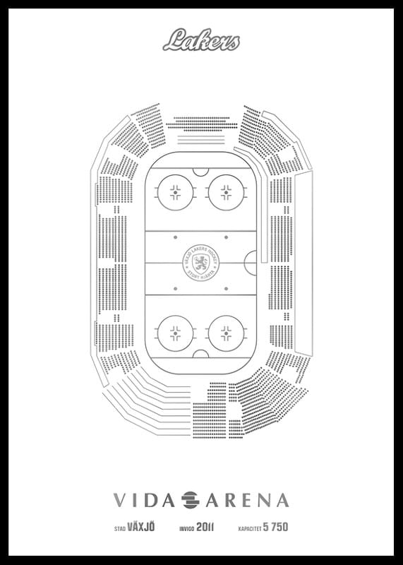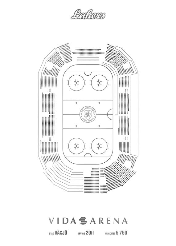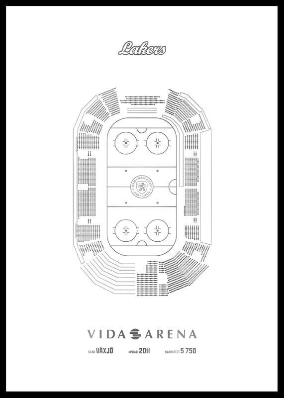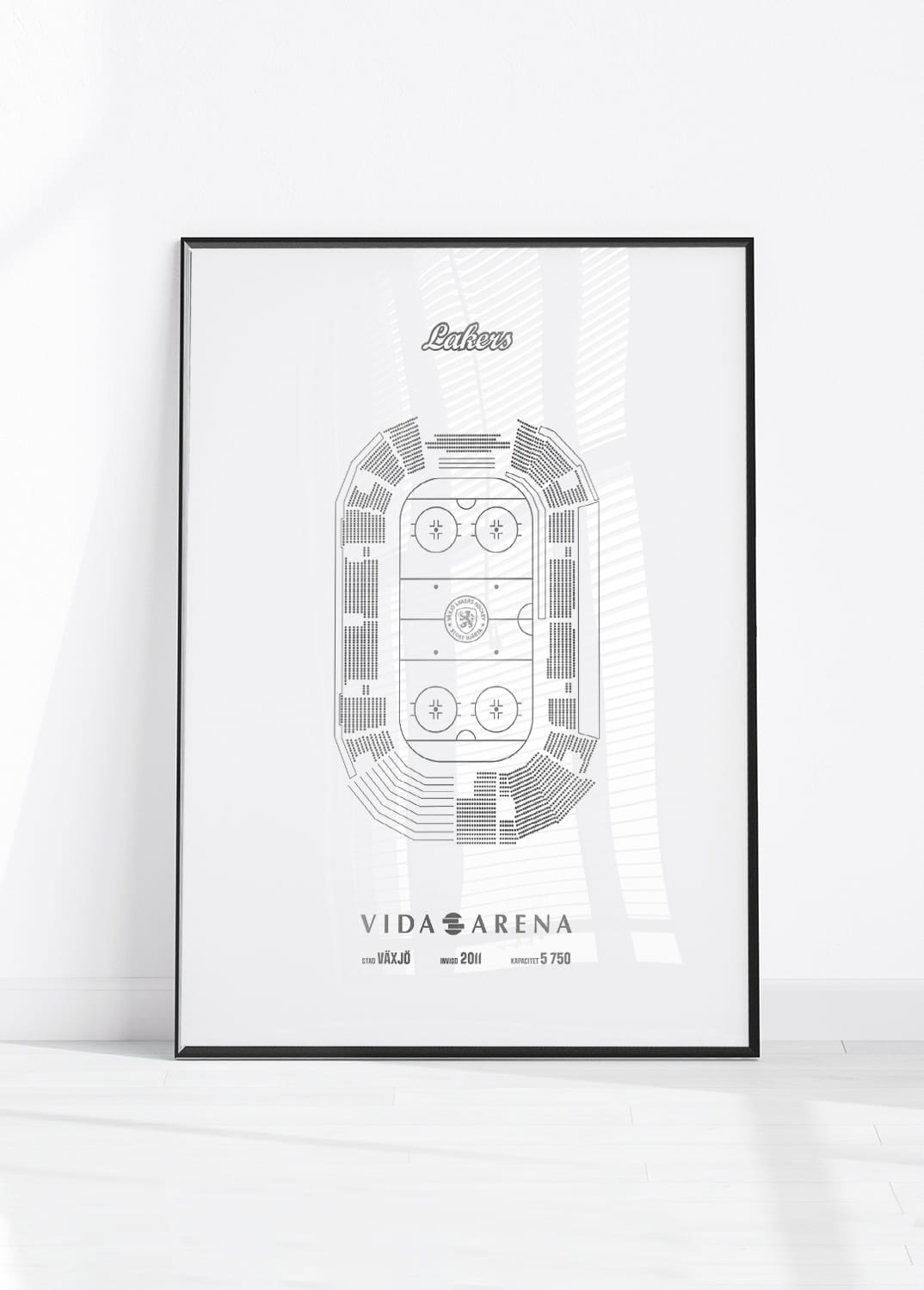 Poster med skiss av Växjö Lakers hemmaarena Vida Arena mot en vit bakgrund.