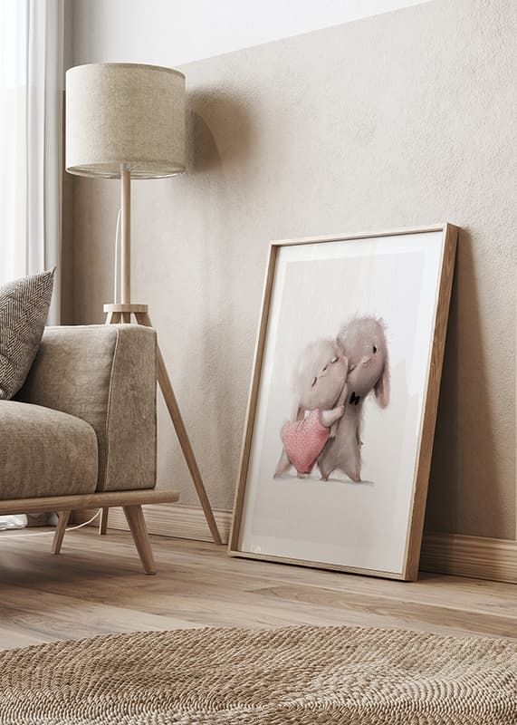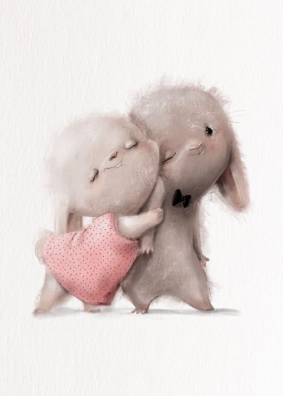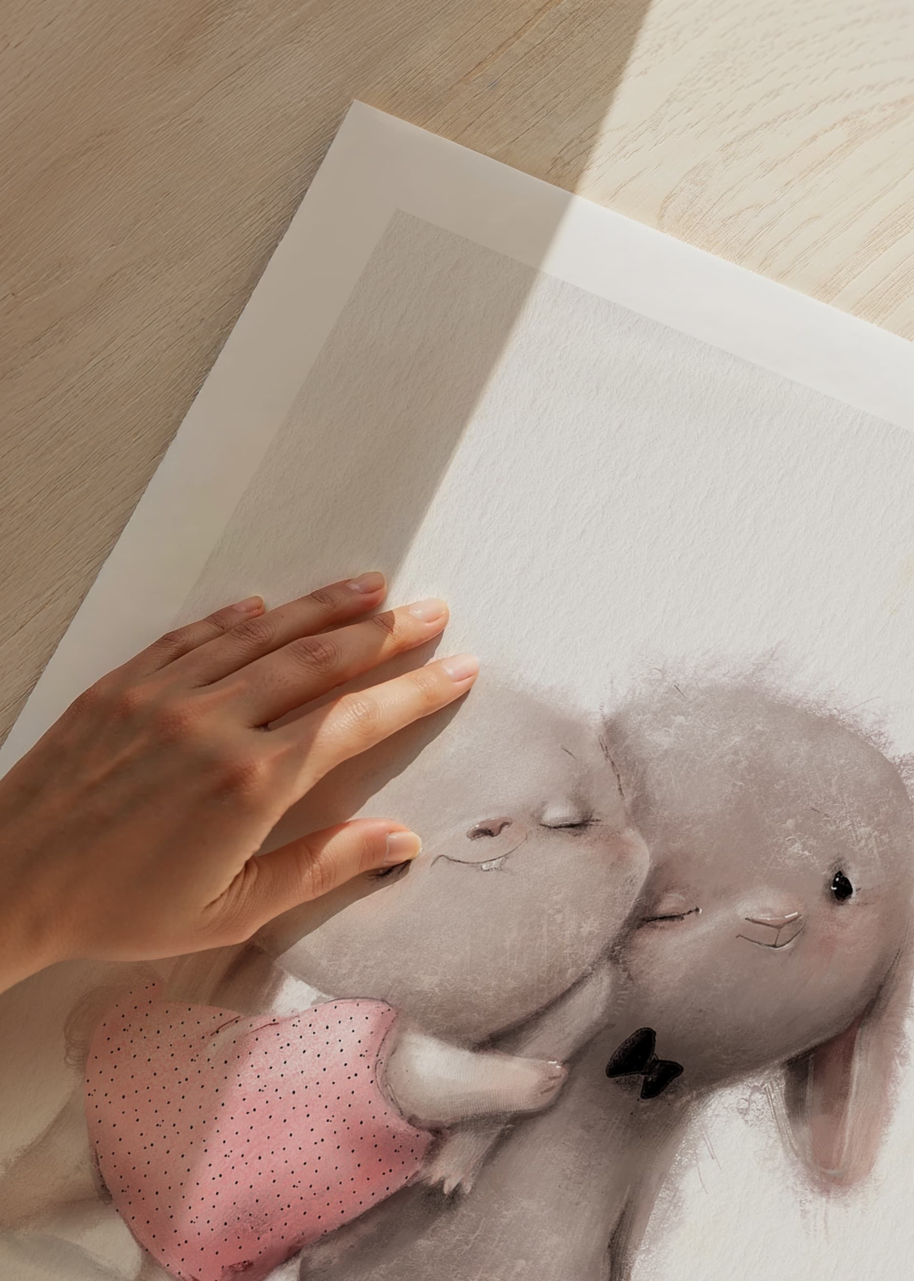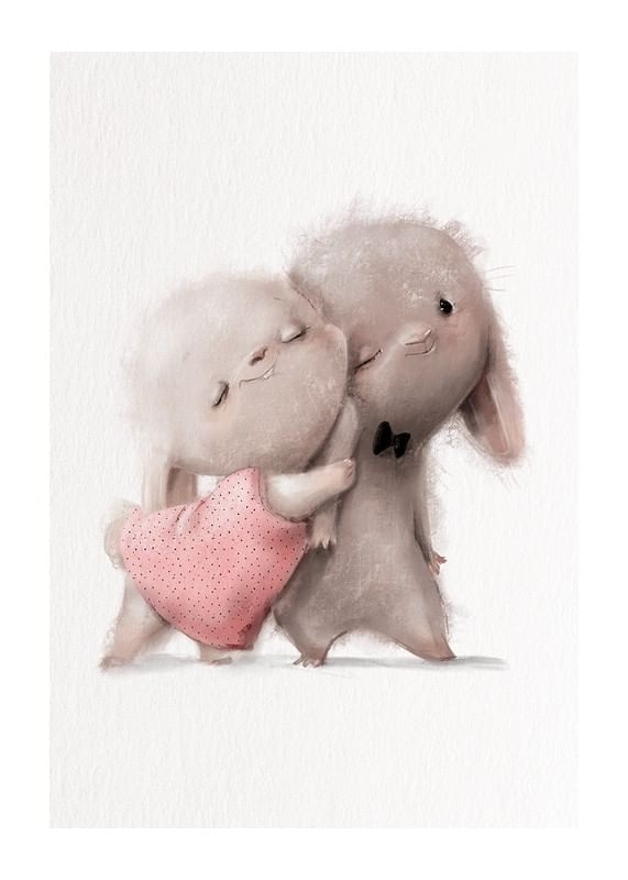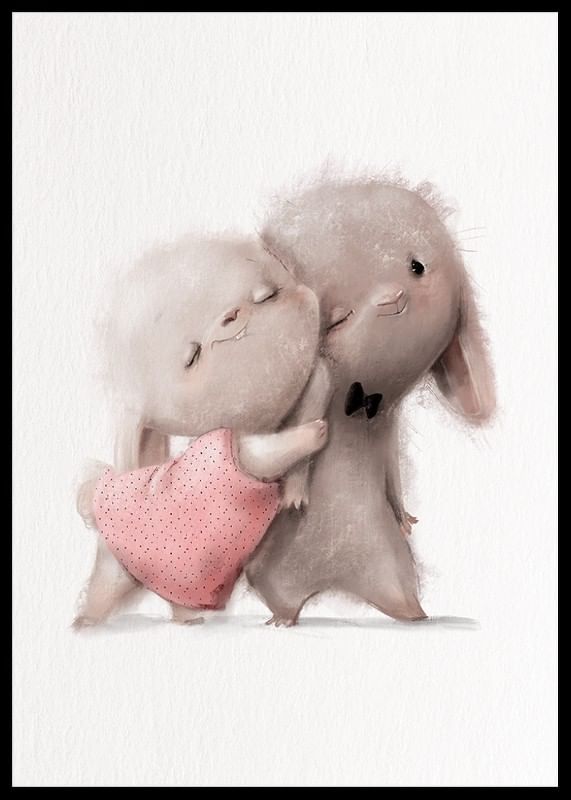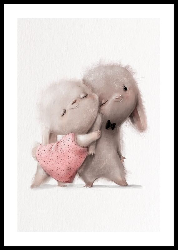 Två kaniner i mjuka pastellfärger står mot en vit bakgrund, omfamnande varandra. Den ena har en rosa klänning med små prickar, den andra en liten svart fluga. Motivet ger ett varmt intryck och passar särskilt bra i barnrum. Den här postern bidrar till en vänlig och inbjudande atmosfär.