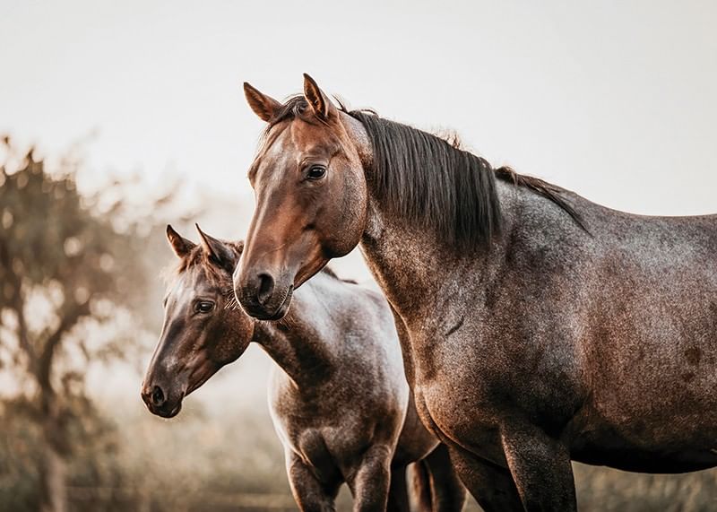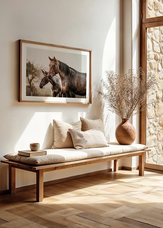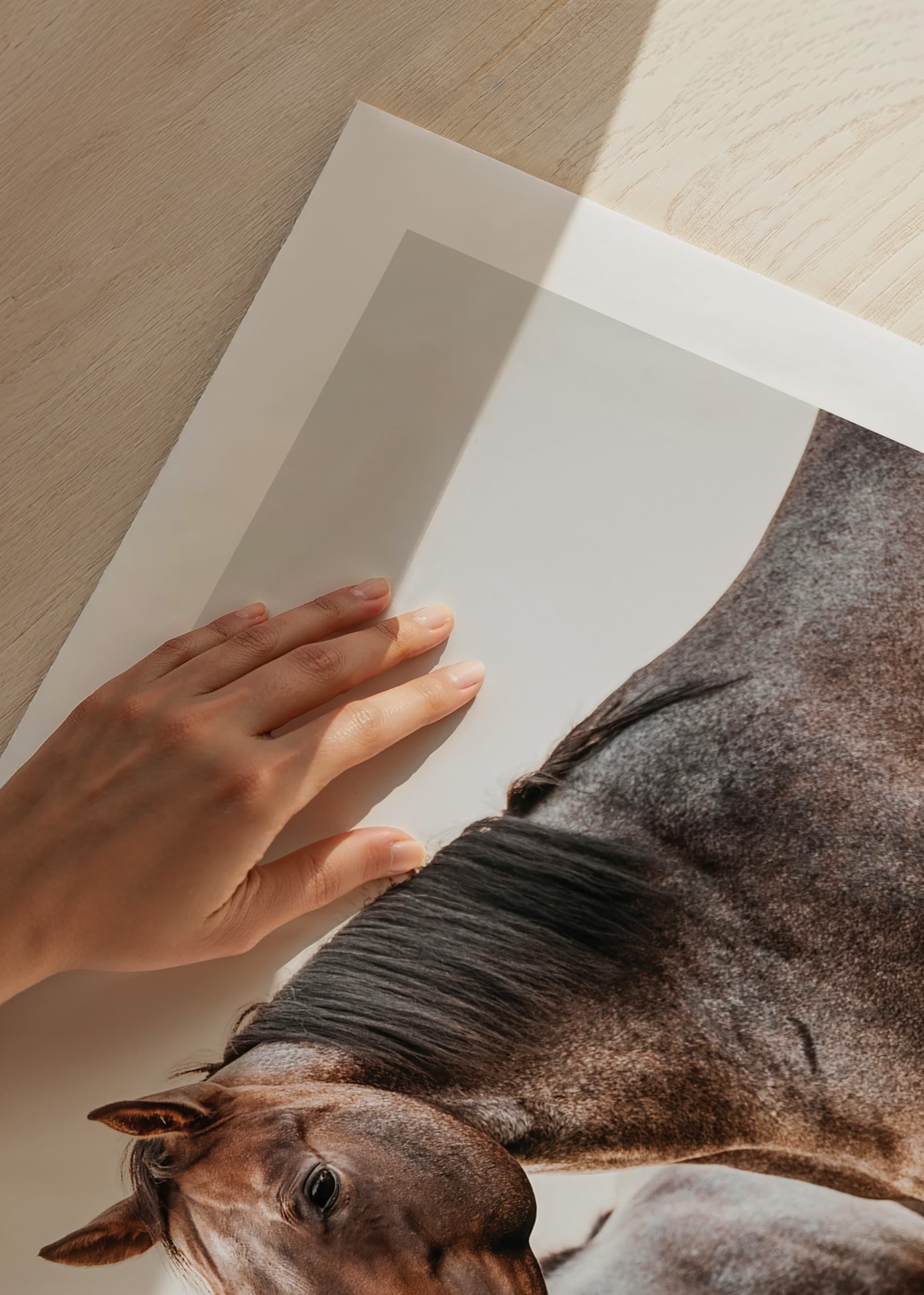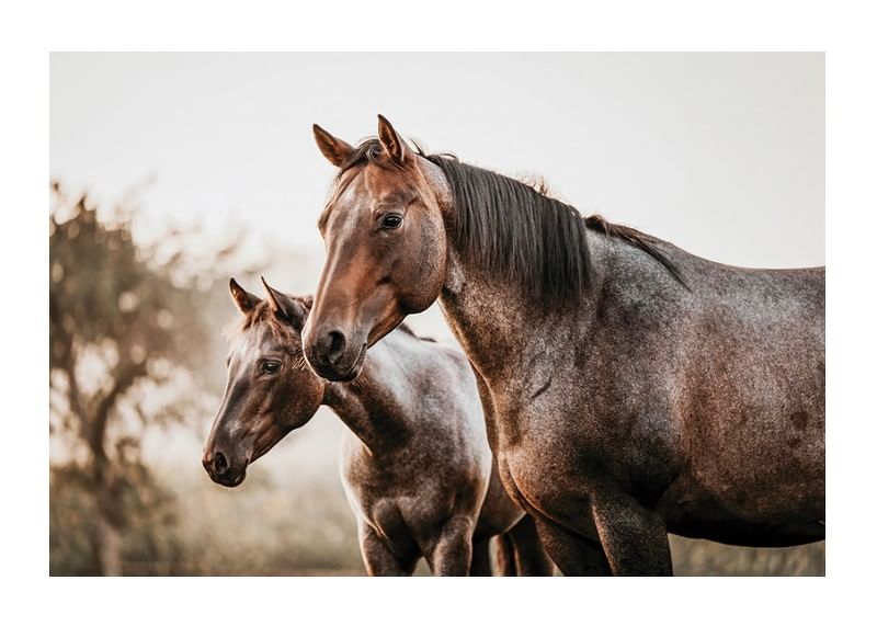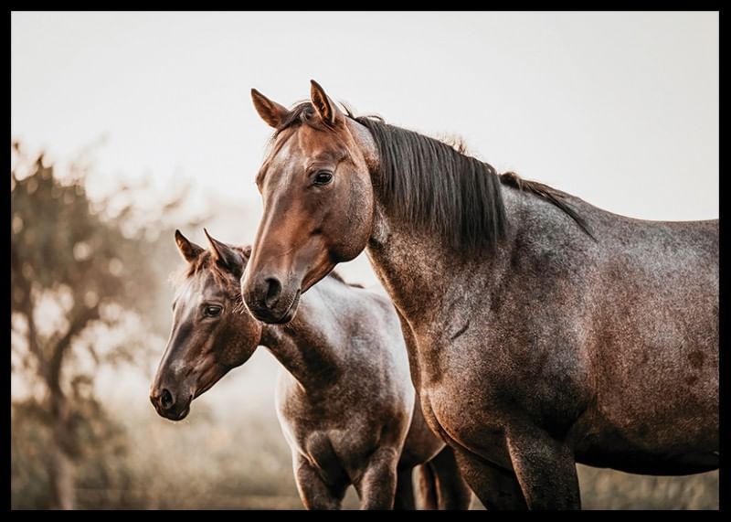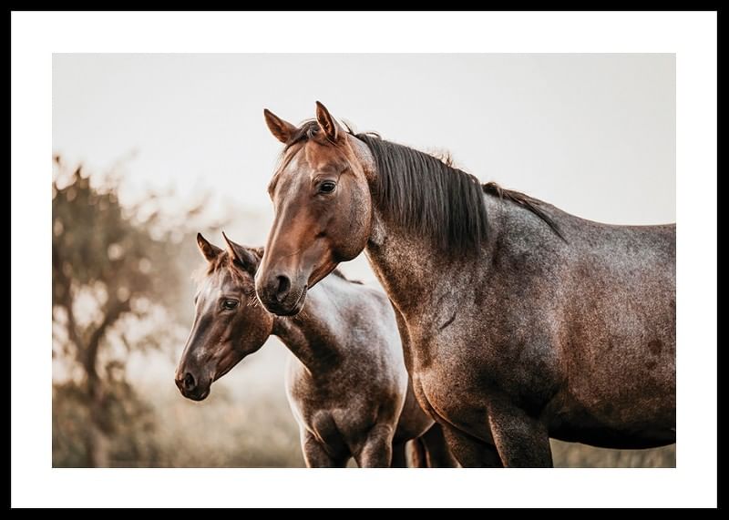 Två bruna hästar i närbild står sida vid sida med uppmärksamma uttryck. Pälsens varma toner framhävs av det mjuka ljuset och skapar ett naturligt samspel med den diffusa bakgrunden i beige och grönt. Med sitt djurmotiv tillför denna poster en lugn, naturnära känsla och passar både i barnrum och vardagsrum.