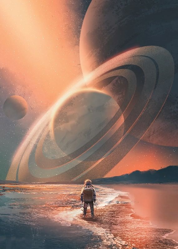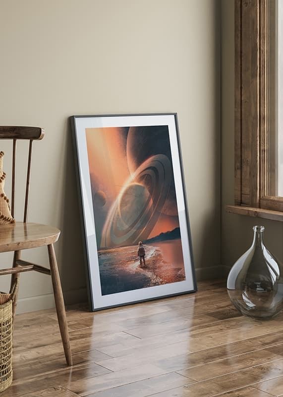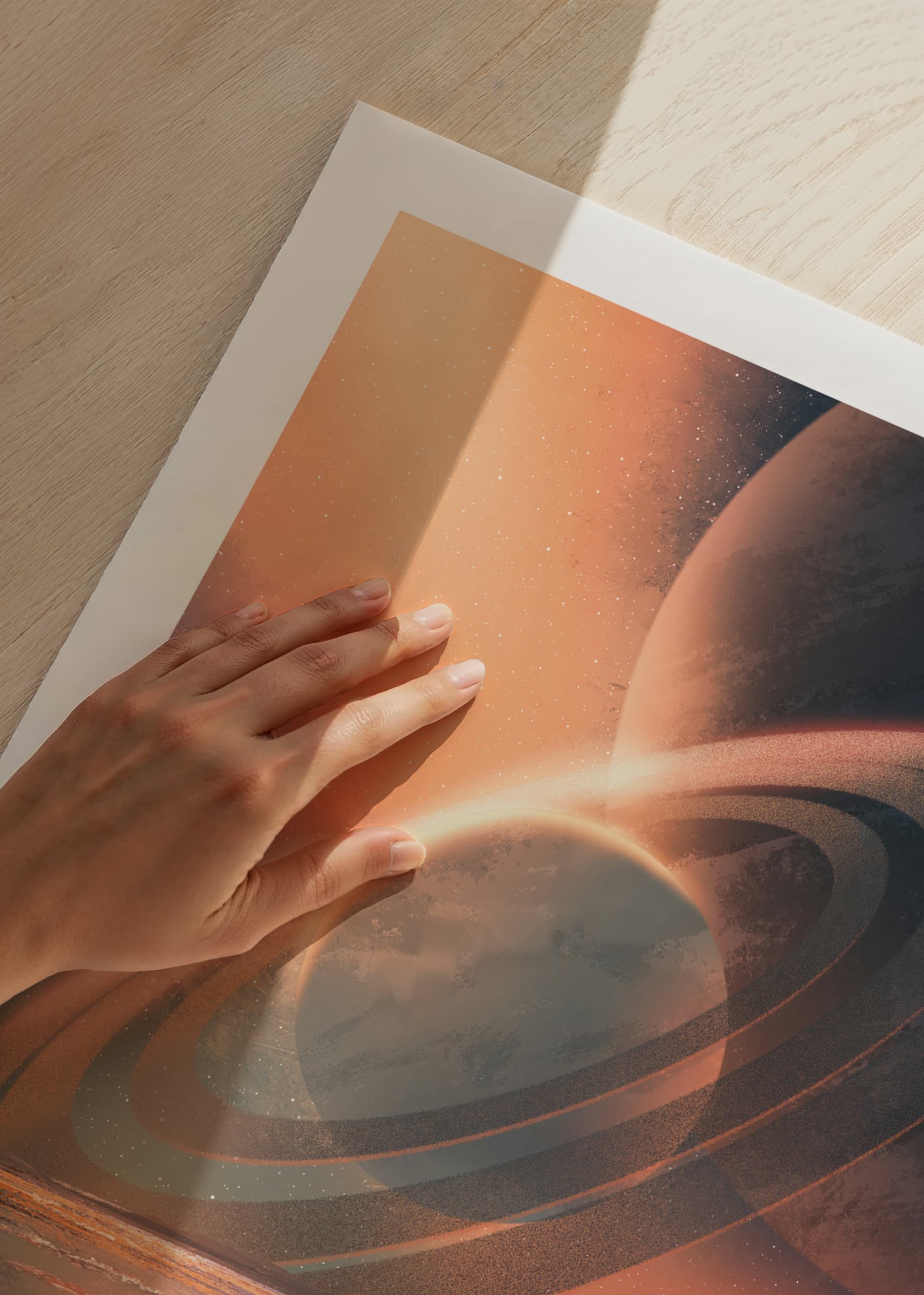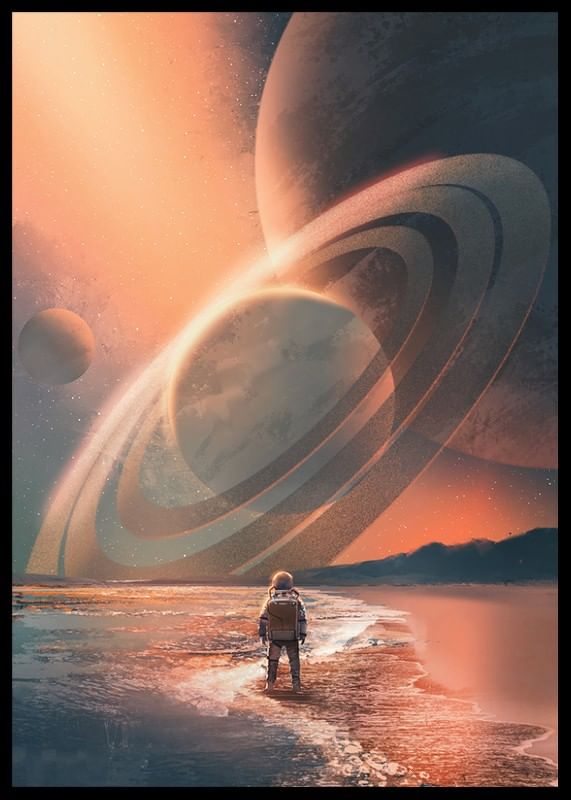 En astronaut står vid en strandkant med flera stora planeter och ringar som dominerar himlen i bakgrunden. Färgskalan går i mjuka orangea och blå toner, vilket skapar en fantasifull och drömlik känsla. Den här postern blir ett spännande inslag i barnrummet eller andra kreativa miljöer.