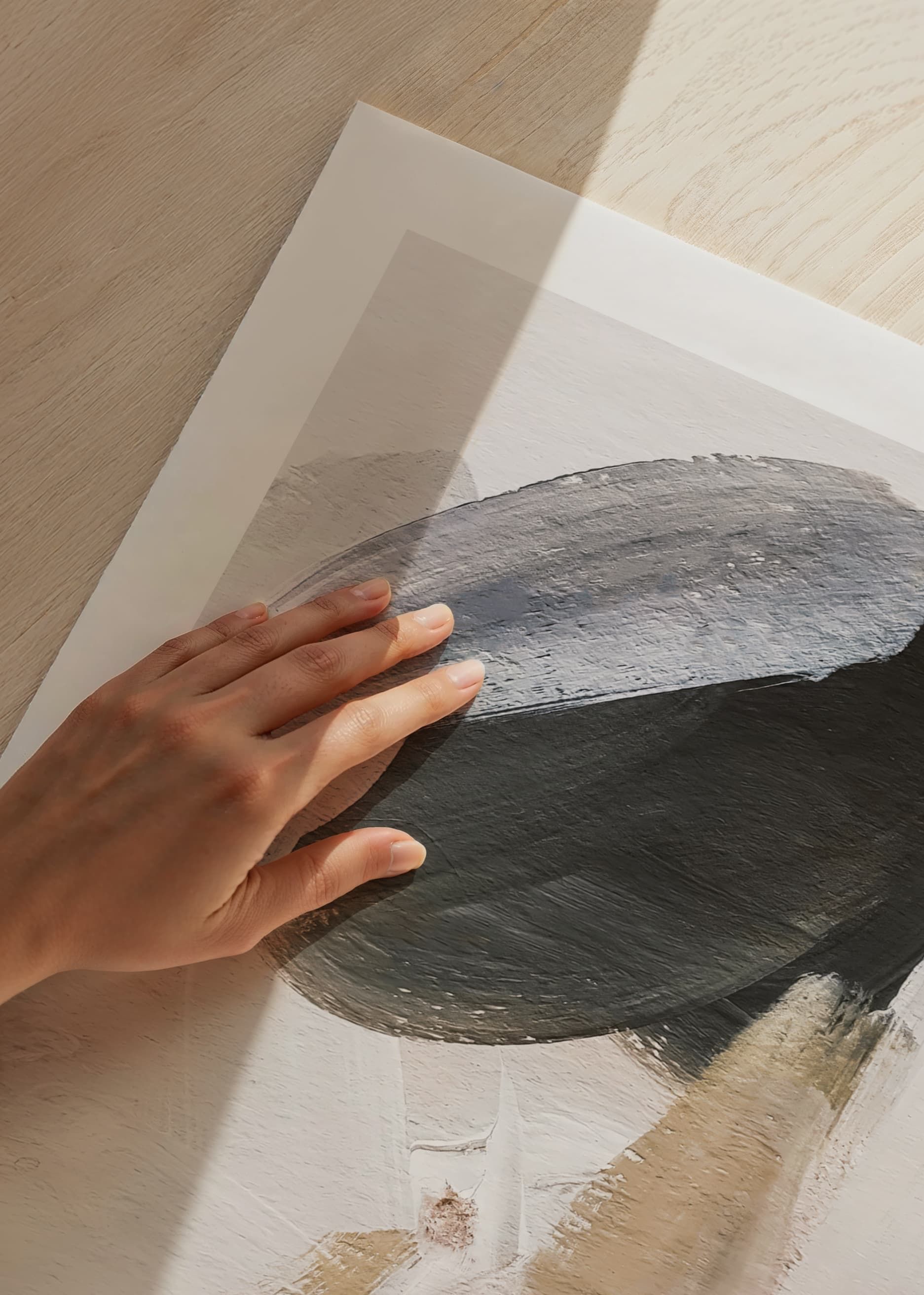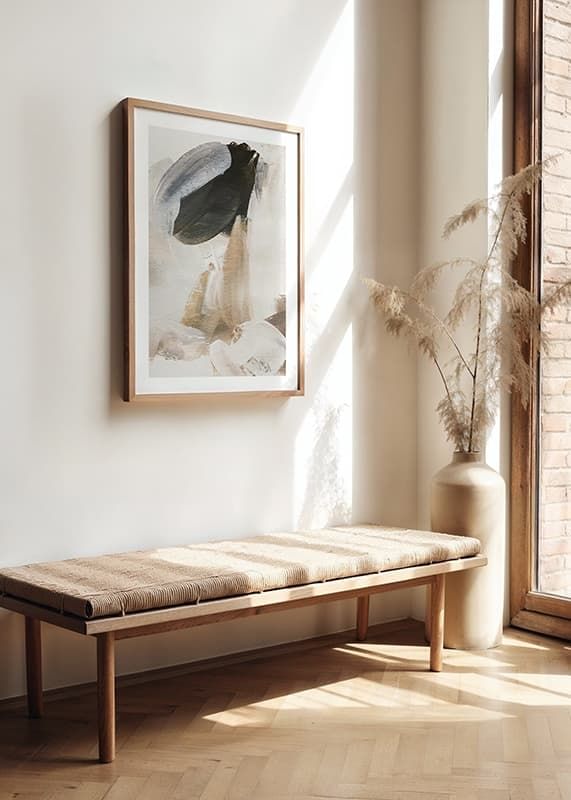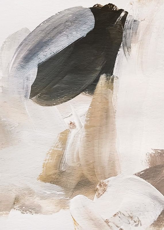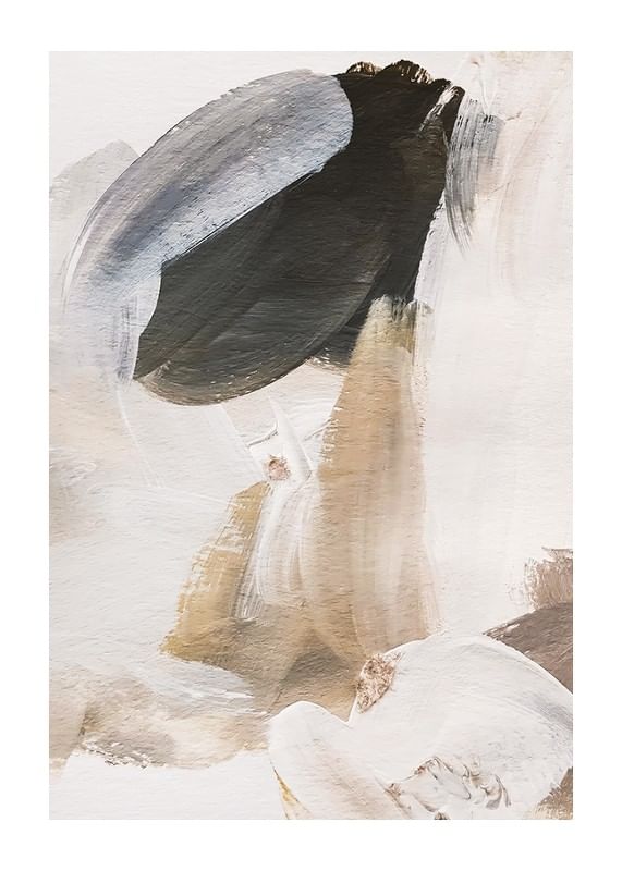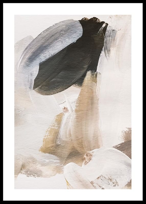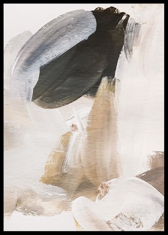 Stora, svepande penseldrag i nyanser av brunt, blågrått och svart skapar en luftig och organisk känsla i motivet. De mjuka färgfälten kontrasteras av kraftigare mörka partier, vilket ger ett dynamiskt uttryck. Denna poster ger ett konstnärligt inslag till vardagsrum eller arbetsrum utan att ta över rummet.