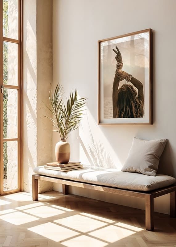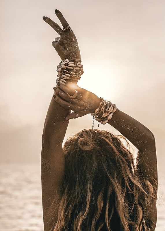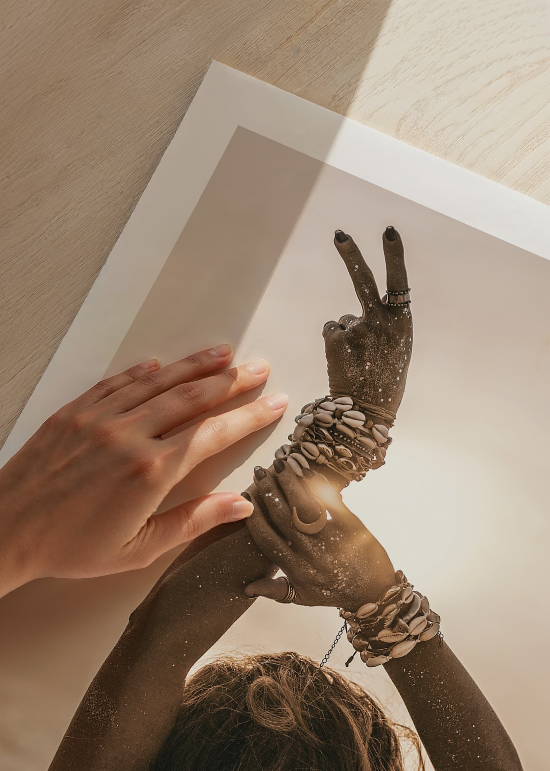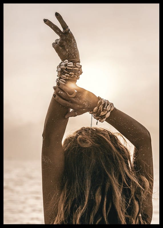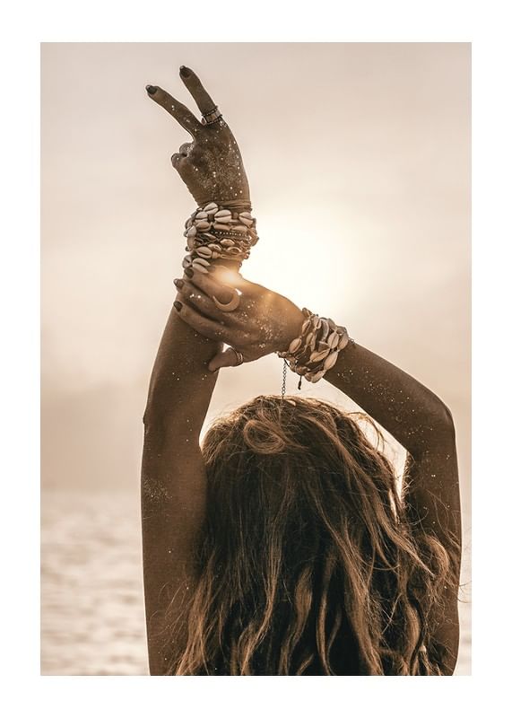 Armar med flera snäck- och pärlarmband sträcks upp mot solen, med långt vågigt hår och sandig hud synlig i förgrunden. Bakgrunden är mjukt oskarp med havet och ett varmt motljus som skapar en dröjande sommarskänsla. Denna poster ger en ledig, bohemisk ton till både sovrum och vardagsrum.