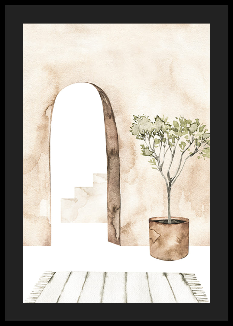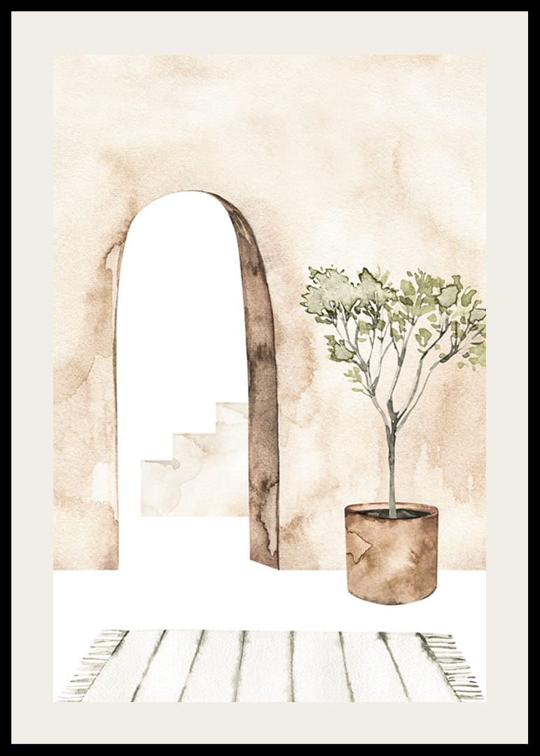 Ljus akvarell med motiv av en medelhavsinspirerad innergård. Ett olivträd i rund kruka står vid sidan av ett valvformat öppet dörrparti där en trappa leder uppåt i bakgrunden. Dova beige och gröna toner ger ett luftigt intryck. Denna poster passar i vardagsrum eller hall för en diskret och stilren känsla.