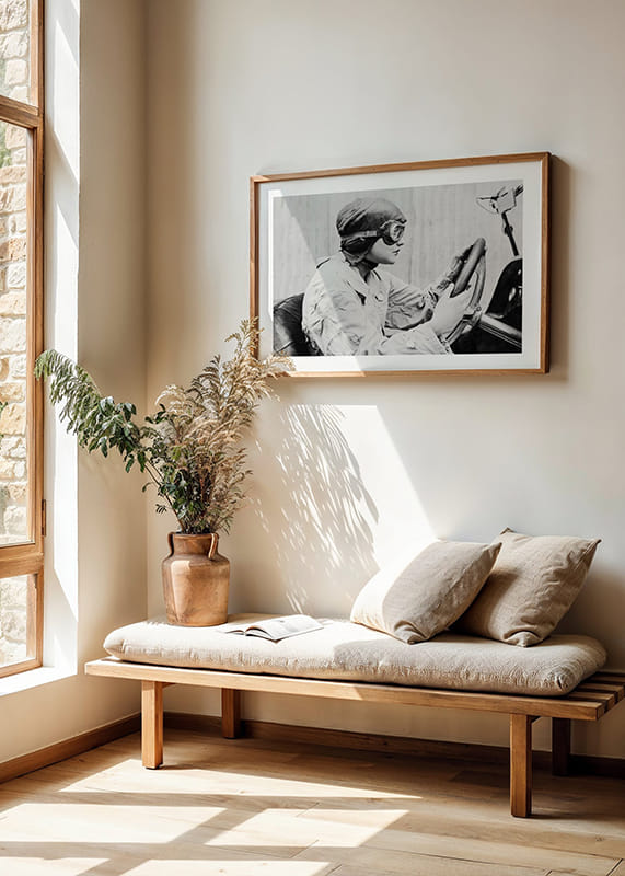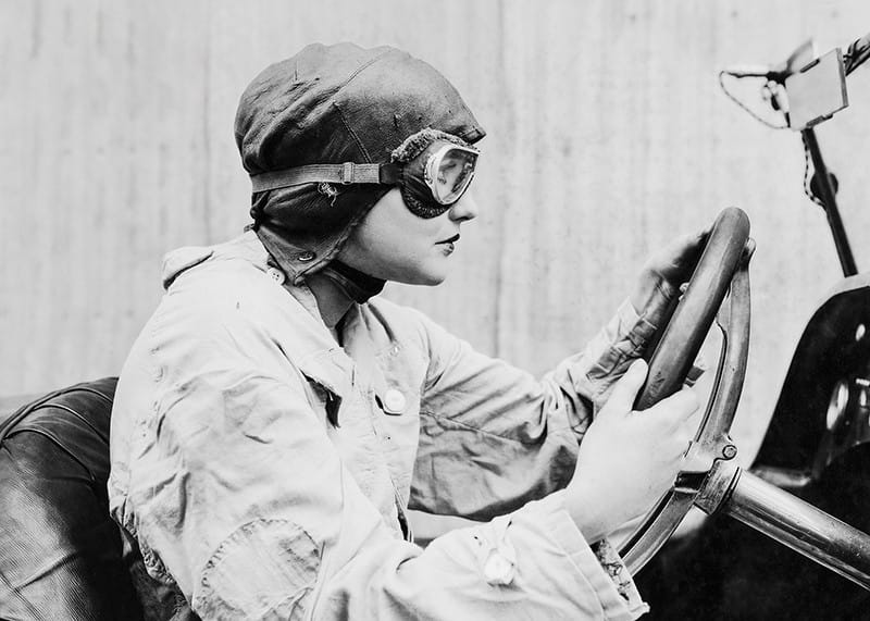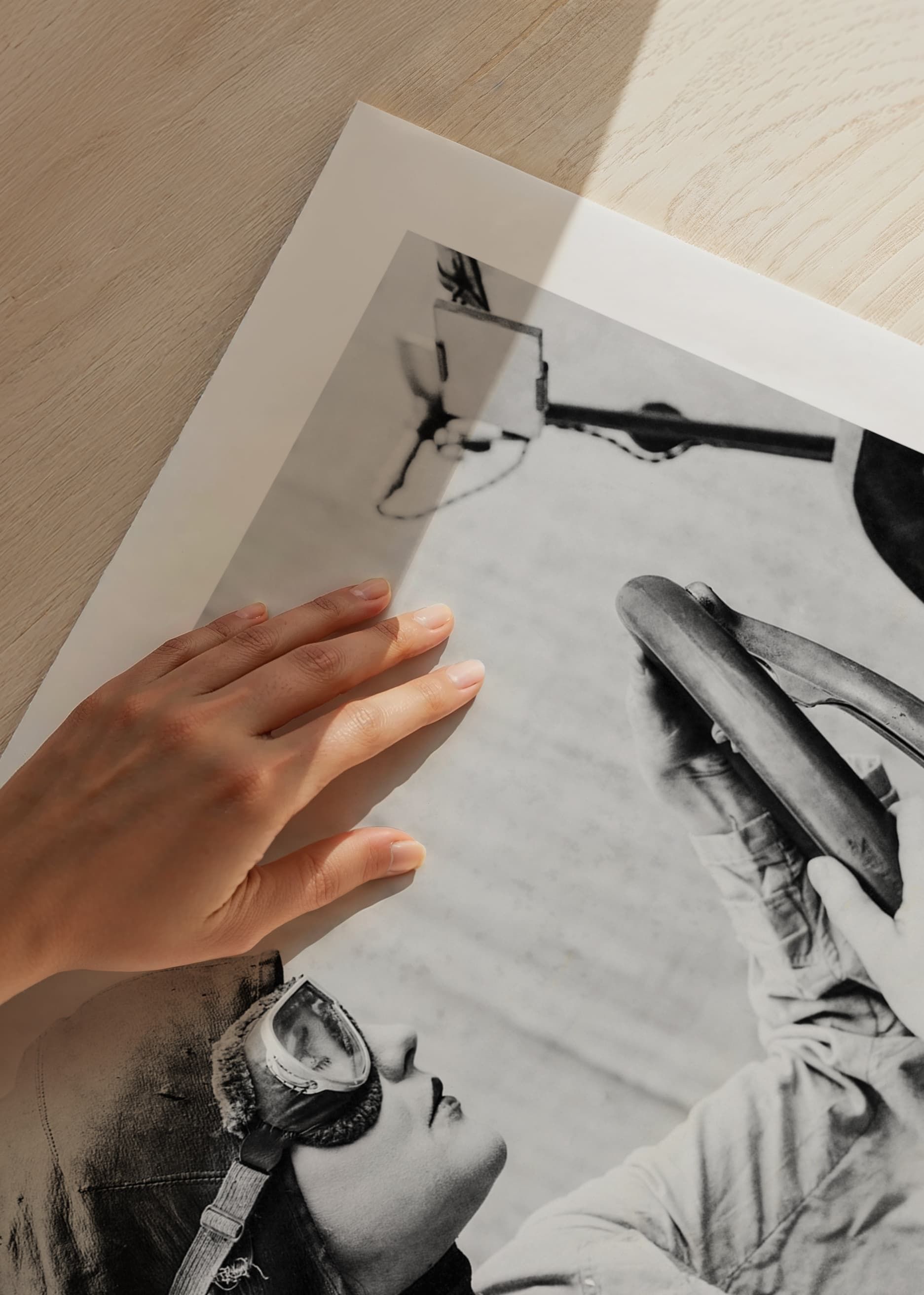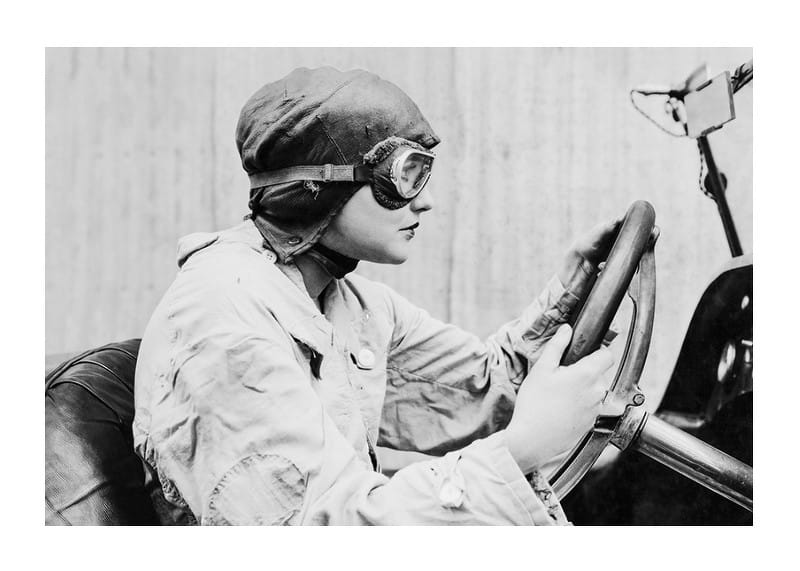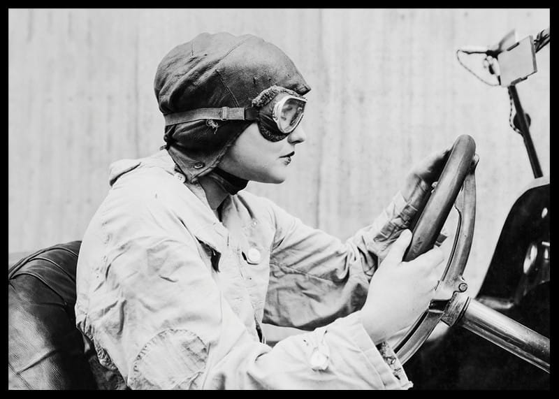 Kvinnlig förare sitter koncentrerat vid ratten i en äldre bil, iförd vintage racingdräkt, hjälm och skyddsglasögon. Svartvita toner och tidstypisk stil ger en retro känsla till motivet. En poster som tillför historia och karaktär till garage, arbetsrum eller vardagsrum.