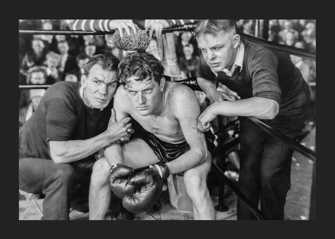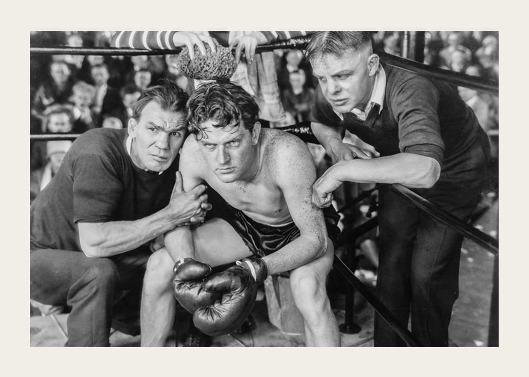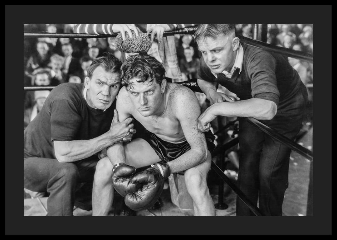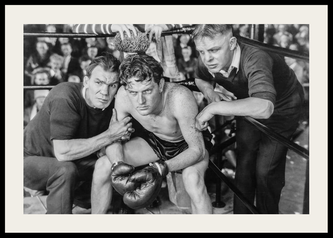 Tre personer i fokus där en trött boxare sitter i hörnan av en boxningsring, uppbackad av sina två tränare. Publiken syns suddigt i bakgrunden och helheten är fångad i svartvitt med tydlig vintagestil. Denna poster tillför karaktär och en känsla av historia till vardagsrum, hall eller hemmagym.