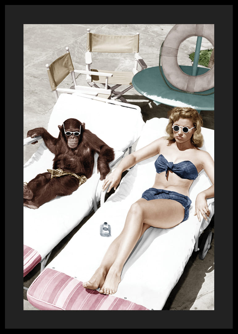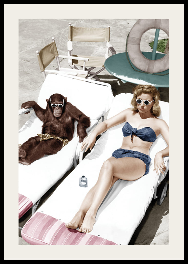 Motivet består av en kvinna och en schimpans som vilar på solstolar bredvid varandra, båda iförda solglasögon vid en poolkant. Kvinna i blå baddräkt och schimpans med mönstrad kjol. Avslappnat och lekfullt uttryck i en klassisk miljö sätter en originell ton. Postern fungerar i sociala ytor eller kreativa rum.