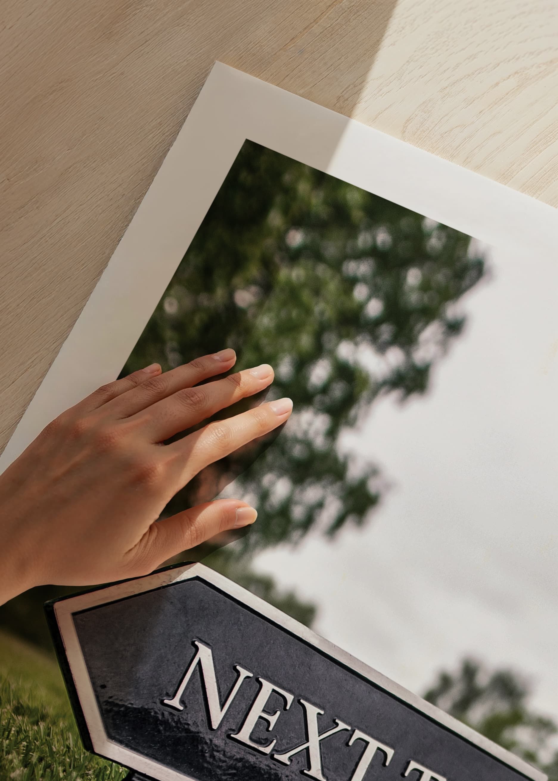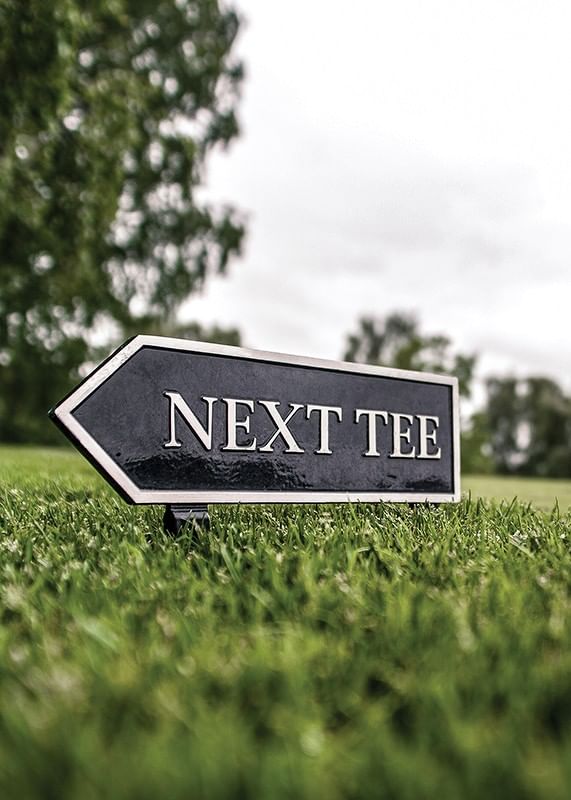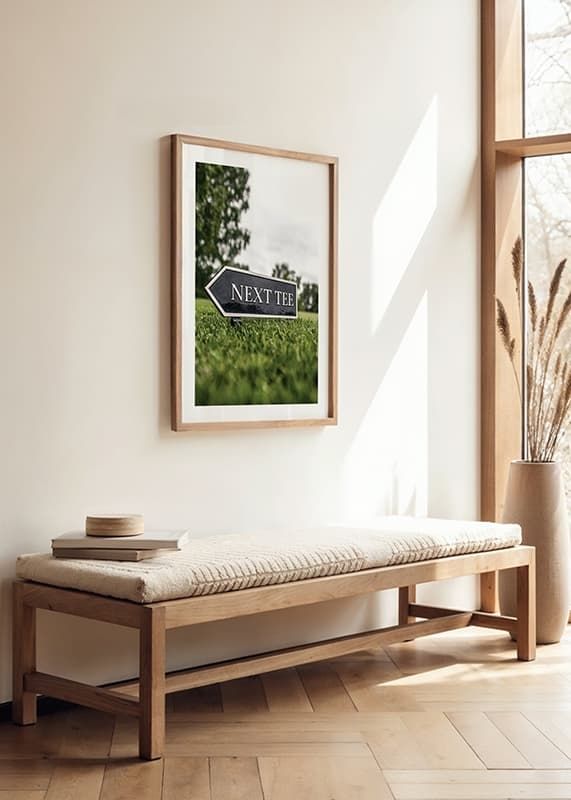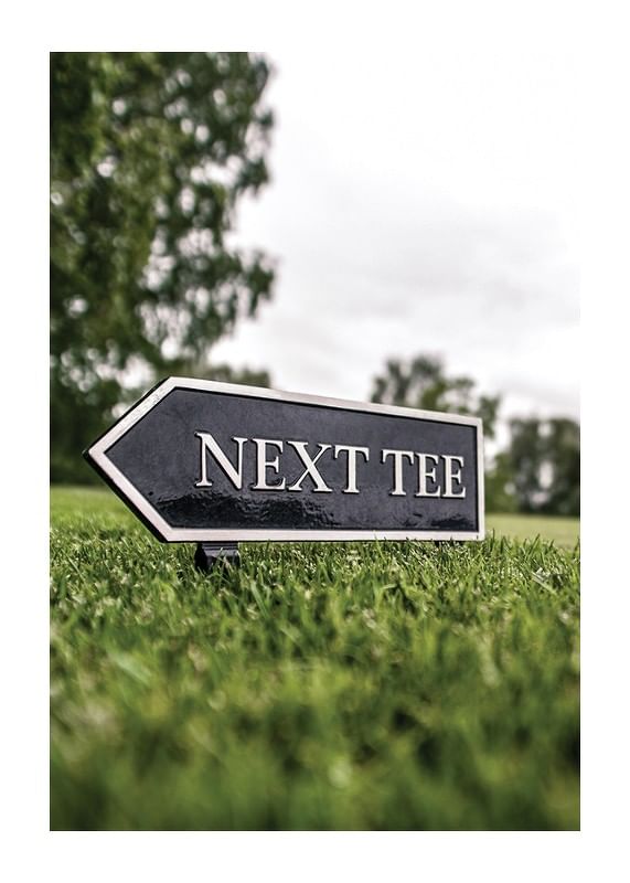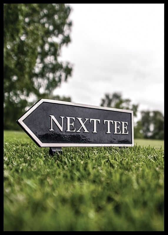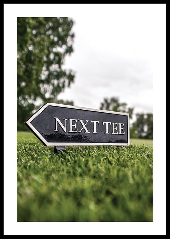 En svart pilformad skylt med texten ”Next Tee” står lågt ovanför det välklippta gräset på en golfbana. Bakgrunden visar suddiga träd och en molnig himmel, vilket ger motivet ett sportigt men avskalat uttryck. Denna poster lyfter fram golfens atmosfär och passar utmärkt i sportiga hem eller kontor.