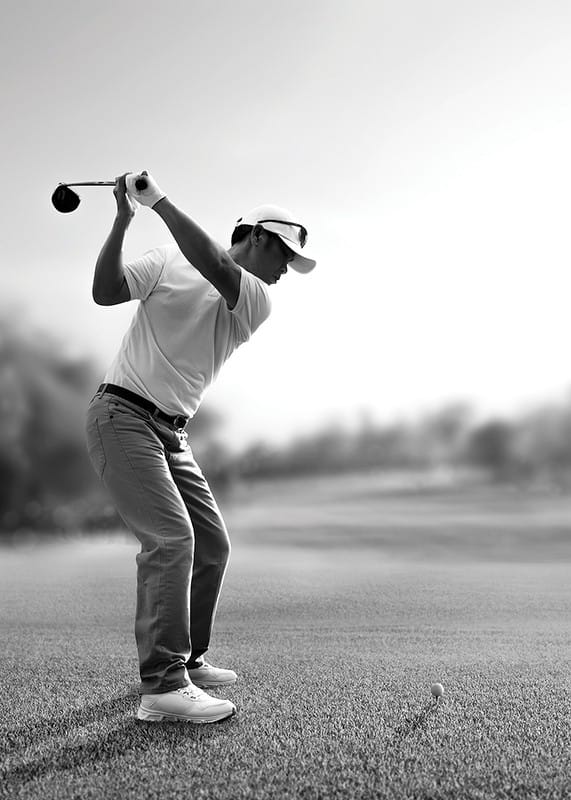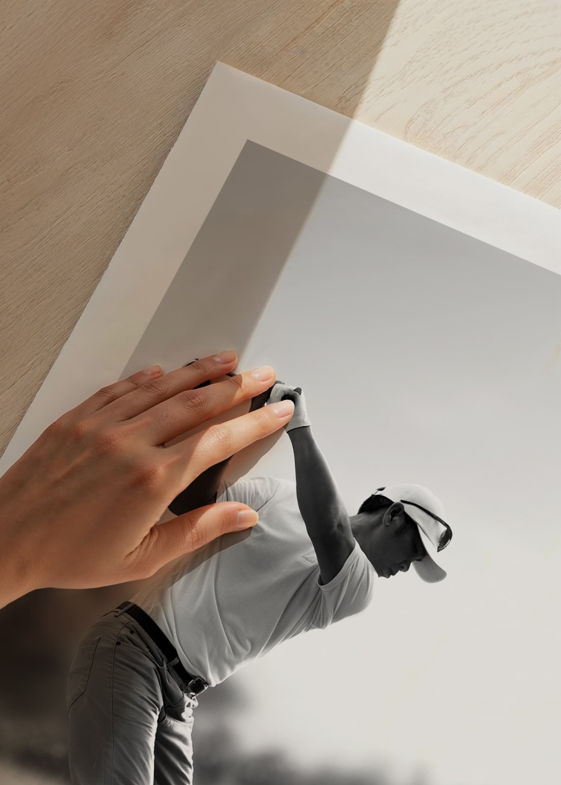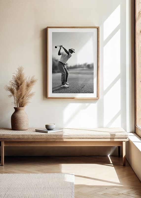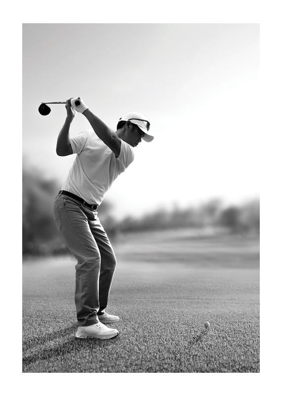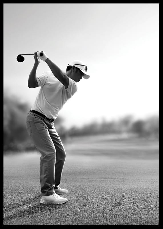 En golfspelare i klassisk uppställning inför ett slag med driver står mot en suddig bakgrund av en öppen golfbana. Tydliga kontraster och monokroma toner framhäver kroppens rörelse och koncentration. Denna poster ger ett sportigt inslag och passar i arbetsrum, fritidsutrymmen eller moderna vardagsrum.