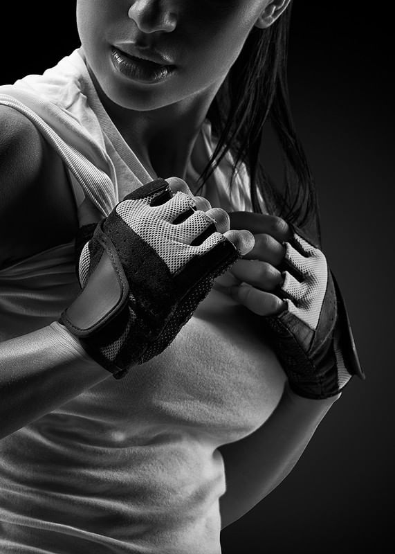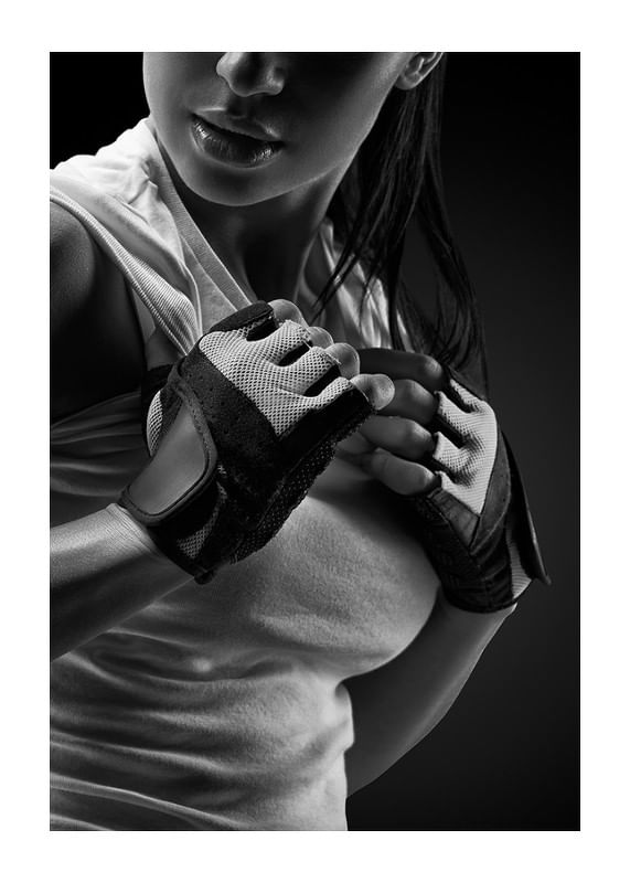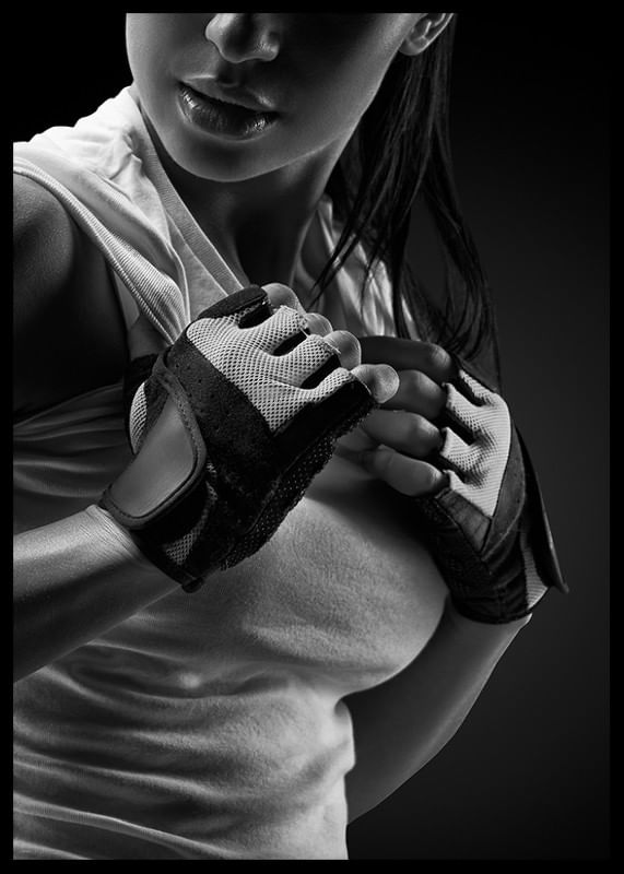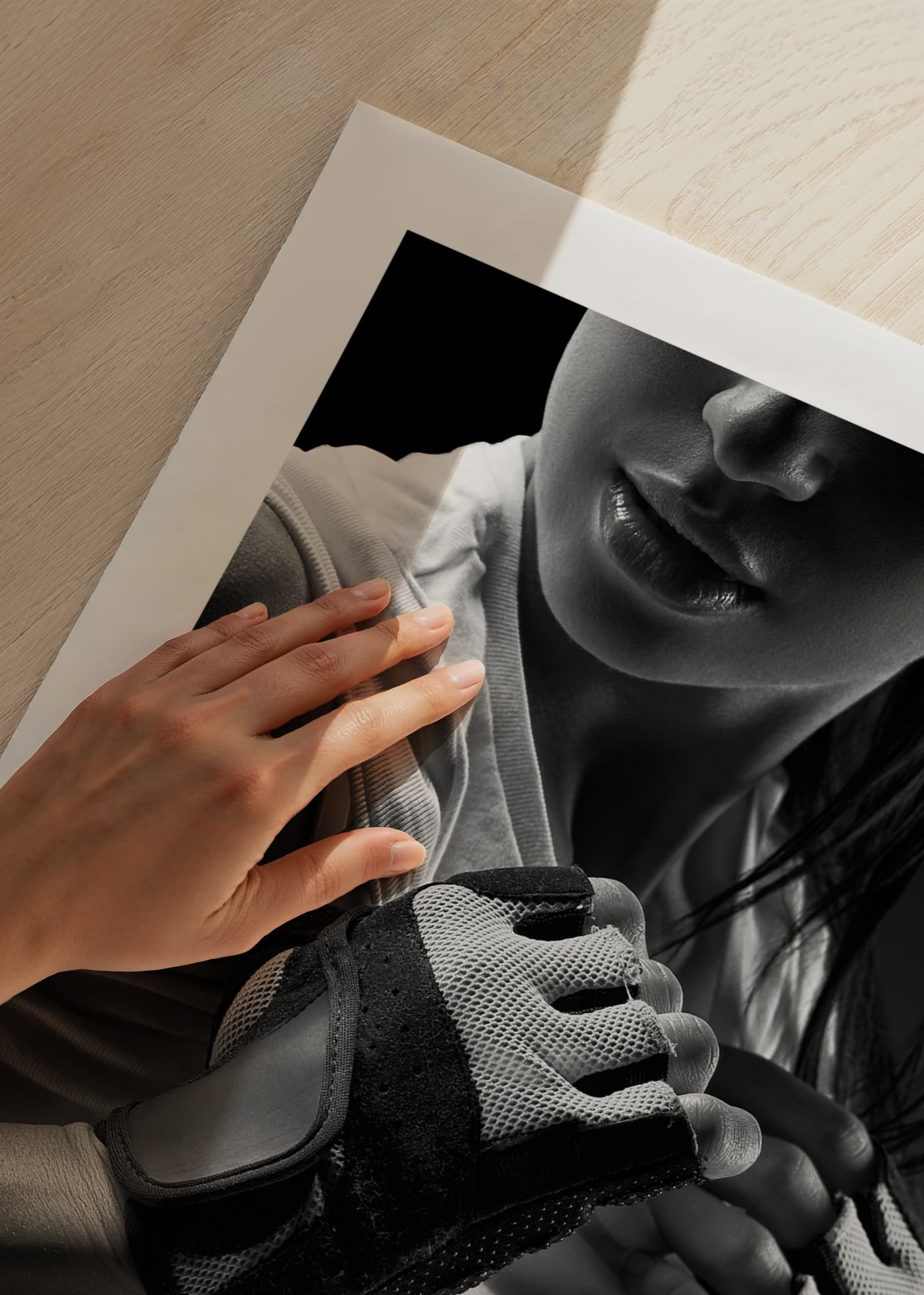 Närbild av en sportklädd kvinna i svartvitt, fokuserad och med träningshandskar på händerna. Skuggor och kontraster framhäver de definierade linjerna och skapar en stark känsla av energi och målmedvetenhet. Denna poster ger ett dynamiskt uttryck som passar både hemmagym och moderna vardagsrum.