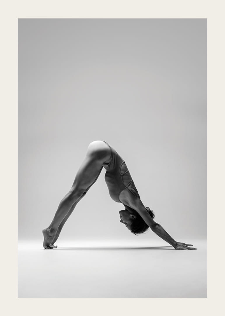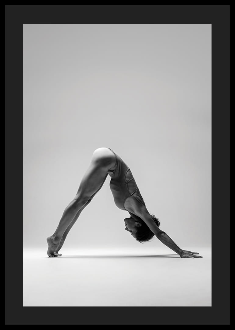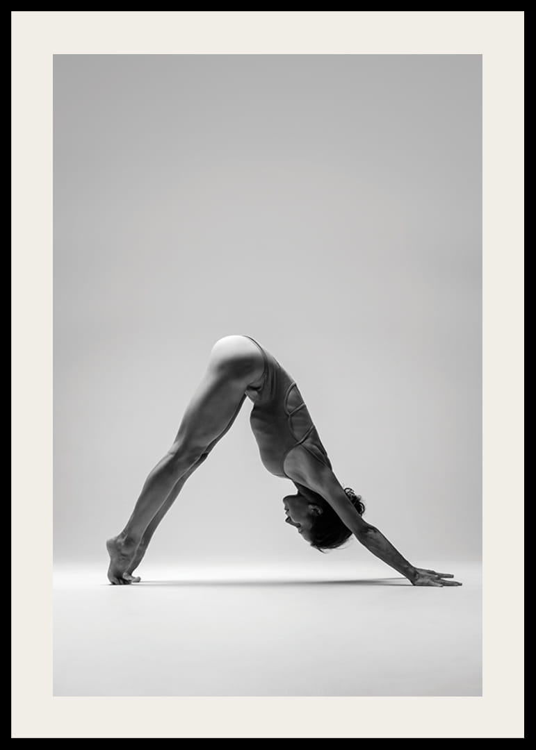 En kvinna står i positionen nedåtgående hund i ett minimalistiskt rum med ljus bakgrund. Den svartvita kompositionen framhäver linjer och kroppens styrka. Stilrena detaljer gör denna poster till ett diskret tillskott i rum för träning, avkoppling eller modern inredning.
