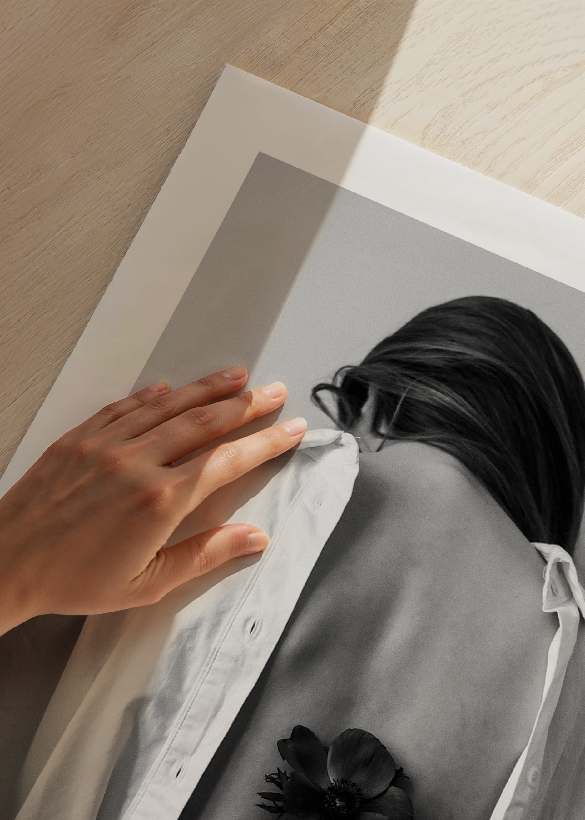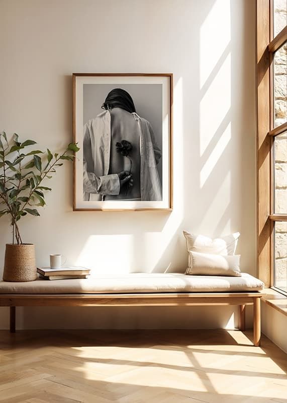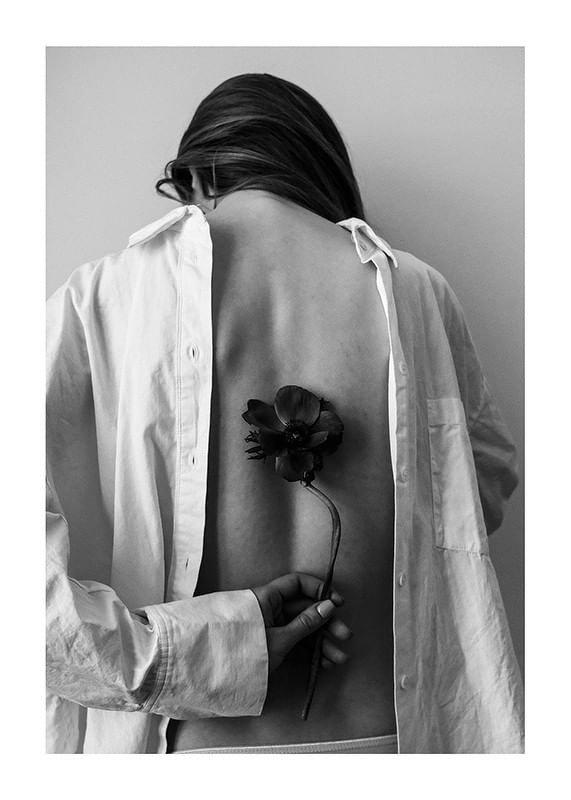En kvinna ses bakifrån klädd i en öppen vit skjorta, med ryggen exponerad och huvudet böjt framåt. Hon håller en mörk blomma bakom ryggen med ena handen, vilket skapar en subtil kontrast mot skjortans ljusa tyg. Den svartvita stilen förstärker motivets stillhet och enkelhet. Denna poster passar bra i sovrum eller hall.