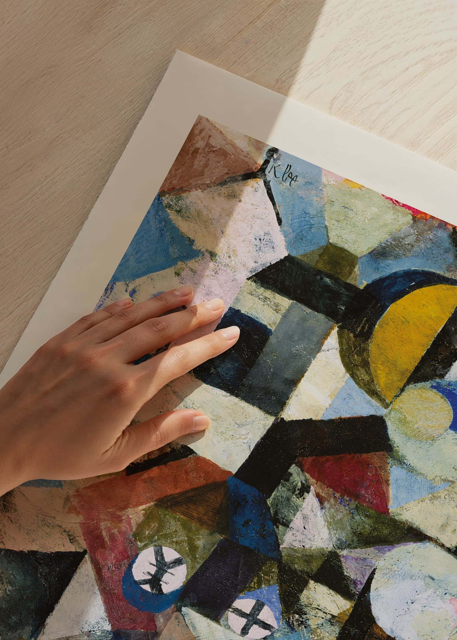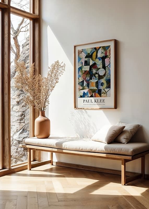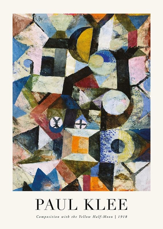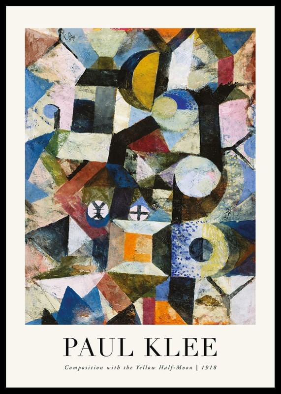Oregelbundna geometriska former i blå, gula och röda toner utgör motivet, där en halvmåne i klargult sticker ut bland de kubistiska fälten. Kontraster mellan ljusa och mörka färgpartier ger djup och rörelse. Skapad av den schweizisk-tyske konstnären som var en av modernismens pionjärer och betydelsefull pedagog vid Bauhaus, där han utvecklade sin teori om färgernas uttrycksfulla kraft. Denna poster passar både i kreativa arbetsrum och moderna vardagsrum.