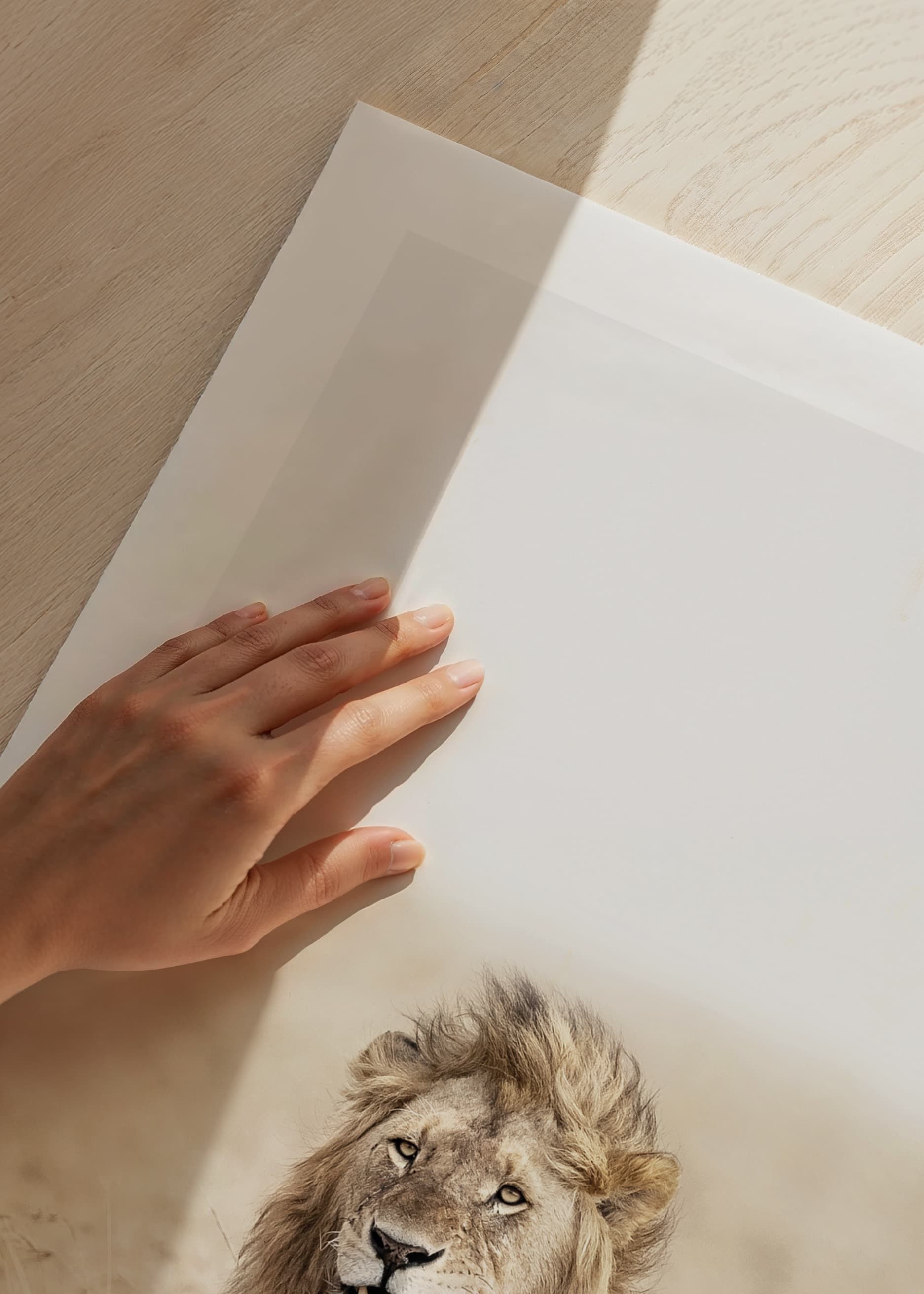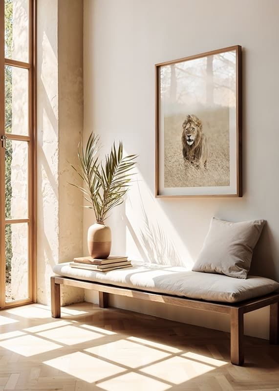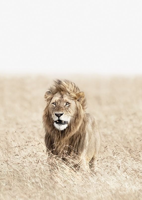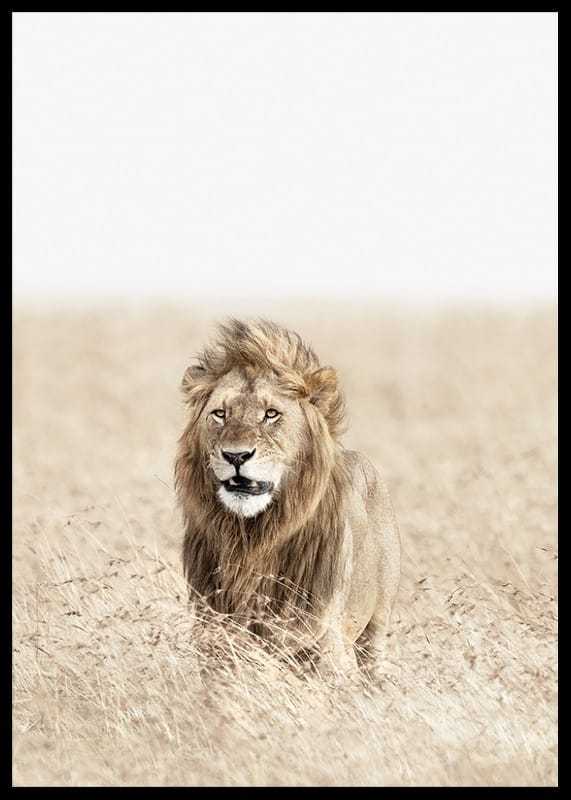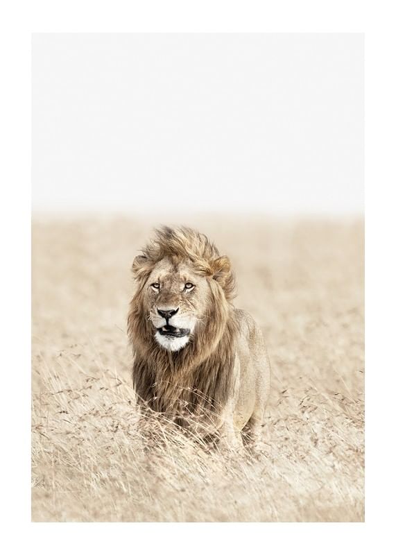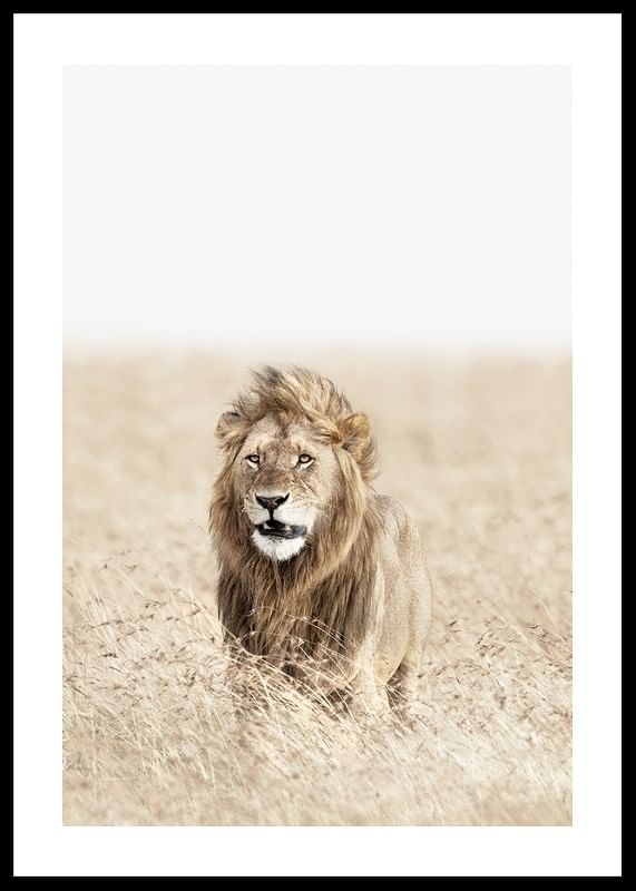 Ståtligt lejon med tjock man står mitt i det höga, bleka savanngräset och blickar rakt fram. De ljusa, sandfärgade tonerna ger ett luftigt och öppet intryck, medan lejonets detaljrika päls framträder tydligt. Den här postern lyfter fram naturens egen styrka och kompletterar moderna och skandinaviska inredningar.