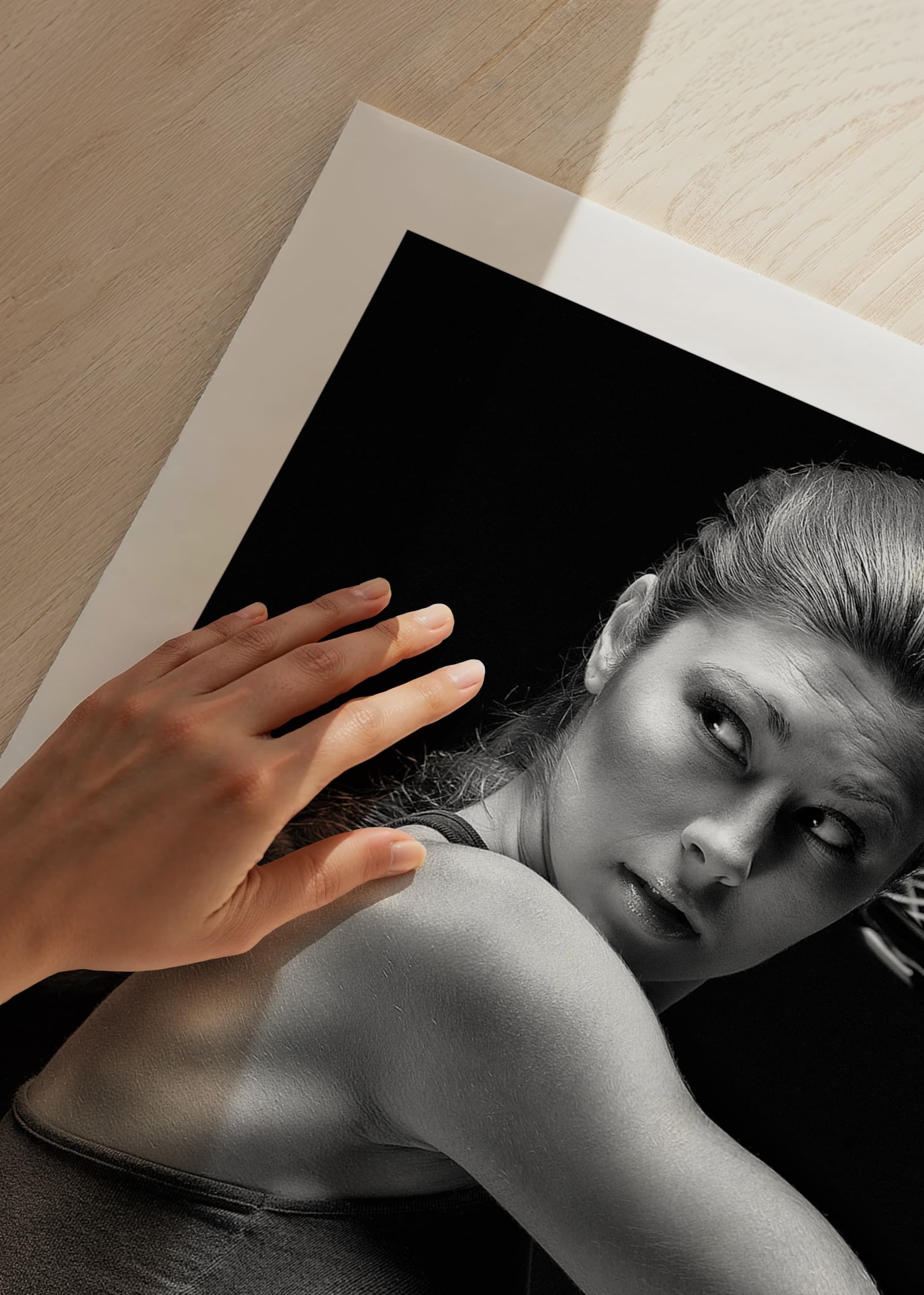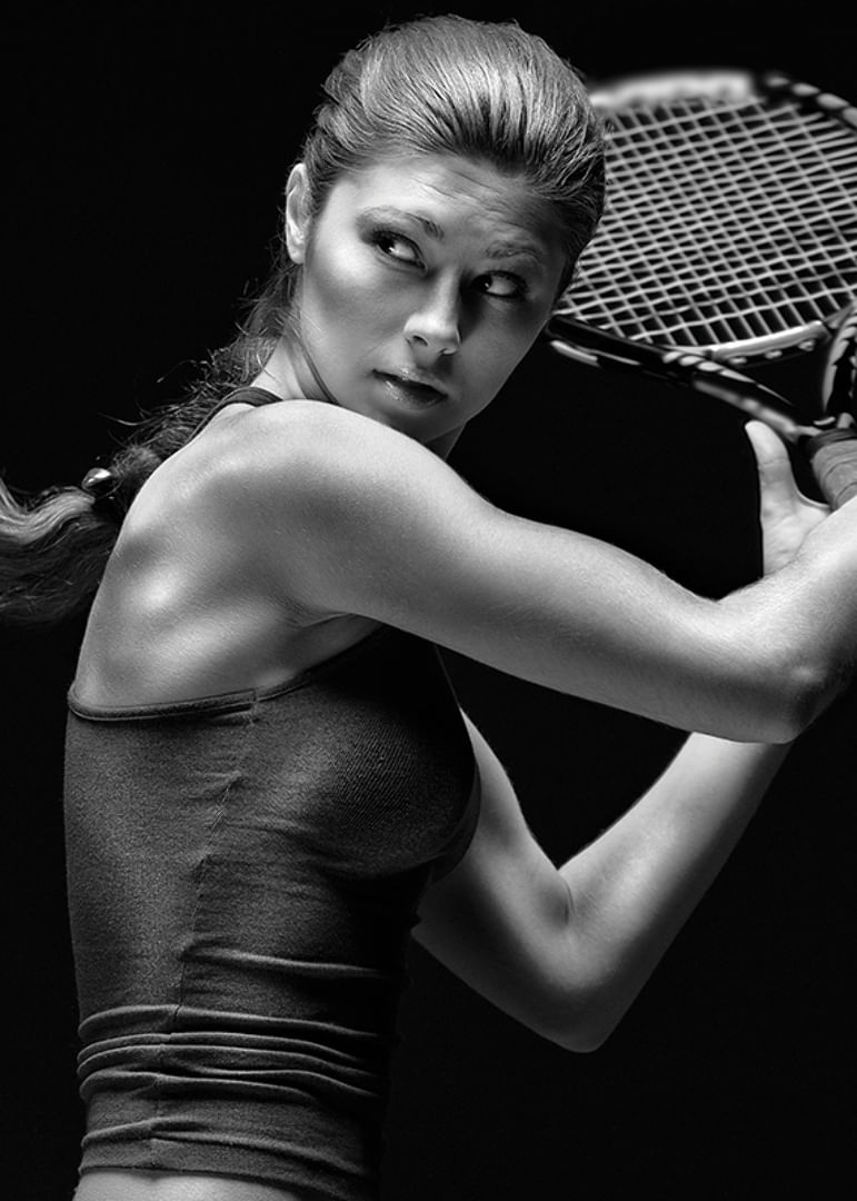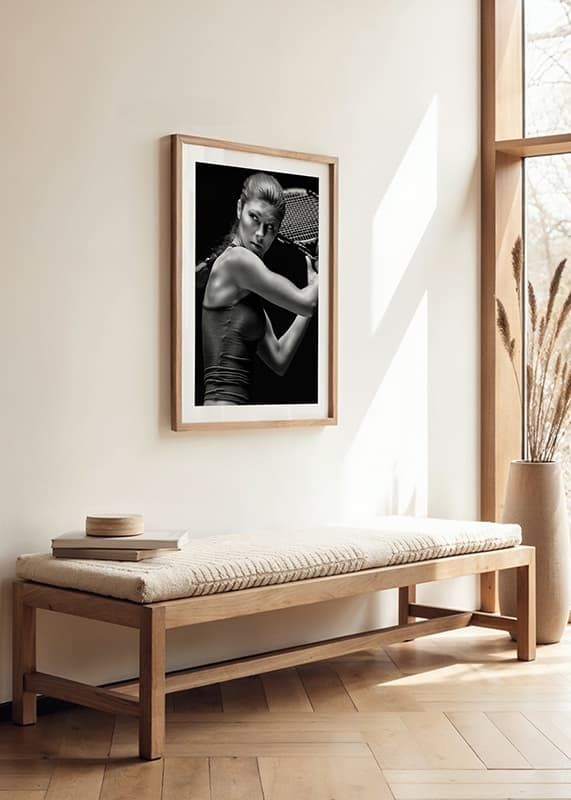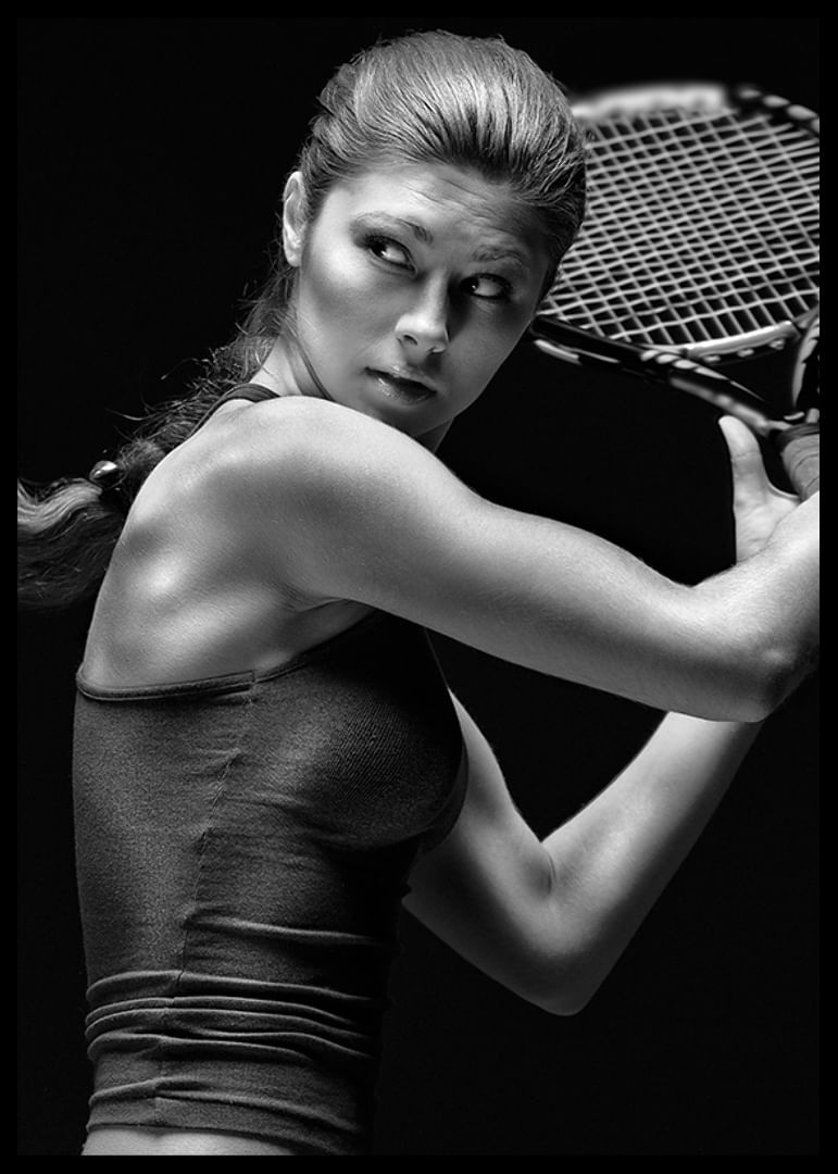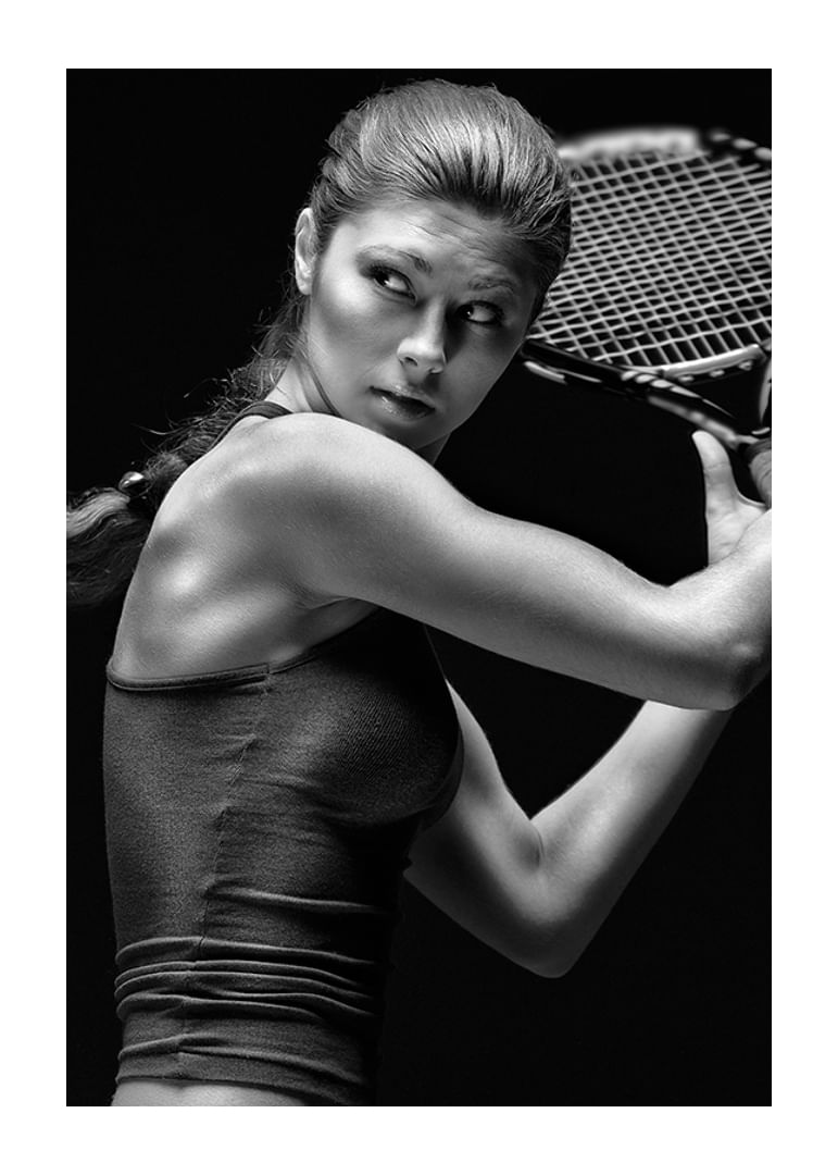Kvinnlig tennisspelare fångad i ett svartvitt porträtt, där blicken är fokuserad och kroppen framhävs av mjuka skuggor mot mörk bakgrund. Sportig energi och rörelse lyfts fram i motivet, vilket gör denna poster till ett dynamiskt tillskott i allt från träningsrum till moderna vardagsrum.