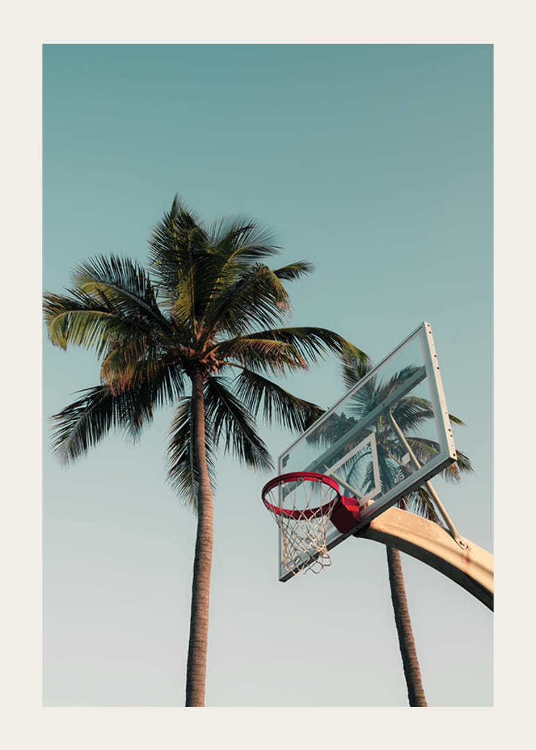 En basketkorg sträcker sig upp mot en klarblå himmel, med höga palmer i bakgrunden som skapar en känsla av tropisk miljö. De rena linjerna och de mjuka färgtonerna ger motivet ett modernt intryck. Denna poster ger ett sportigt och avslappnat inslag som passar utmärkt i hemmakontor eller vardagsrum.