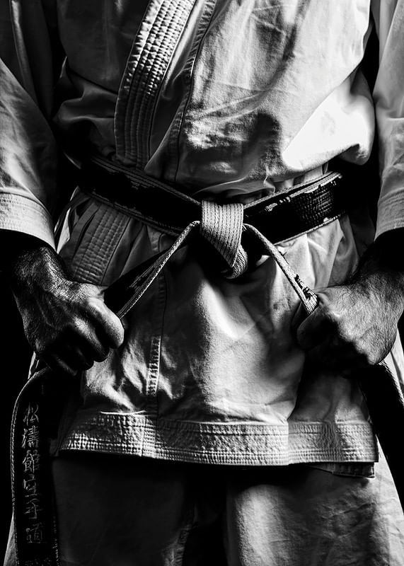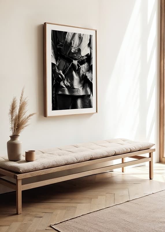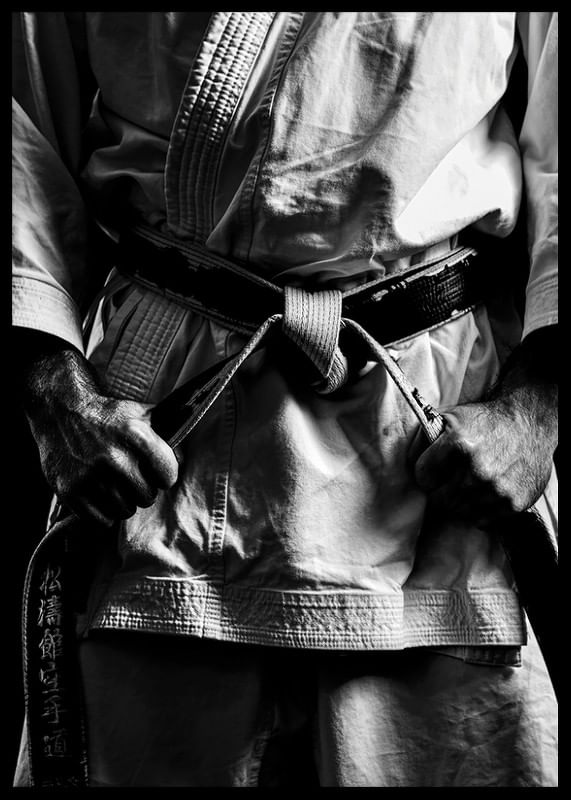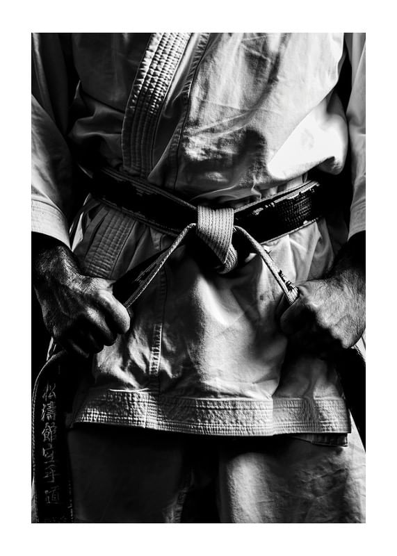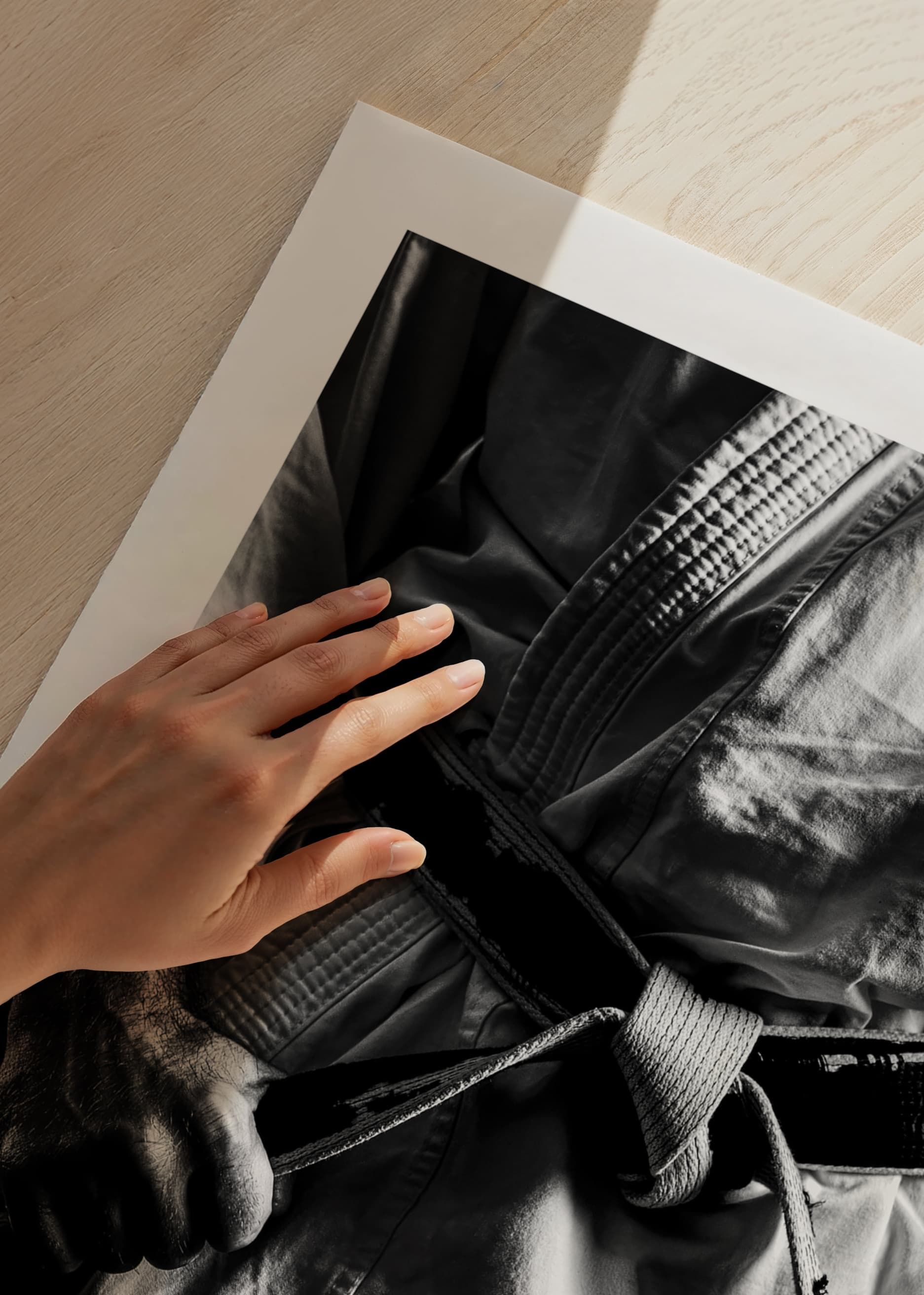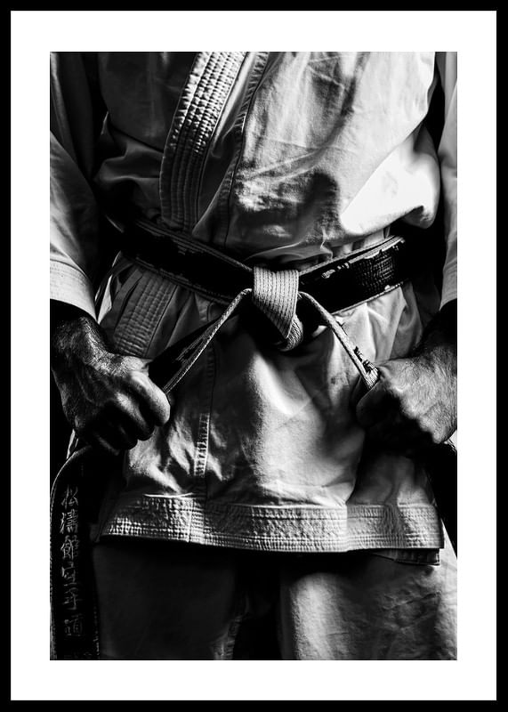 Detaljerad närbild av ett svart bälte som knyts runt midjan på en person klädd i traditionell kampsportsdräkt. De markerade händerna och de tydliga tyglagren ger postern ett grafiskt och fokuserat uttryck. Passar utmärkt för hemmagym, träningsrum eller andra miljöer där energi och disciplin uppskattas.