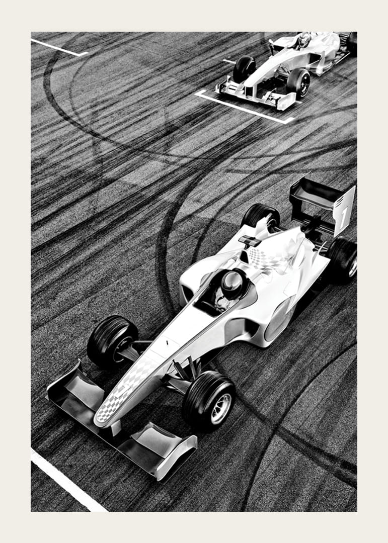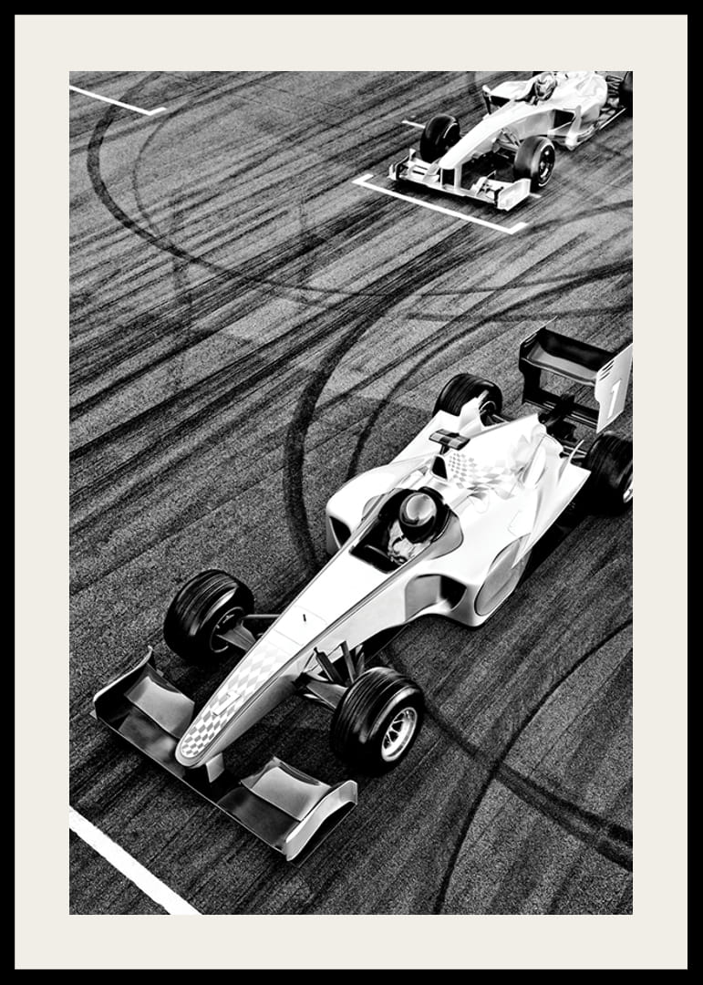 Två formelbilar fångas ovanifrån i svartvitt, där tydliga däckspår bildar mönster över banans yta. Nummer ett-bilen står i fokus närmast i bild, redo vid startlinjen. Grafisk kontrast mellan fordon och underlag ger postern ett dynamiskt uttryck, vilket gör den till ett spännande inslag i sportintresserade miljöer.