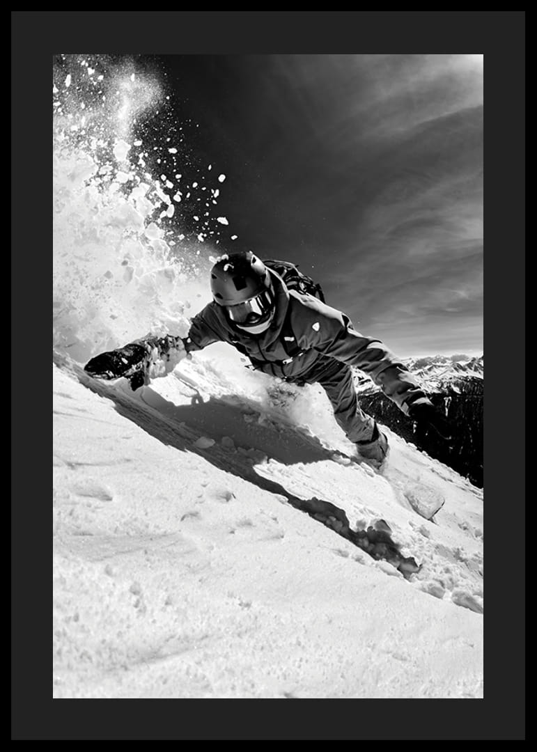 Dramatisk svartvit närbild av en snowboardåkare som svänger nedför en brant backe, med snö som yr kring kroppen. Skarpa kontraster mellan ljus och skugga förstärker rörelsen och energin i motivet. Postern passar bra i sportiga miljöer eller som inspiration i hemmets aktiva rum.