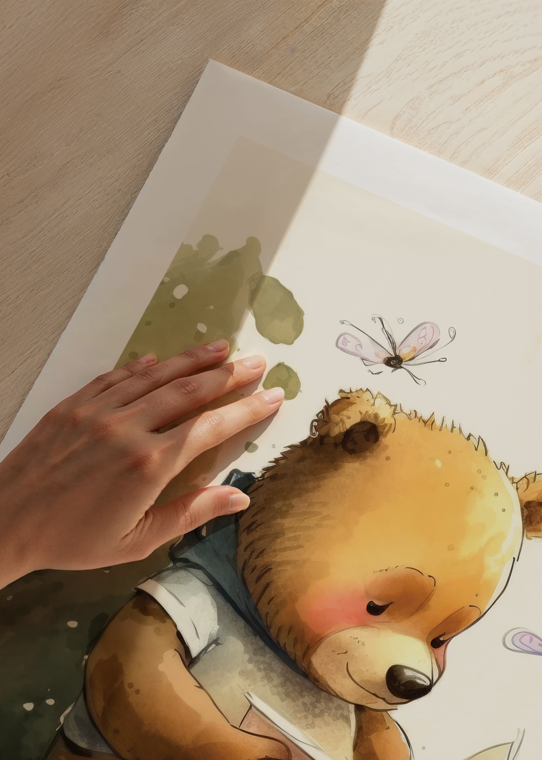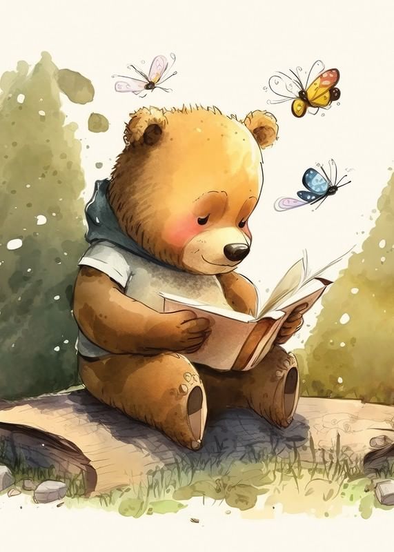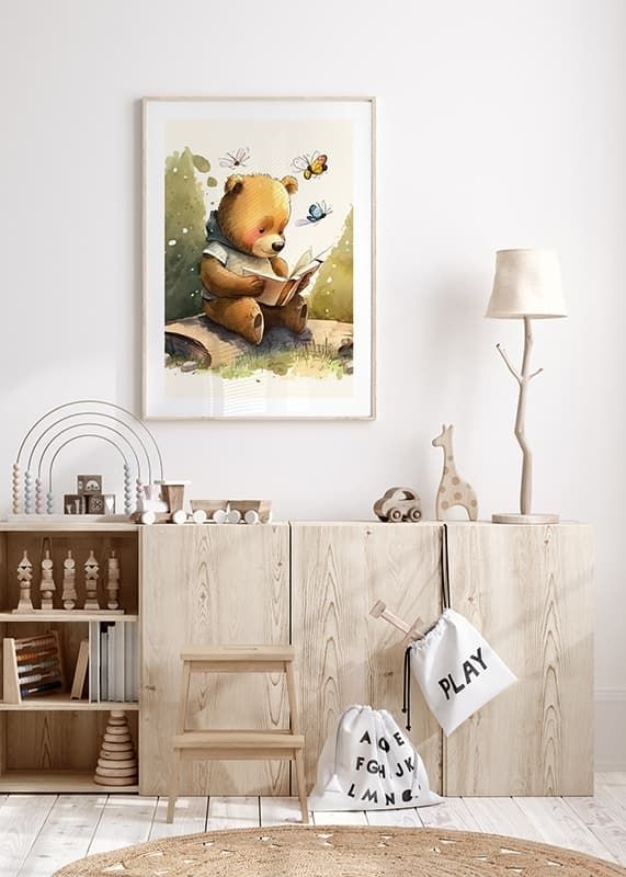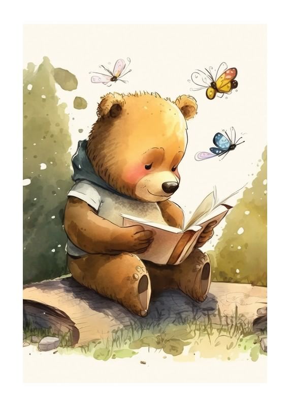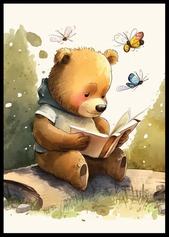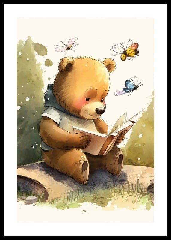 En brun björn sitter på en trädstam med en öppen bok i händerna, omgiven av färgglada fjärilar. Illustrationens mjuka akvarelltoner i grönt, brunt och beige skapar en varm och levande atmosfär. Denna poster ger en fantasifull känsla till barnrum eller lekområden och uppmuntrar till nyfikenhet och läslust.