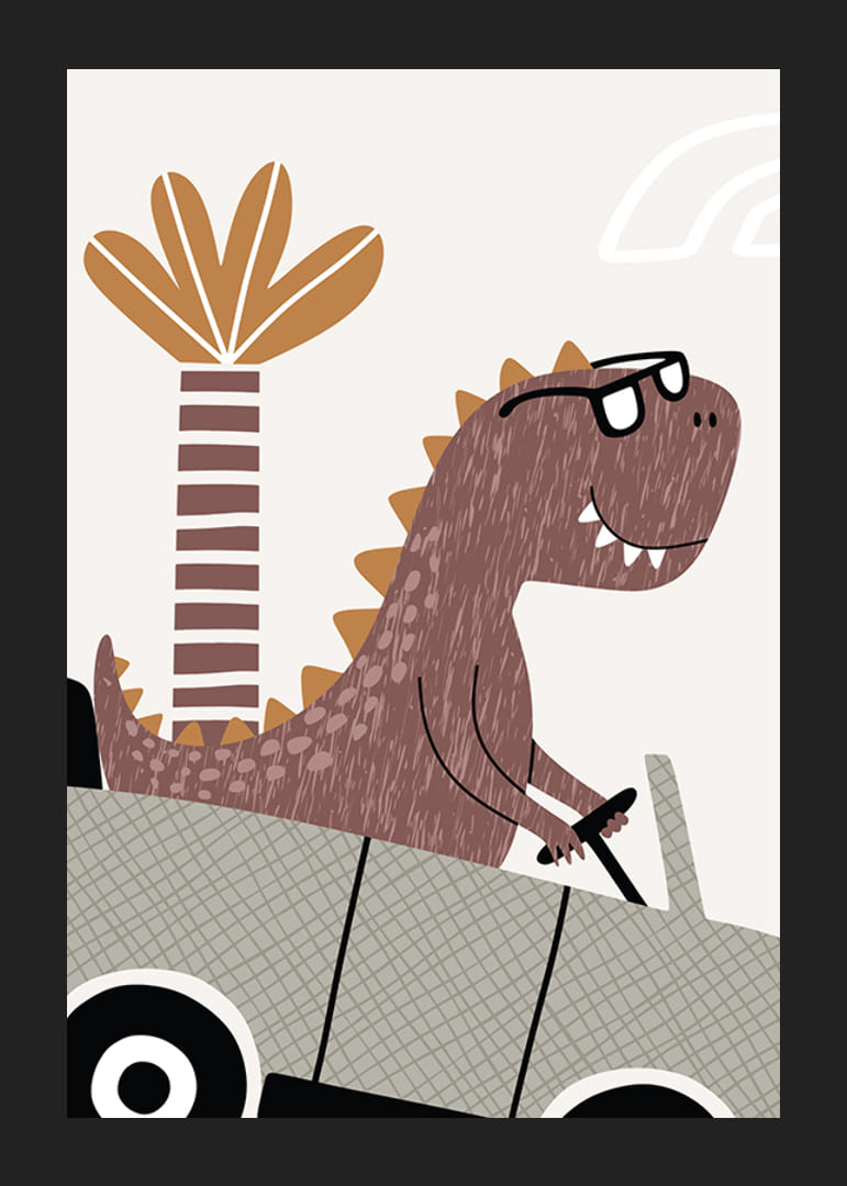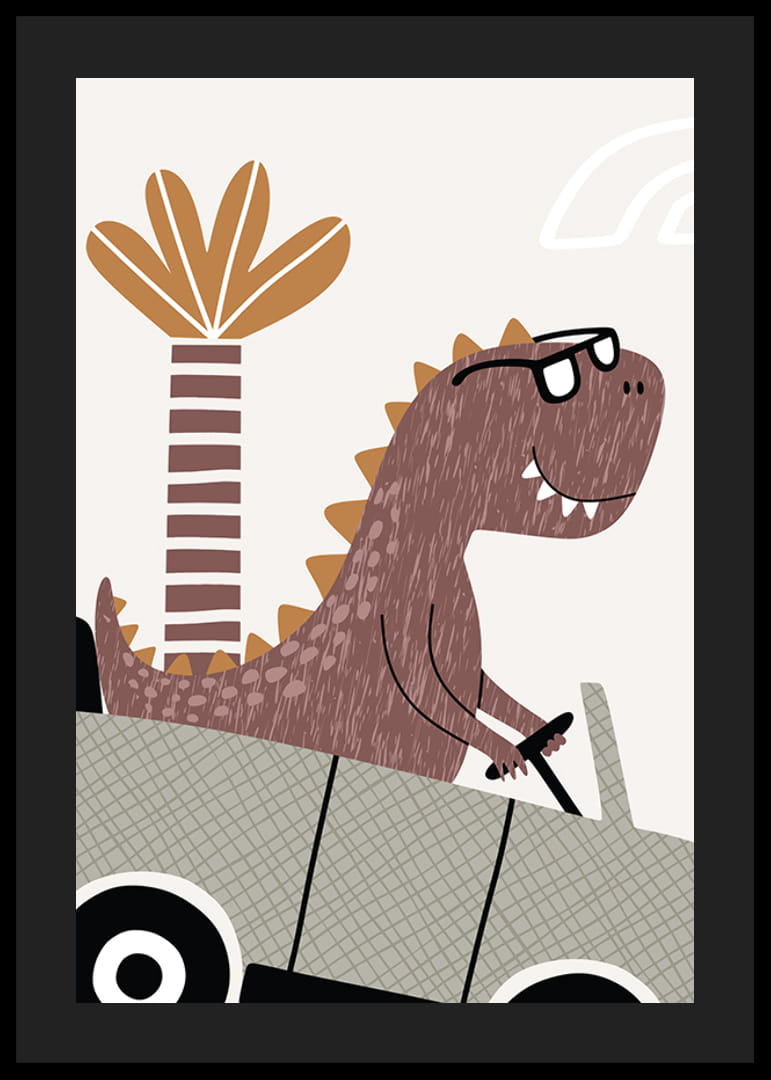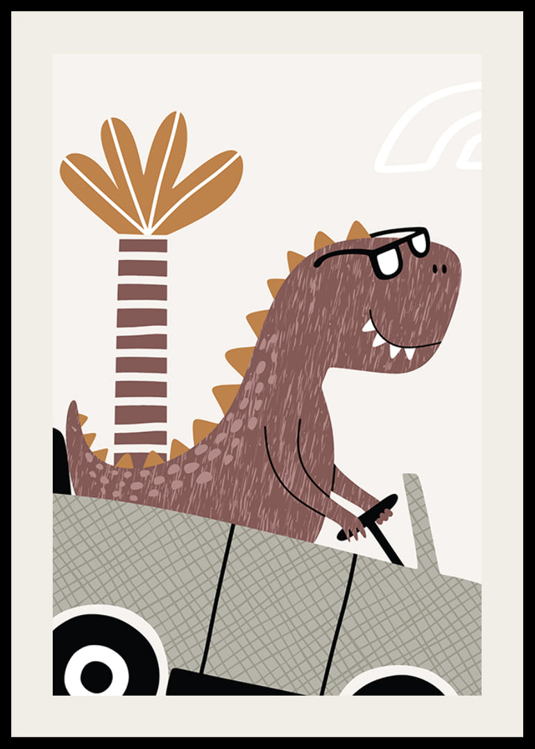 En leende brun dinosaurie med svarta glasögon sitter bakom ratten i en terrängbil mot en ljus bakgrund. Bakom dinosaurien syns en stiliserad palm och detaljerna går i jordnära färger som brunt och beige. Denna poster ger en lekfull känsla till barnrummet och passar både ensam eller tillsammans med andra motiv ur serien.