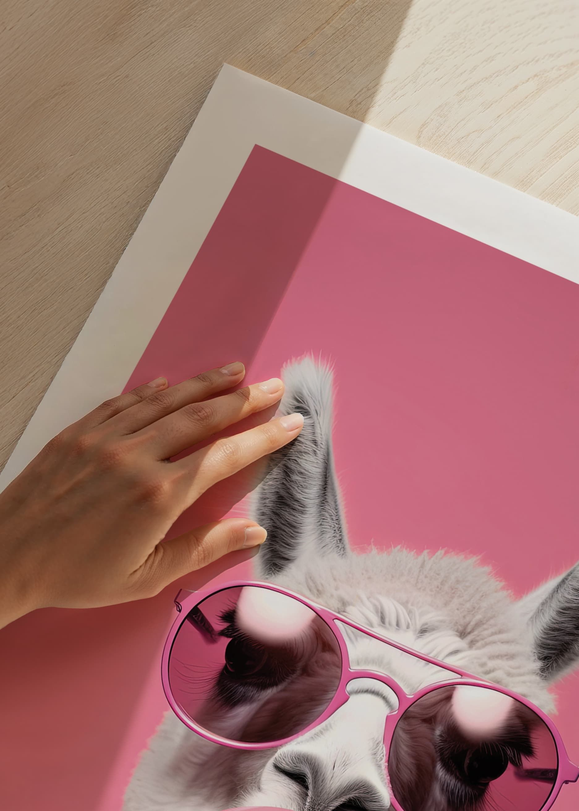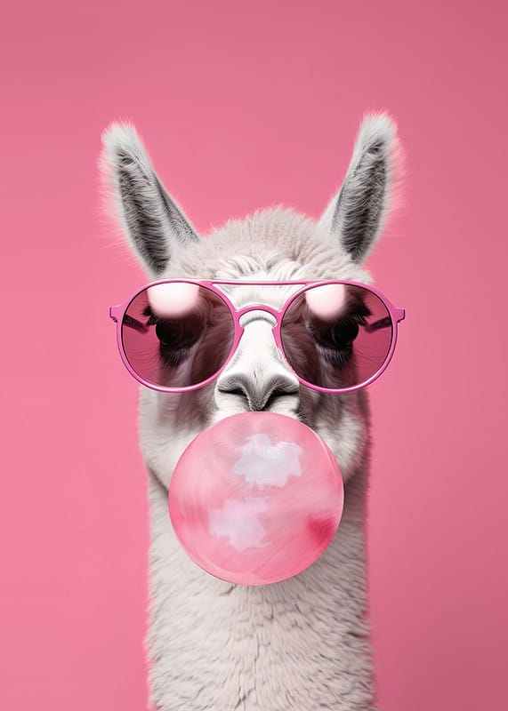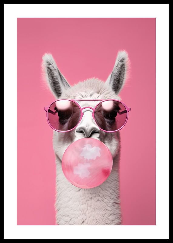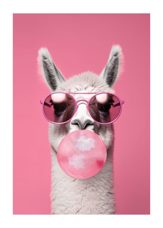 Vit lama med uppmärksam blick bär stora rosa solglasögon och blåser en bubbla av bubbelgum mot en helt rosa bakgrund. Lekfullt motiv i illustration med tydliga kontraster mellan djuret och den enfärgade bakgrunden. Denna poster passar i allt från barnrum till vardagsrum där en lättsam stämning önskas.