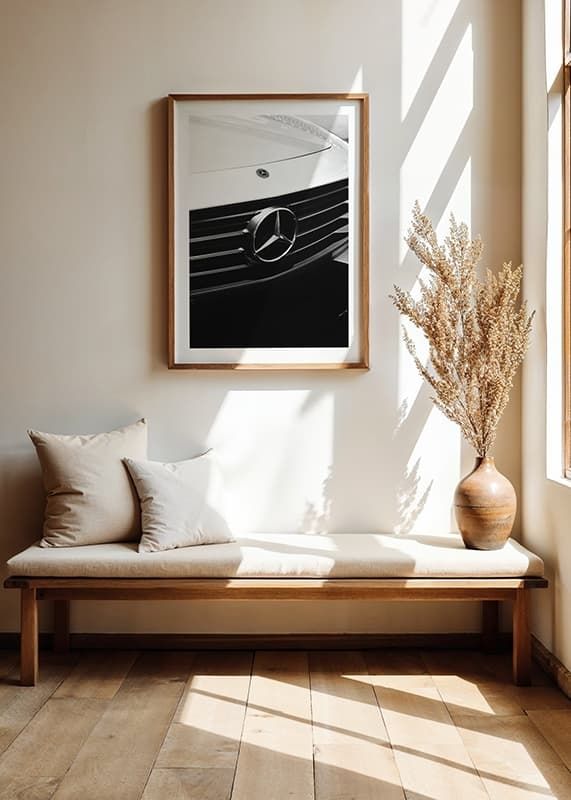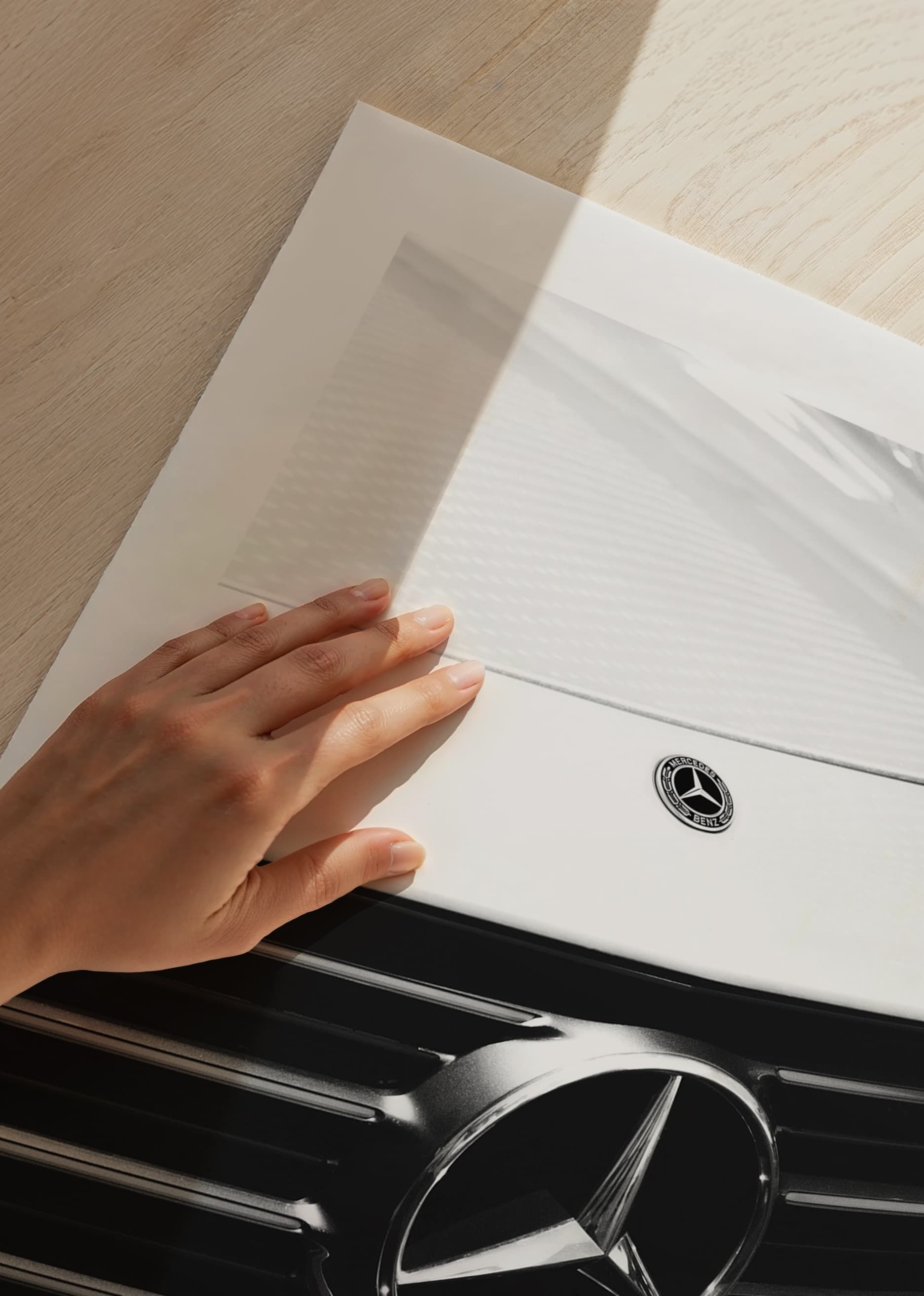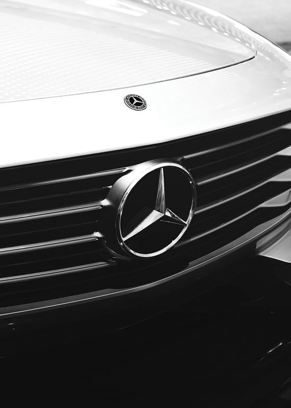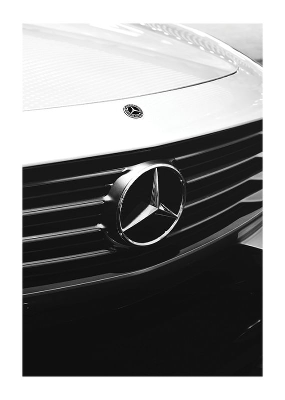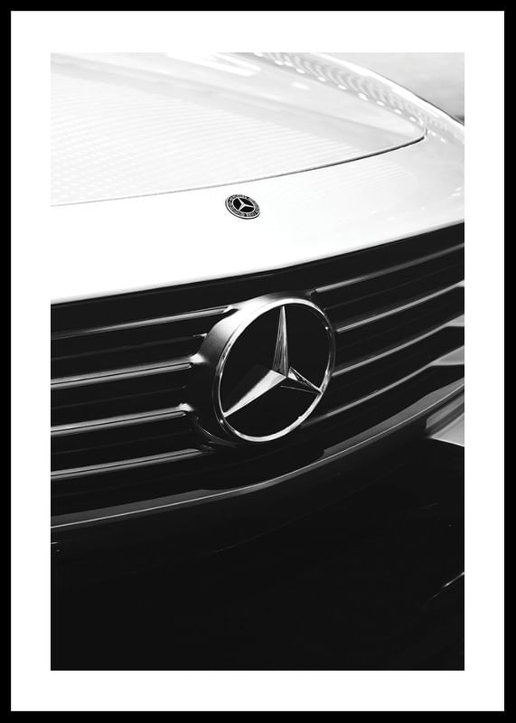 Närbild av fronten på en Mercedes-Benz i svartvitt, där det klassiska stjärnemblemet framträder tydligt mot de horisontella linjerna i grillen. Kontrasten mellan metalliska ytor och skuggor ger motivet ett stilrent uttryck. Passar väl i garage, kontor eller som detalj i ett modernt rum och blir en intressant poster för bilentusiaster.