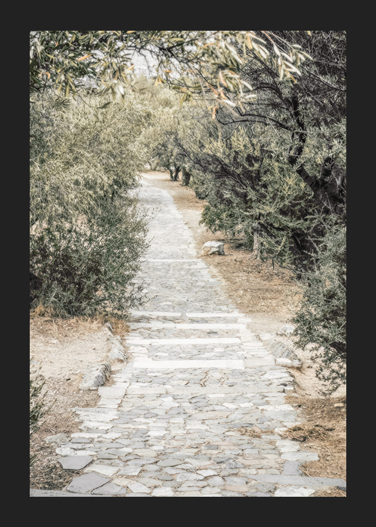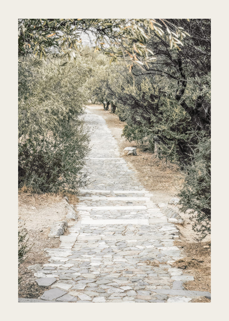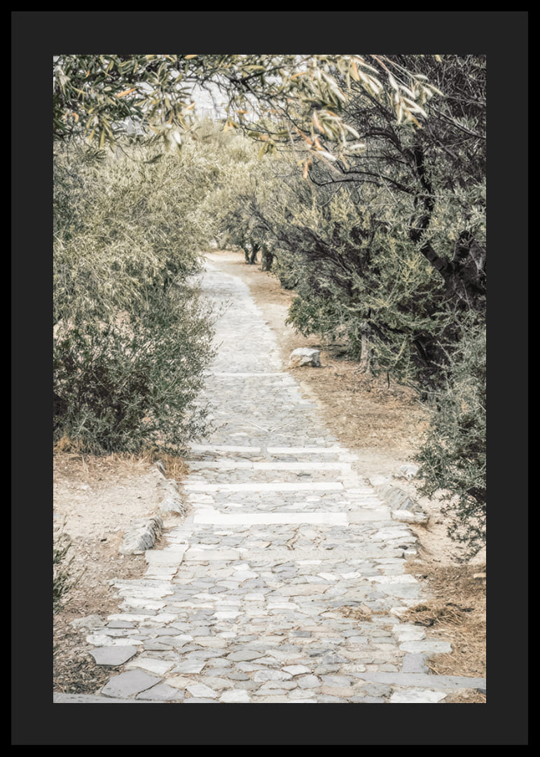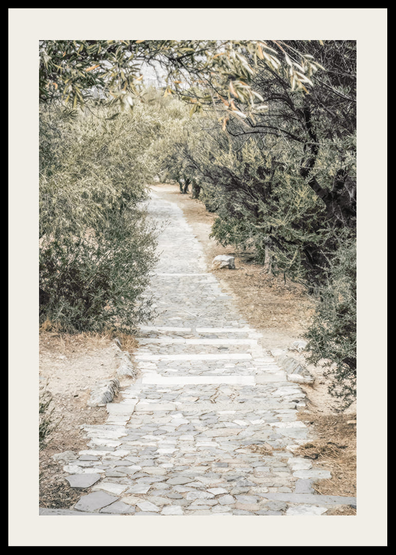 Stenlagd gång leder genom en trädgård med täta olivträd på båda sidor. Grönskan bildar ett mjukt ljusspel mot den ljusa stenvägen och de torra jordtonerna runt omkring. Motivet skapar en sydländsk känsla och fungerar fint i rum där man vill förstärka en avslappnad atmosfär med en naturlig poster.