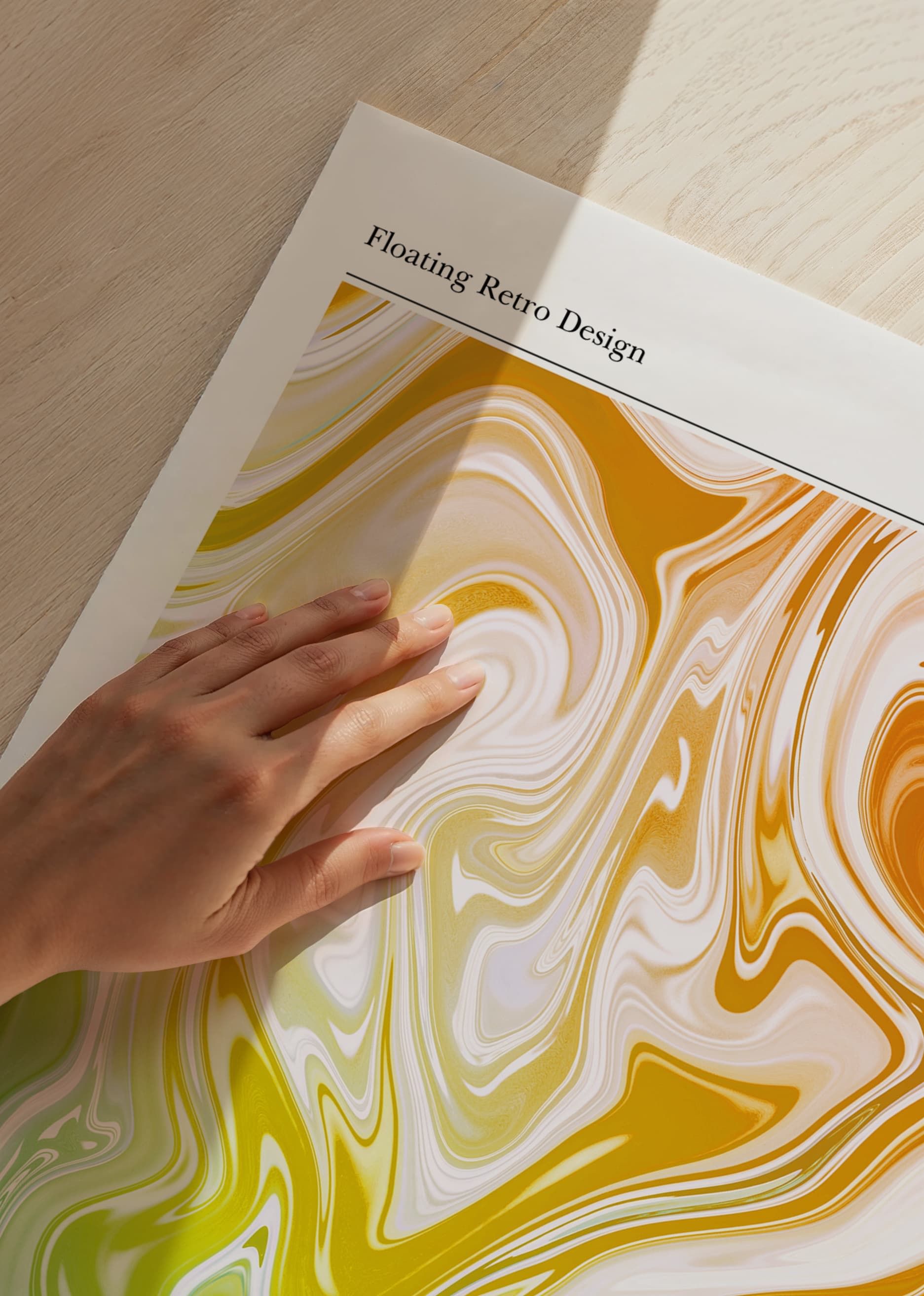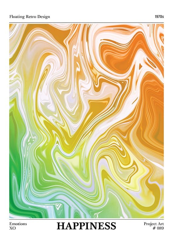 Abstrakta färgvirvlar i gult, orange och grönt breder ut sig över hela motivet och skapar ett flytande intryck med mjuka övergångar. Små inslag av vitt ger lätthet och rörelse. Denna poster ger en lekfull och energigivande känsla till arbetsrum, hall eller kreativa miljöer.
