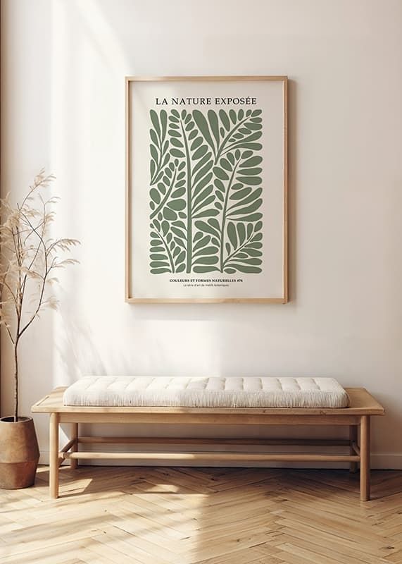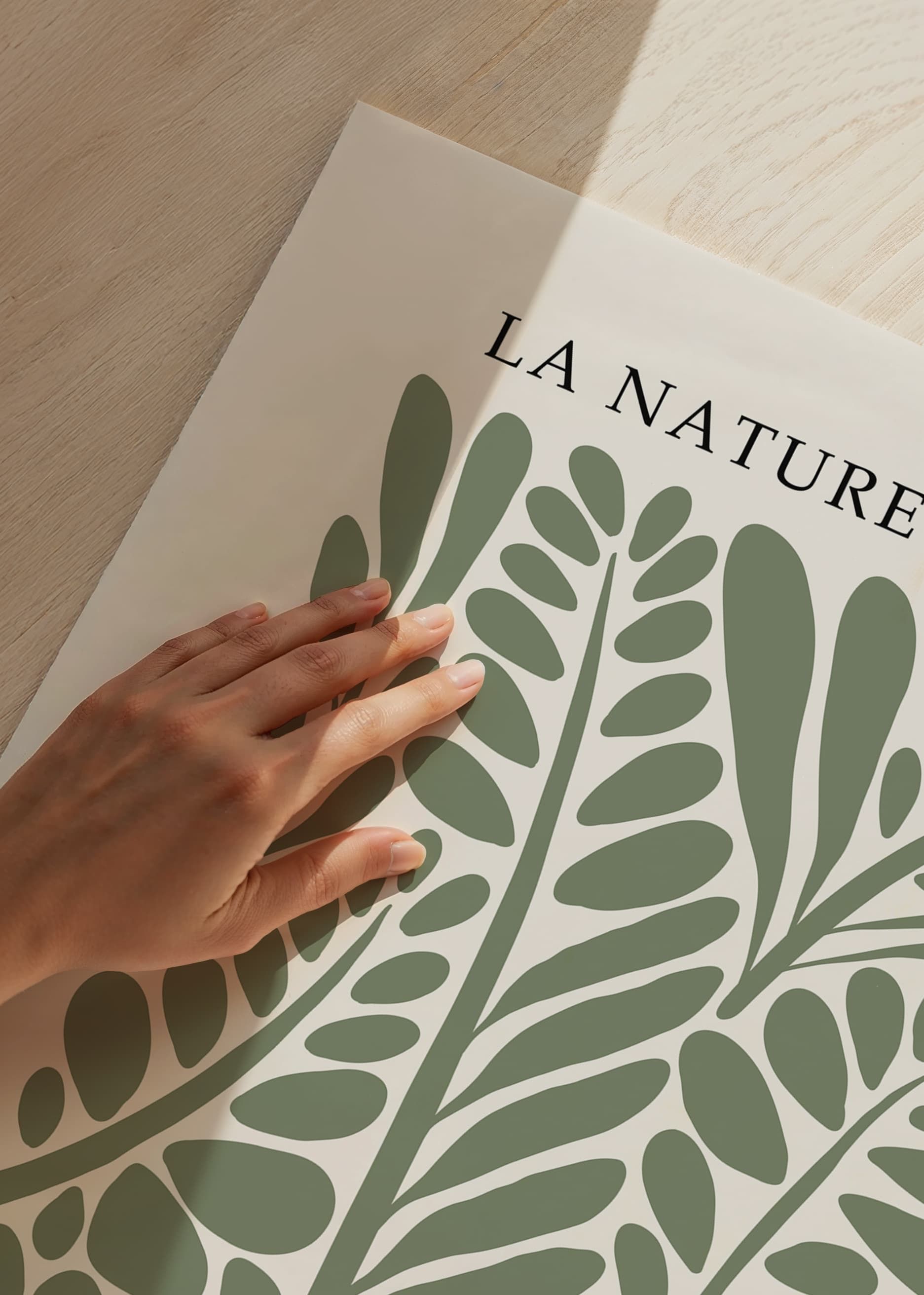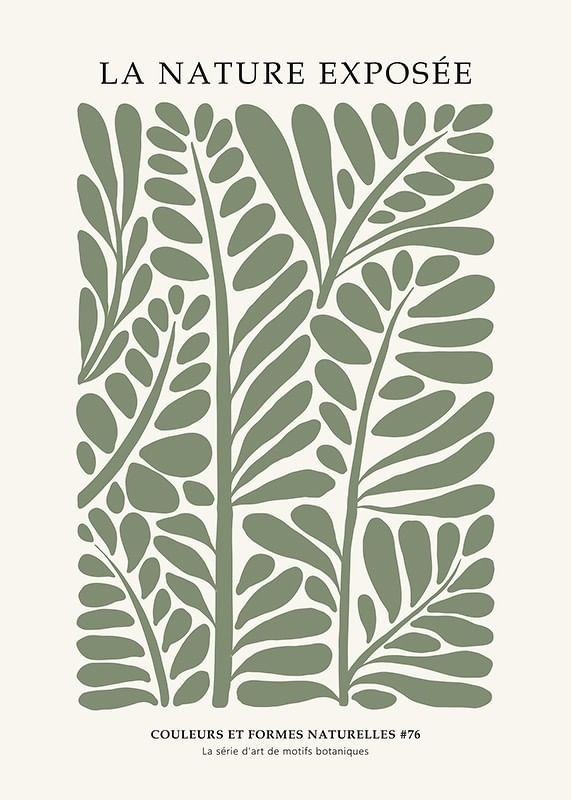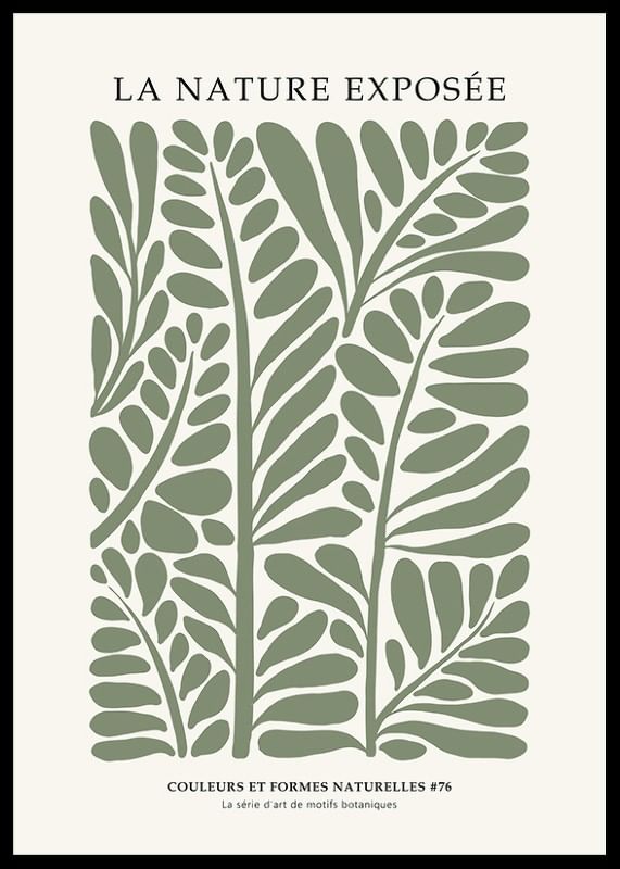 Motivet består av stiliserade blad i mjuka gröna toner, arrangerade i ett geometriskt mönster mot en varm beige bakgrund. En modern, grafisk känsla präglar designen och skapar ett luftigt uttryck. Passar i både vardagsrum och sovrum när du vill addera en naturnära känsla. Postern harmoniserar väl med skandinavisk inredning.