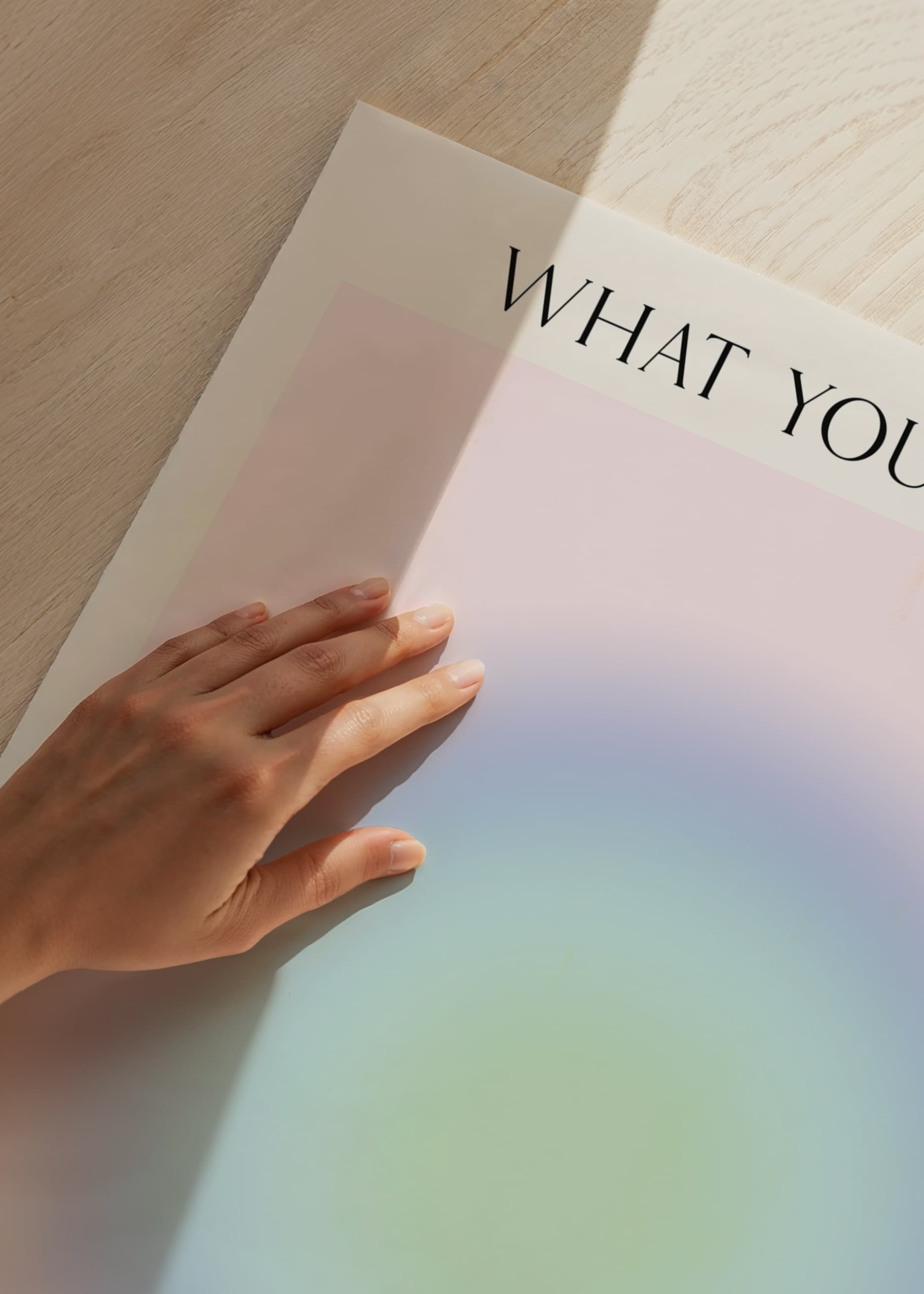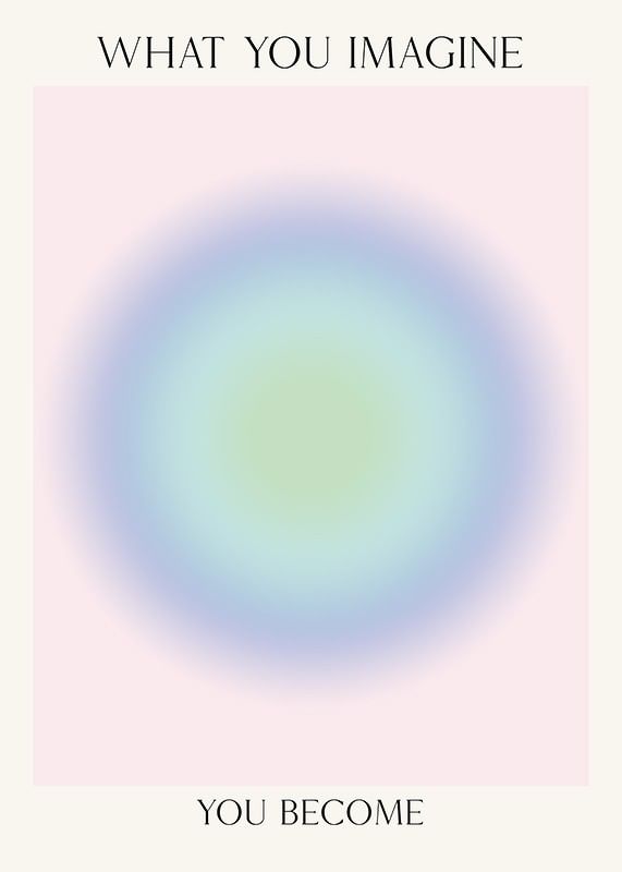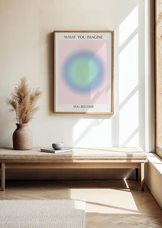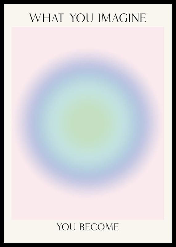 Centrerad cirkelform i mjuka pastellnyanser av grönt, blått och lila mot en ljus, nästan beige bakgrund. Ovanför och nedanför motivet syns texten 'What you imagine you become' i svart, smal stil. Denna poster bidrar med ett lugnt och reflekterande uttryck, lämplig för arbetsrum eller sovrum.