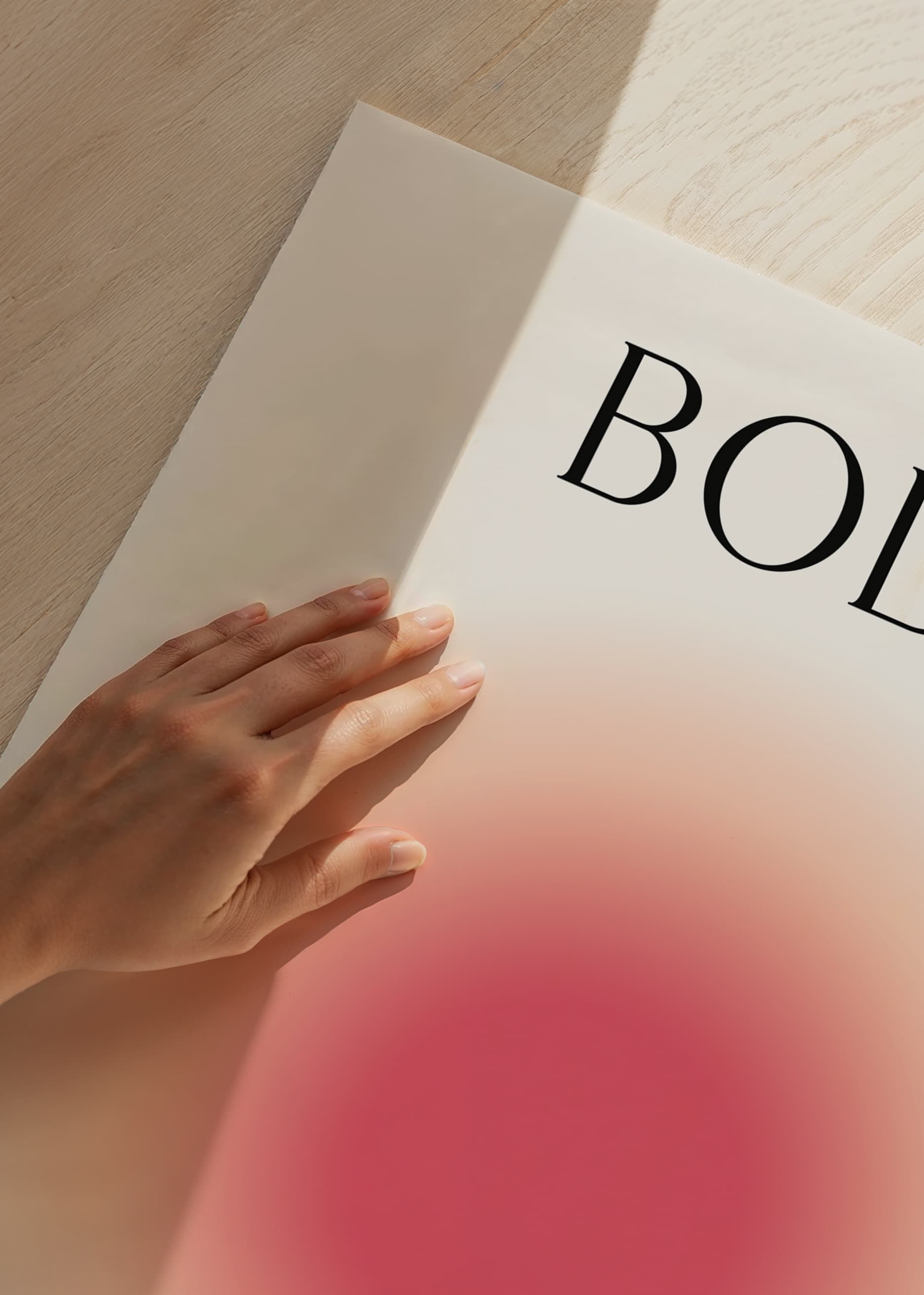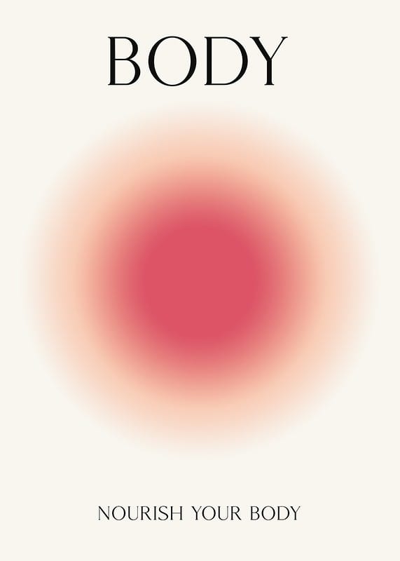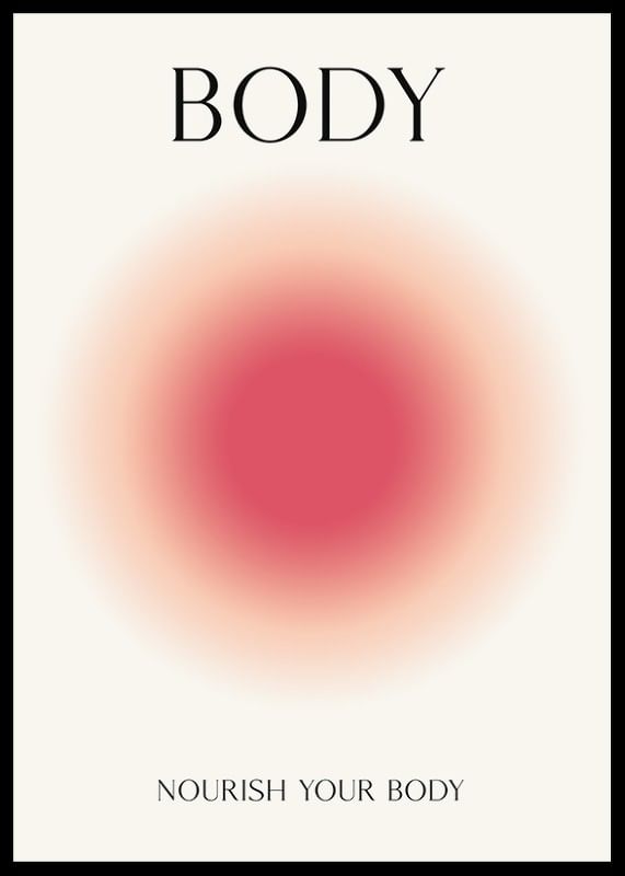 Motivet består av en central röd cirkel med mjukt övergående kanter, omgiven av varma nyanser mot en vit bakgrund. Överst syns ordet BODY medan nederdelen har texten NOURISH YOUR BODY. Denna poster kombinerar grafisk enkelhet med fokus på kropp och välmående och passar fint i träningsrum eller hall.