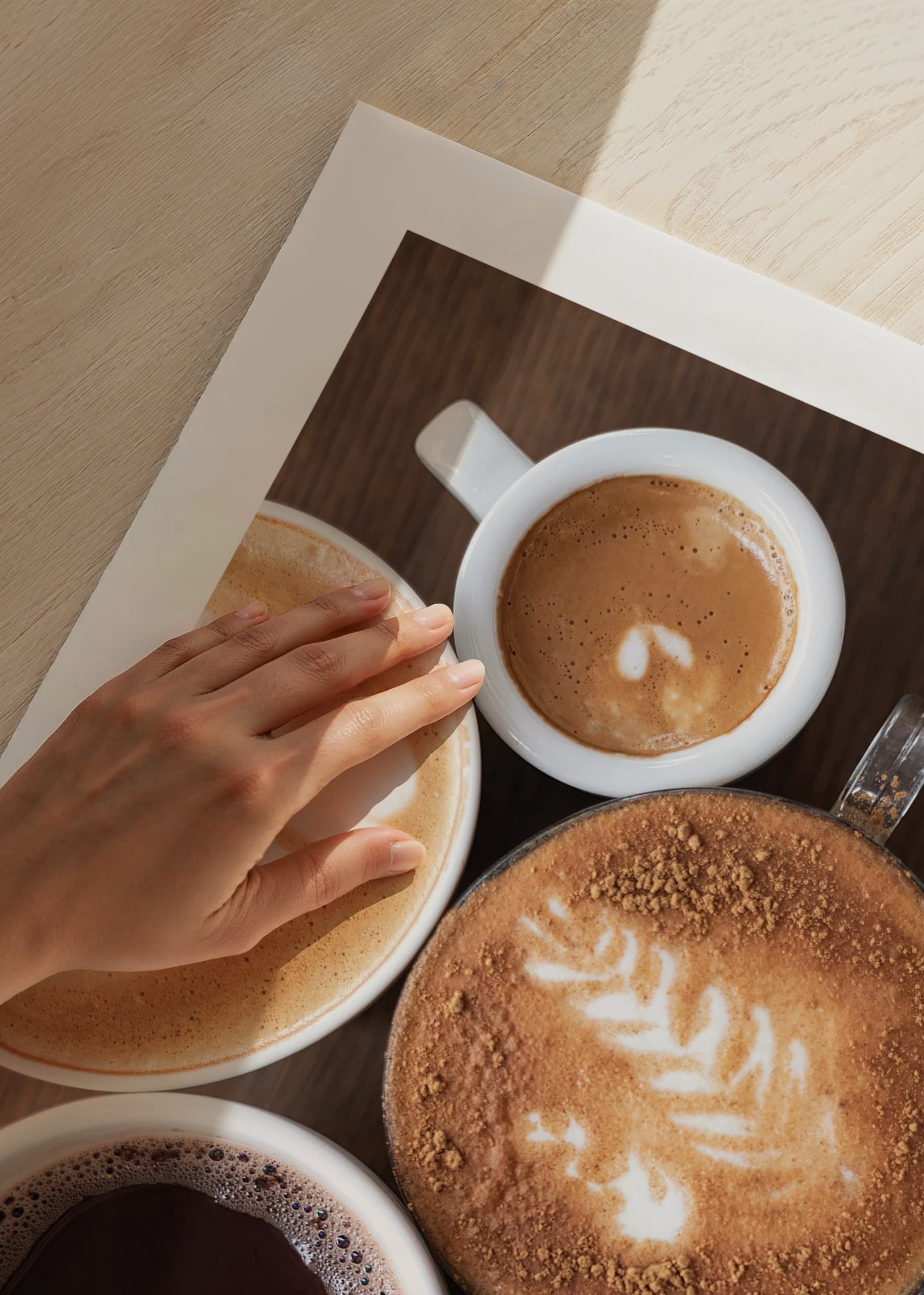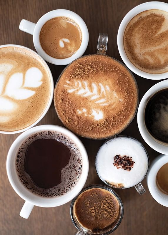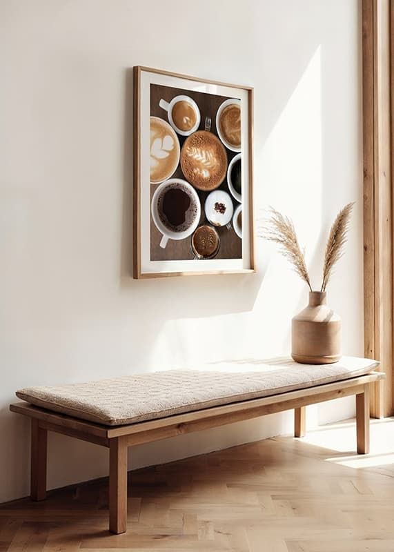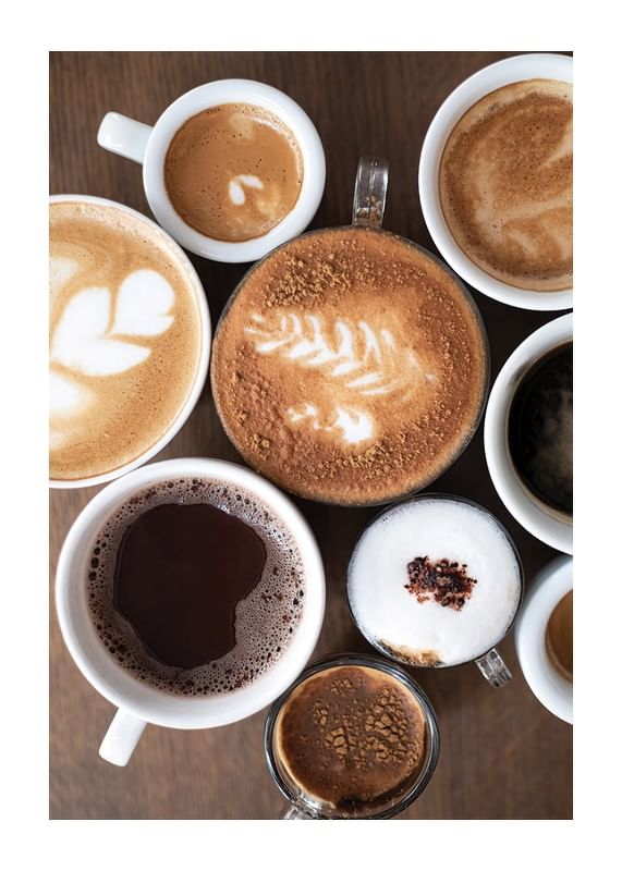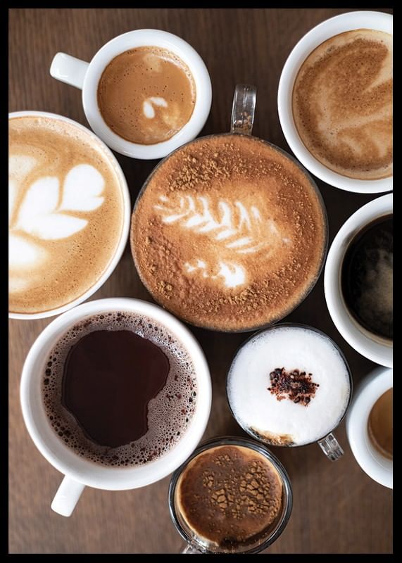 Olika kaffedrycker i vita koppar ses ovanifrån, där mjölkskum, latte art och mörk crema skapar variation i färg och textur. Rundade former och varma bruna toner dominerar motivet, vilket gör denna poster till ett smakfullt inslag i kök eller matplats där kaffe och gemenskap står i fokus.