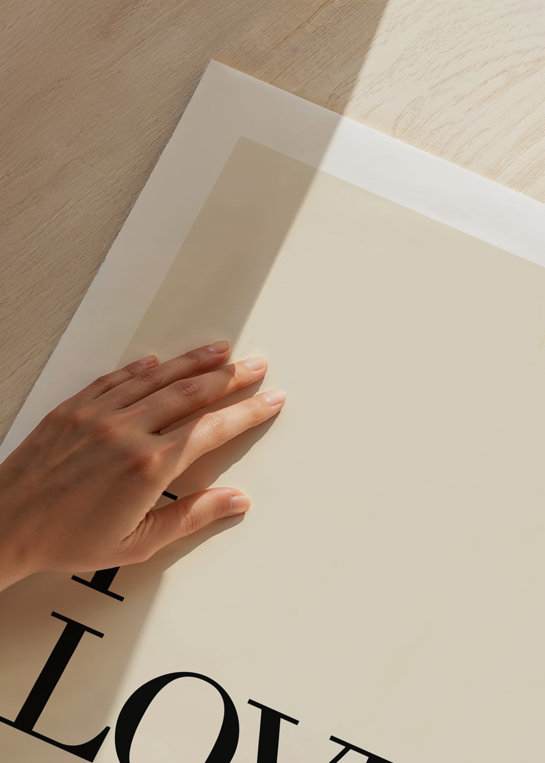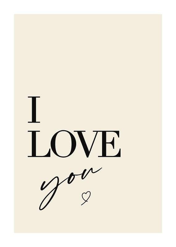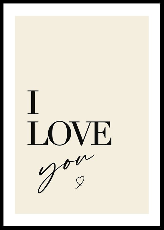 Stora svarta bokstäver bildar orden I LOVE you mot en varm sandfärgad bakgrund, där kärleksbudskapet kompletteras av ett litet handritat hjärta nedanför texten. Den minimalistiska designen och det rena uttrycket gör att postern passar både i sovrum och sociala rum där en personlig och vänlig känsla önskas.
