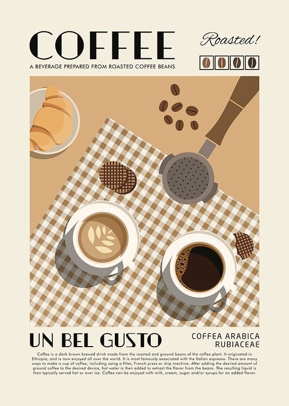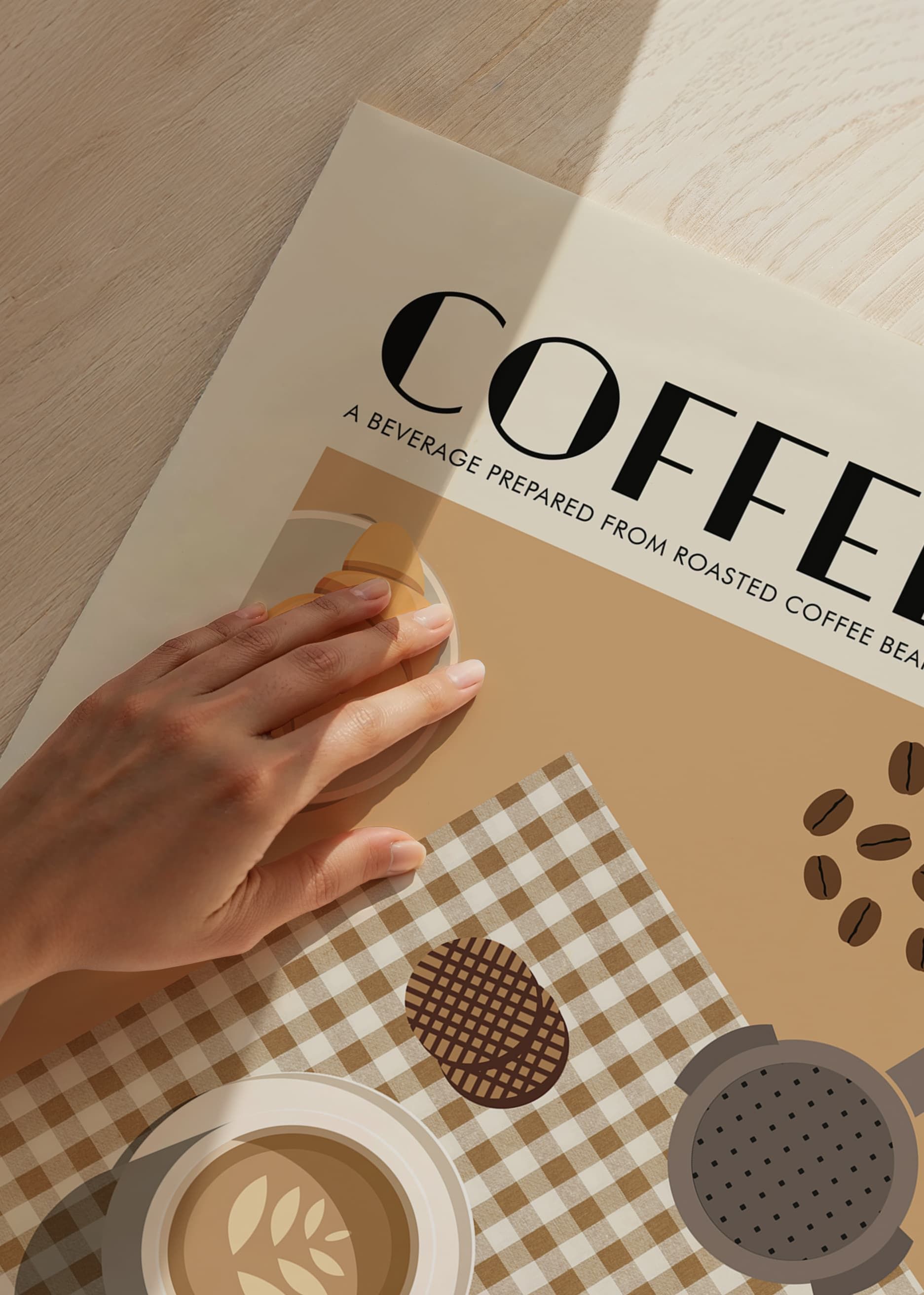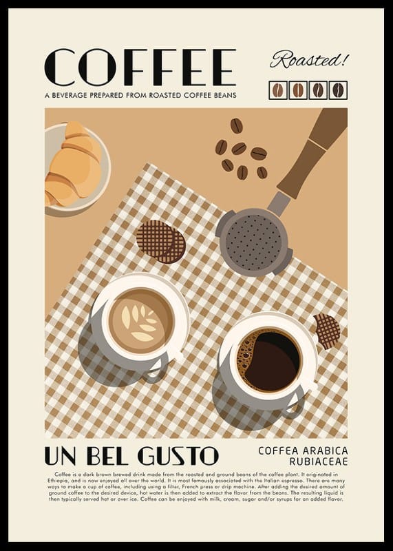 Motivet består av två kaffekoppar, en med latte art och en med svart kaffe, placerade på en rutig duk. Omgivna av kaffebönor, portafilter, croissant och chokladbit skapas en varm och inbjudande scen i brunbeige toner. Denna poster passar fint i köket eller vid din kaffehörna för en känsla av vardagsritual.