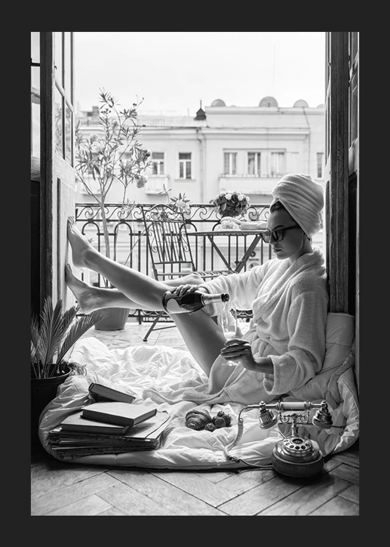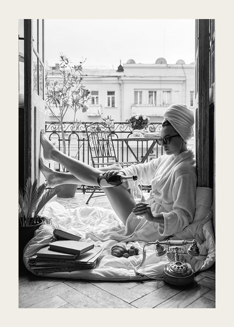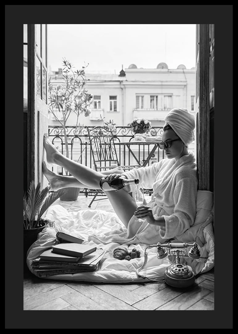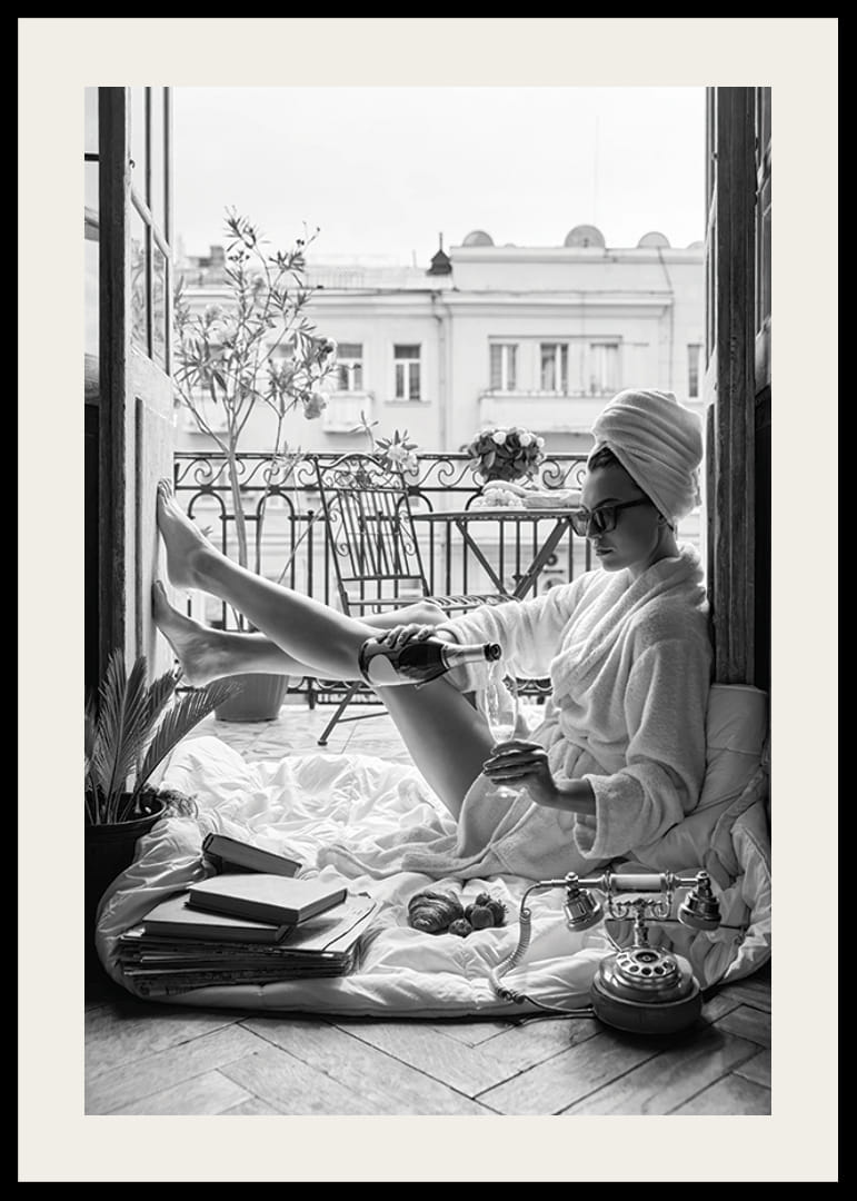 En kvinna i morgonrock och handduk runt håret sitter på en balkong med öppna dubbeldörrar, omgiven av böcker, frukost och en klassisk telefon. Solglasögon och urbana byggnader i bakgrunden förstärker den urbana känslan. Den svartvita poster skapar en stilren atmosfär i vardagsrum eller hall.