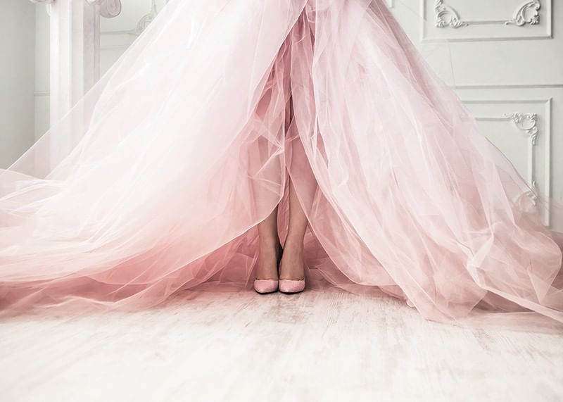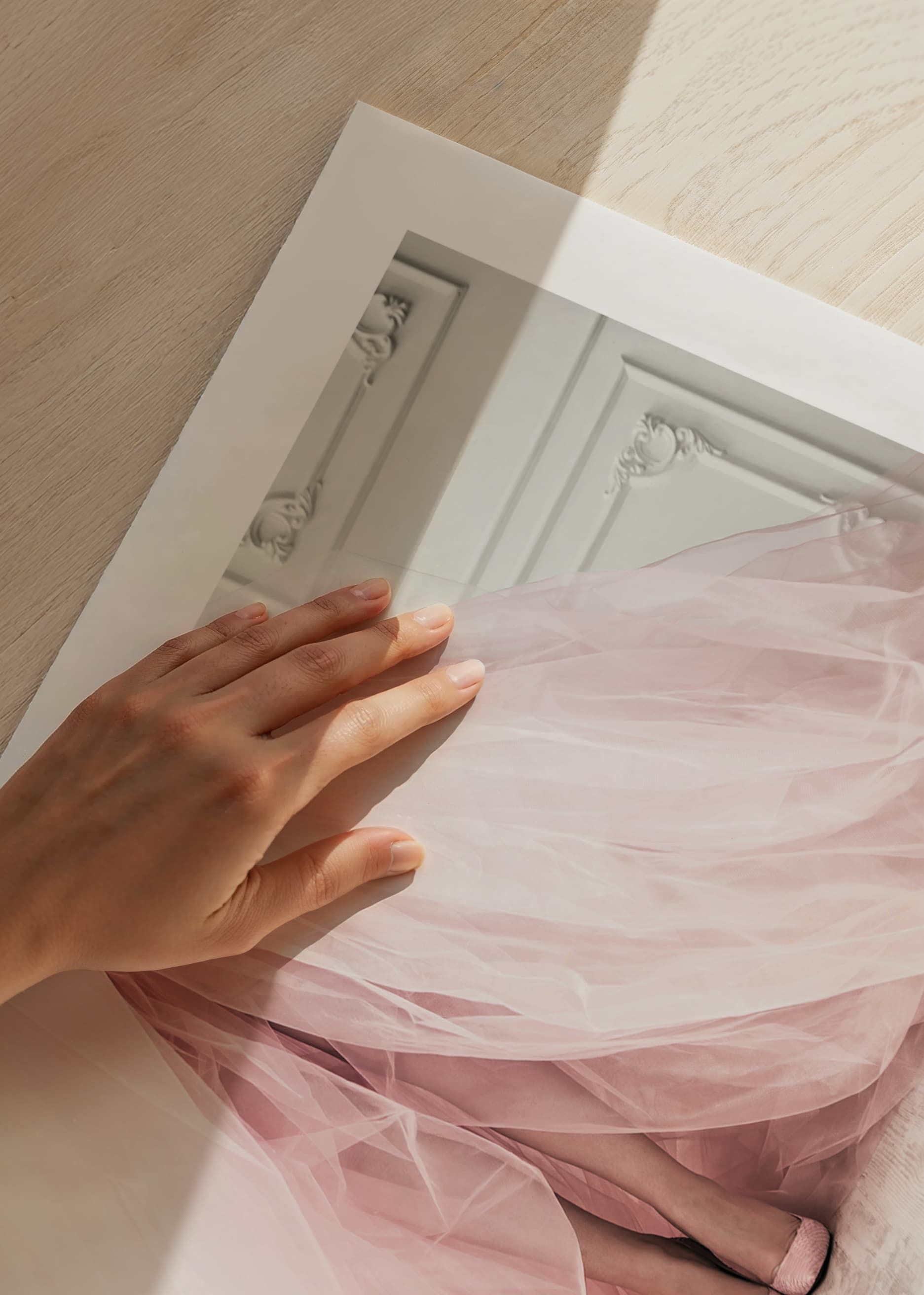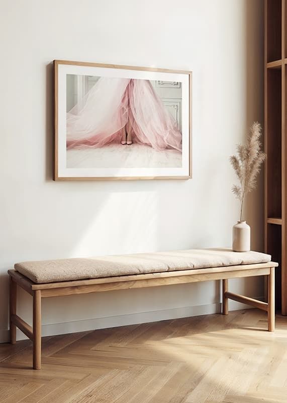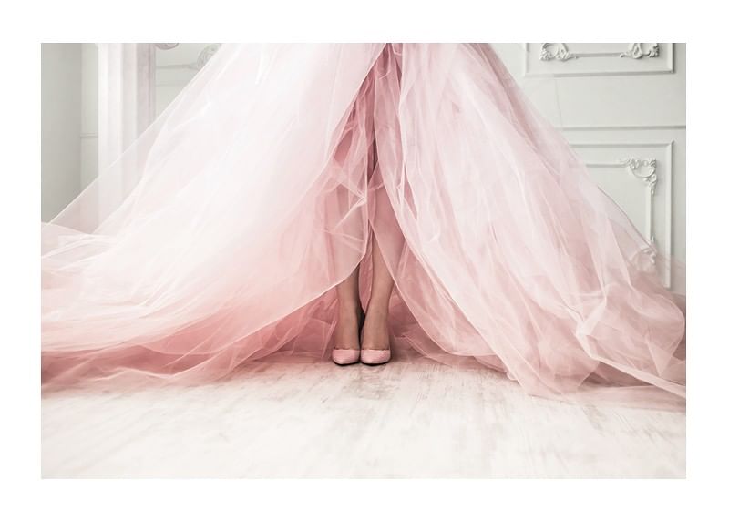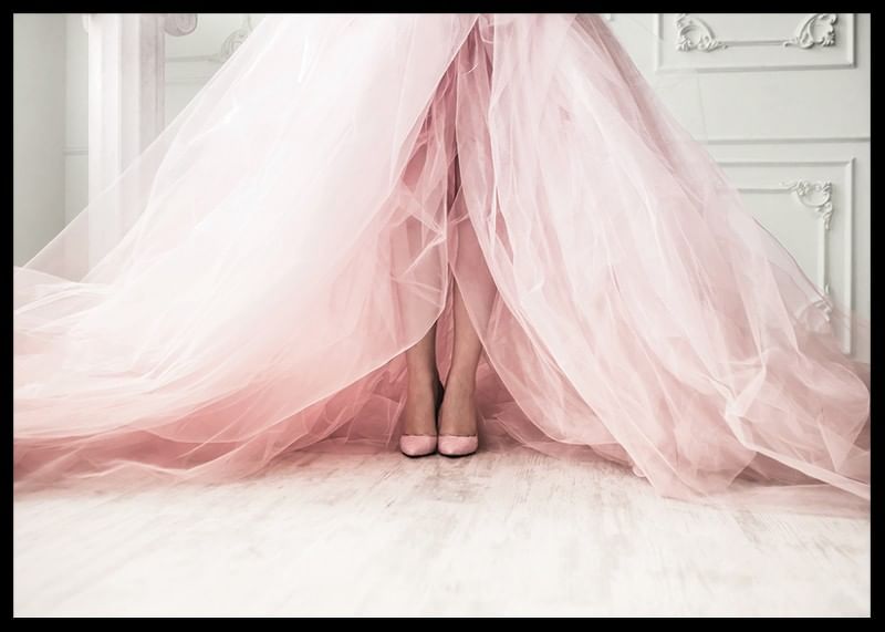 Mjuka tylllager i ljusrosa toner sveper ut över ett ljust trägolv, där kvinnoben med matchande skor syns under den vida klänningen. Klassiska väggpaneler skapar en stilren bakgrund. Den här postern ger rummet en modern känsla av mode och passar särskilt bra i sovrum eller dressingroom.