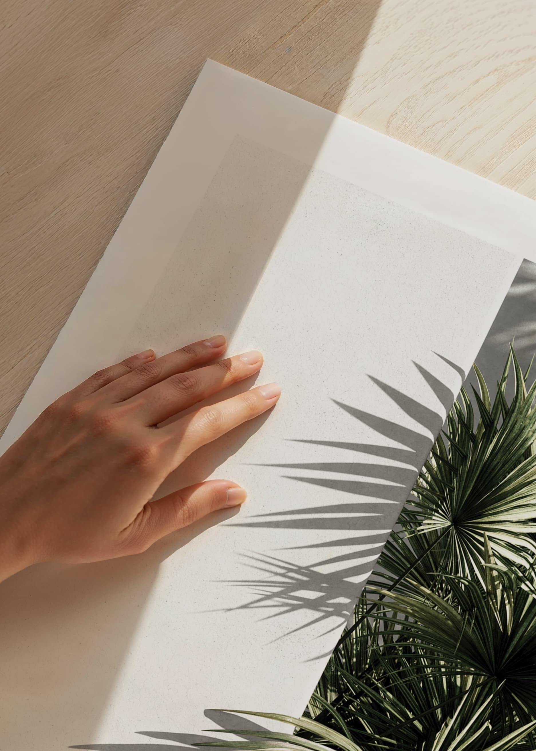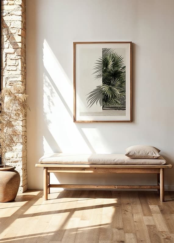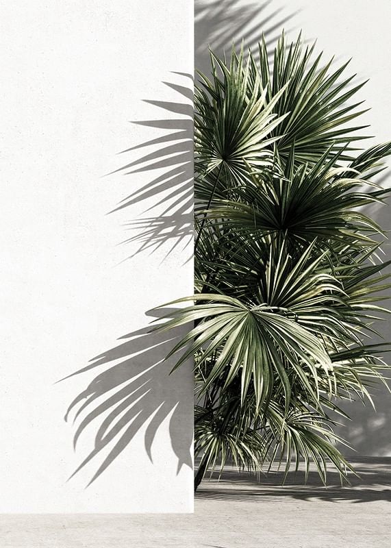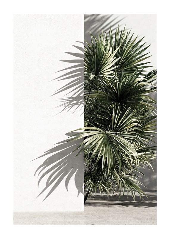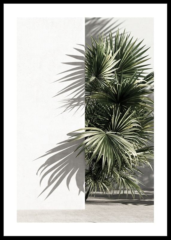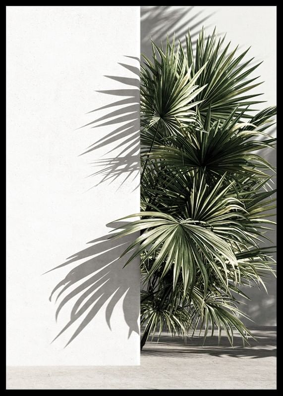 Palmblad i gröna nyanser sträcker sig mot en vit putsad vägg och bildar tydliga, grafiska skuggor på ytan. Ljus och skuggspel skapar ett modernt och luftigt uttryck med tydlig medelhavskänsla. Postern passar utmärkt i rum där naturliga element och enkelhet eftersträvas.